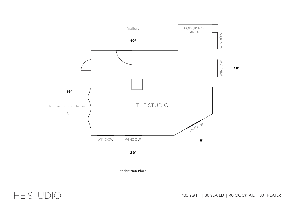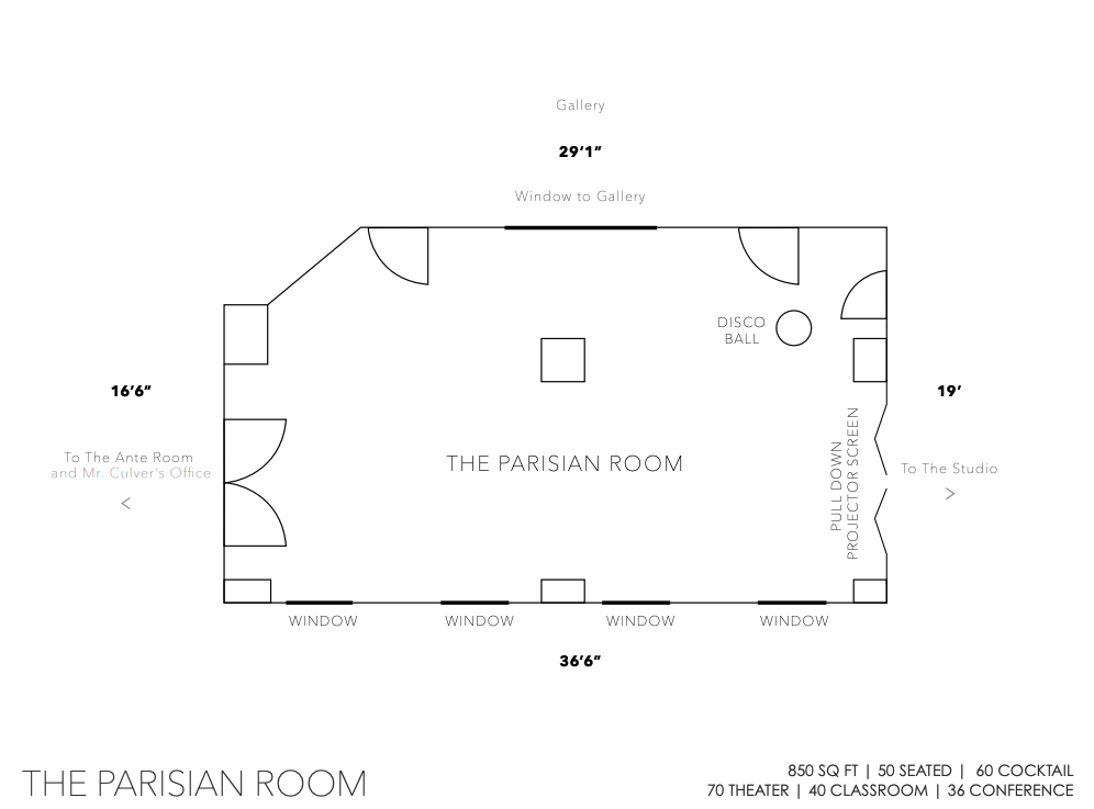 Turn of the century meets contemporary in this simple and elegant space, its décor utterly inspired by vintage Parisian loft apartments. ‘Wedding cake’ moldings take on a new meaning when blended with stark white walls and an artful herringbone reclaimed wood floor. Large windows allow for plenty of sunlight, fresh air and a view of the Downtown Plaza and its Lion Fountain. This bright and beautiful room is located on our 2nd Floor Gallery level and connects to Mr. Culver’s office through the Ante-Room, creating the possibility of an extended area or breakout room at any time during an event. Additional amenities include wireless internet, plentiful power outlets and a projection screen. Wonderfully set up for presentations, buffet luncheons, cocktail parties and screenings, the Parisian Room is a lovely, elegant and versatile meeting and event space.