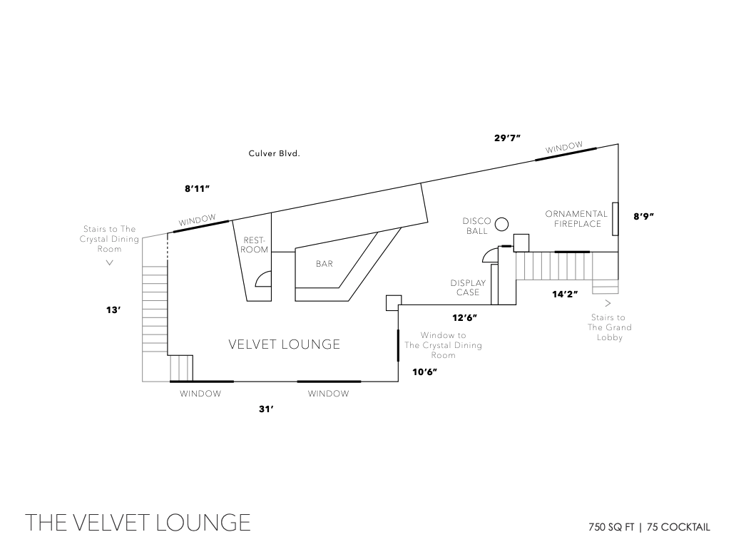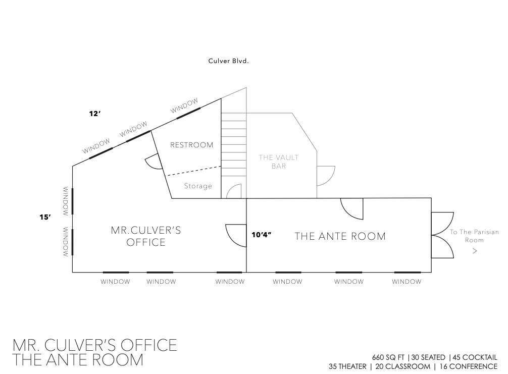 With an unusual layout and loads of charm, this special and historic room sits perfectly at the tip of our architectural Flatiron and often used for smaller and more intimate functions. A multitude of French windows and a classic black and white palette complement the original hand-milled coffered ceilings. Our City founder’s original office is discreetly located at the rear of our 2nd floor Gallery level and features its own Ante-Room, an ideal area for food and beverage or registration set up. The Ante-Room also connects Mr. Culver’s office to our lofty and elegant Parisian Room, creating the possibility of a larger layout if needed at any time during an event. From boardroom meetings to creative workshops, this historically significant space has also been used as a private room for brides and their ladies-in-waiting as they prepare for the big moment. Additional amenities include wireless ethernet connection plentiful power outlets and a projection screen.