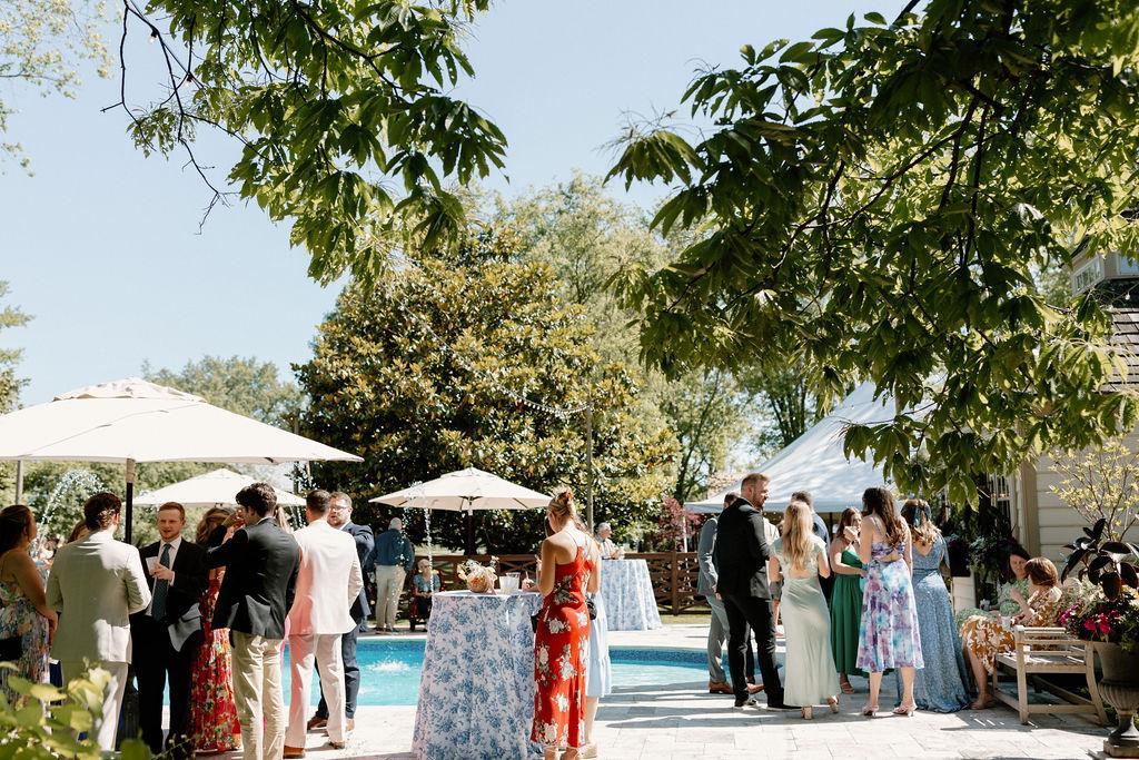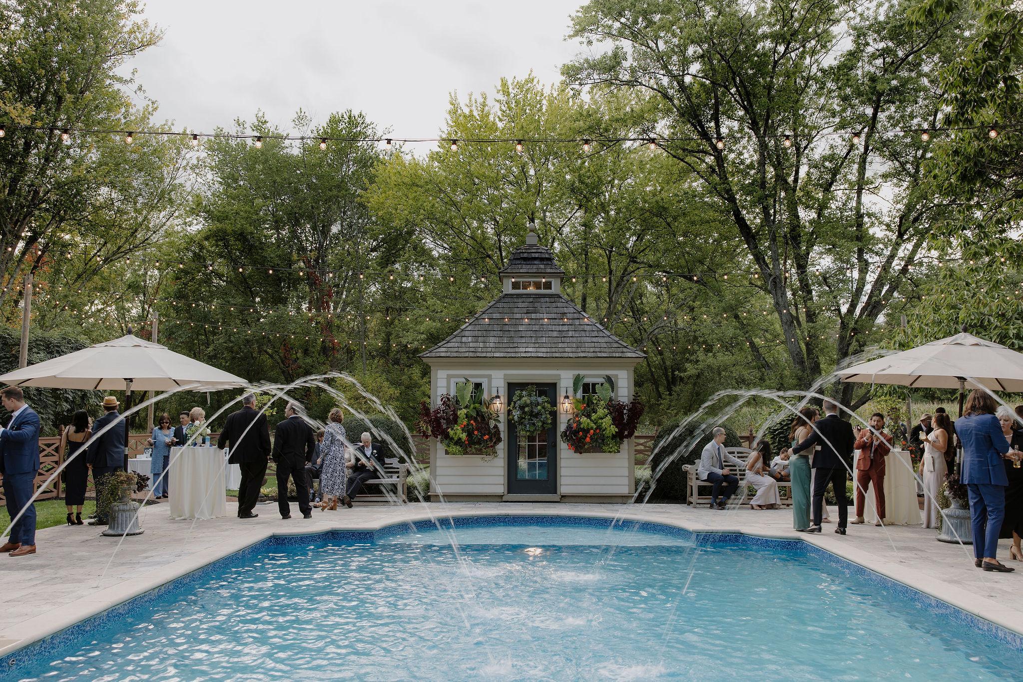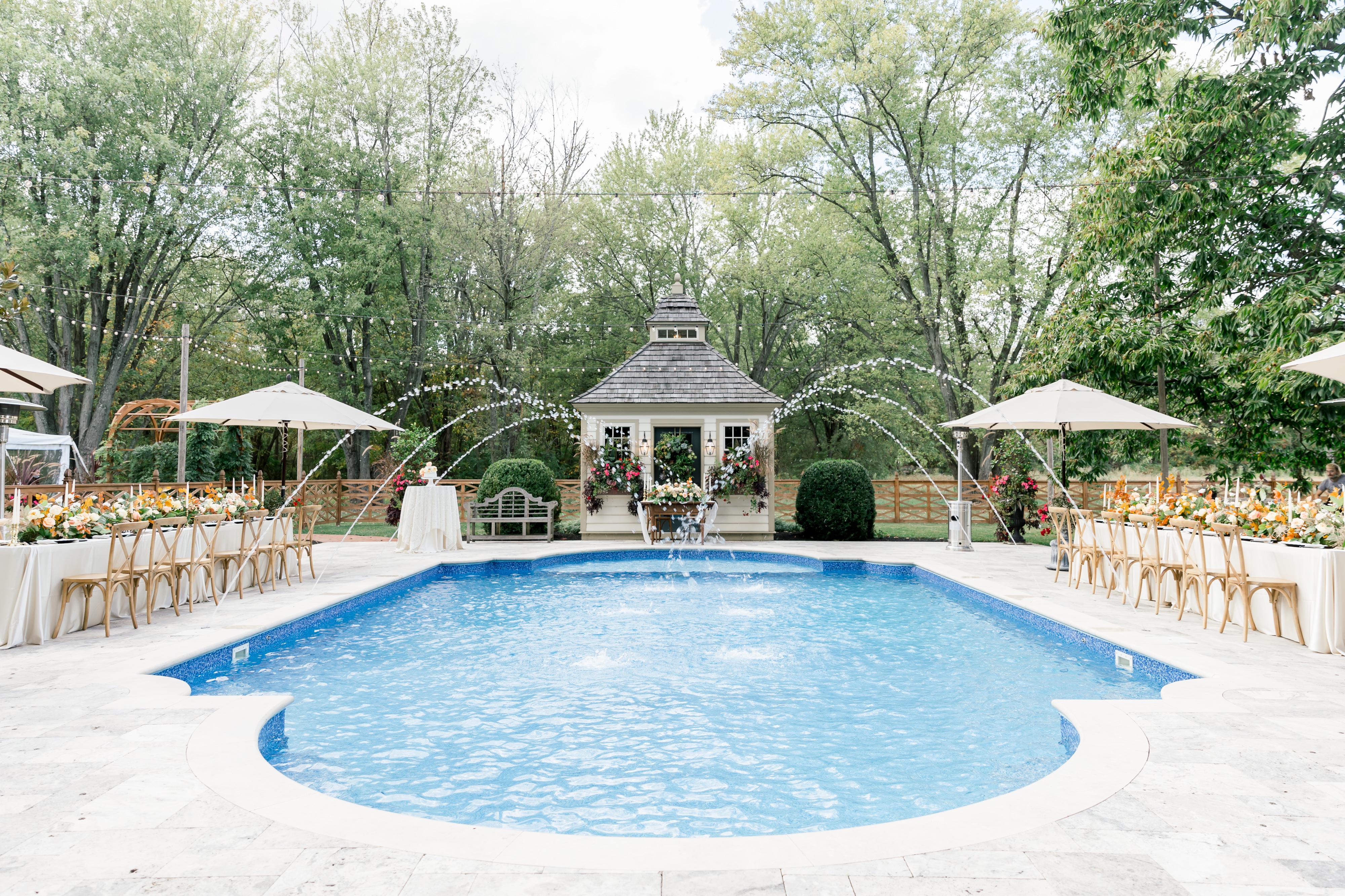 For Cocktail Hour, we recommend our Pool Terrace, complete with fountains which make a dreamy spot to celebrate. The area is adorned with romantic string lighting, beautiful garden urns, and surrounded by a custom colonial style fence. We offer a custom cocktail bar for your use, high top cocktail tables, conversation seating, and unique patio umbrellas for your guests.