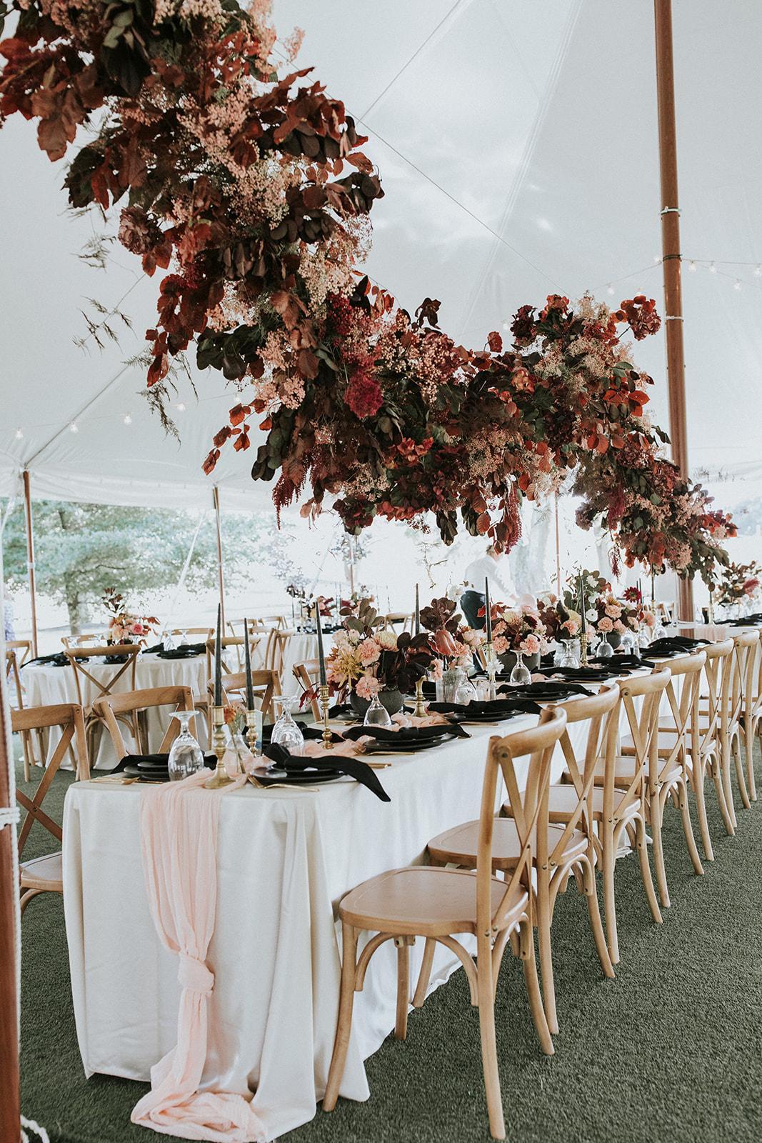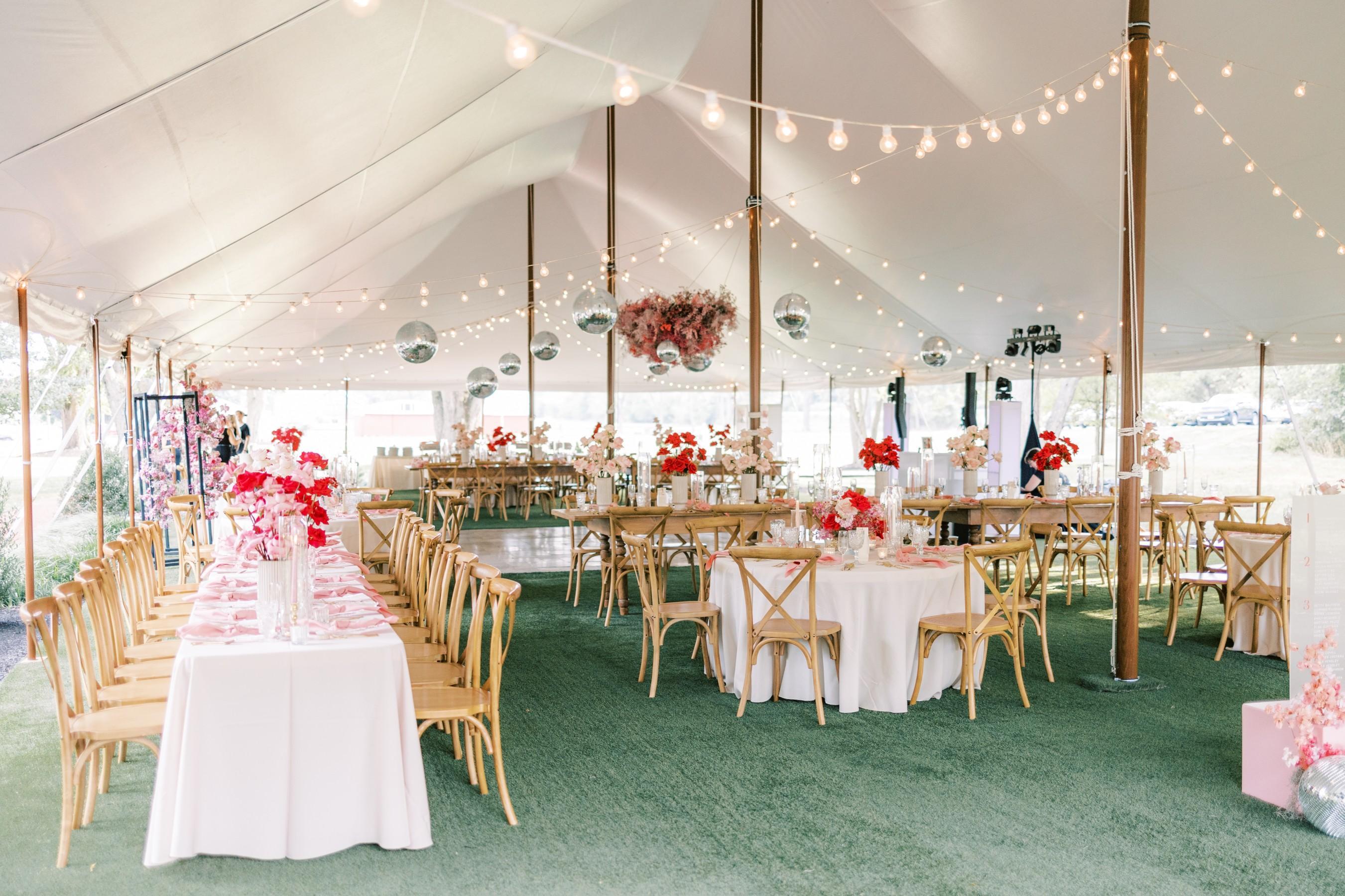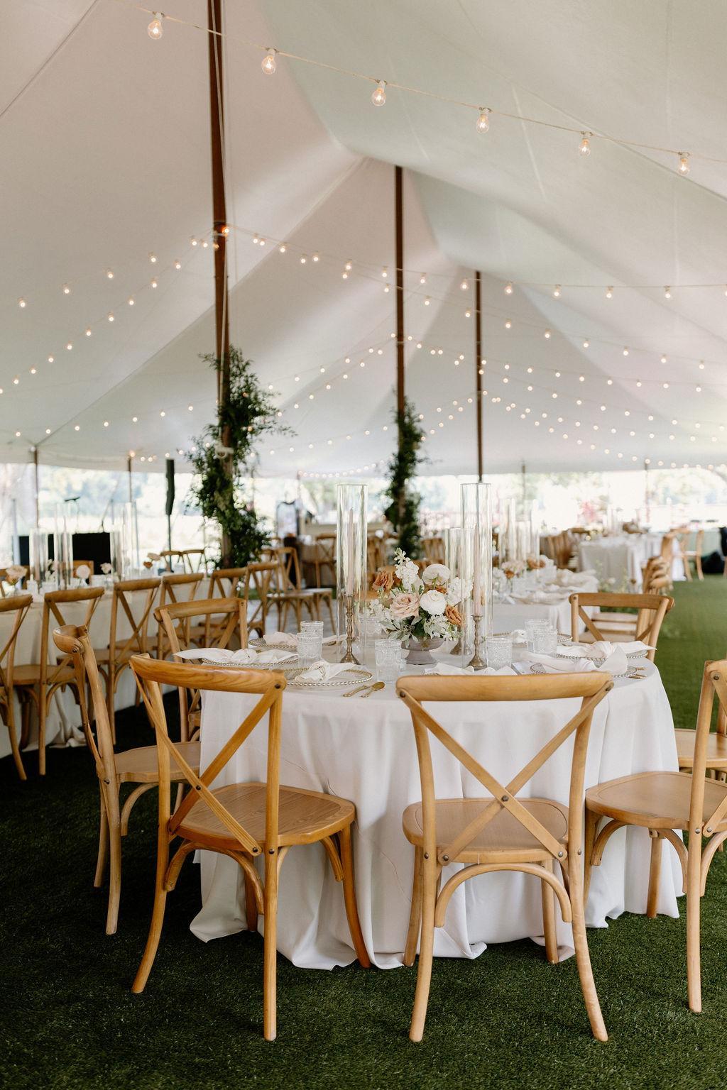Most receptions are held in our 40'x100' wood-grain pole tent, adorned with tent peak flags and romantic string lights, turf throughout, and a 20x20 travertine tile dancefloor. There is a custom built 8-foot bar included, along with fruitwood crossback chairs and all of your tables. Our Floral and Design team will help you to completely customize this space from your layout and linen choices, to table and hanging floral arrangements options.