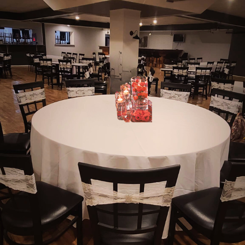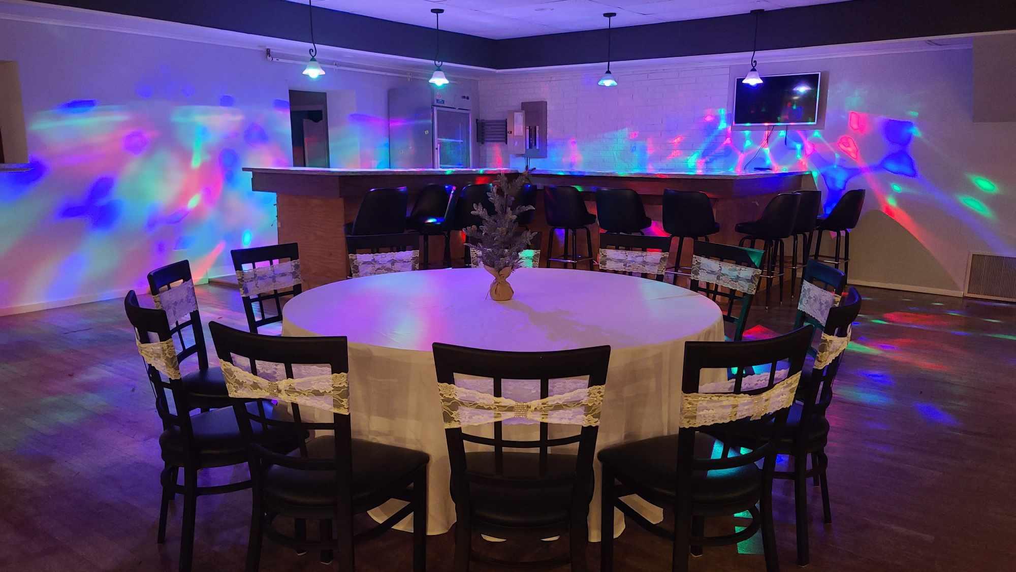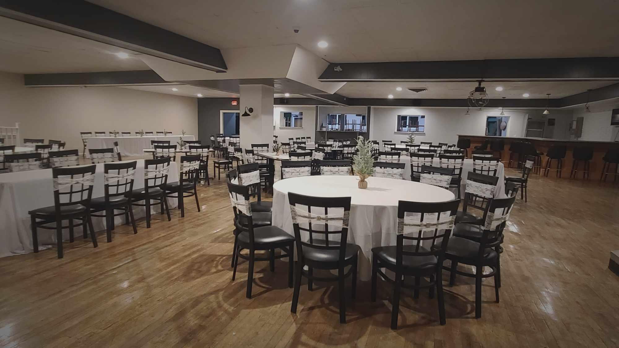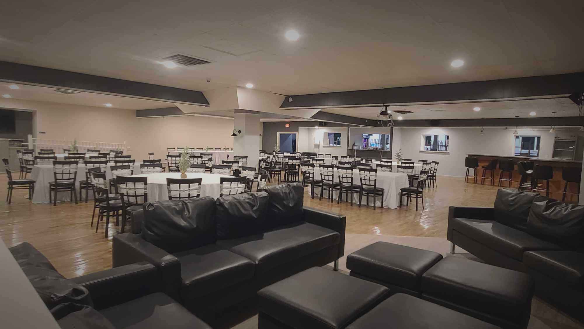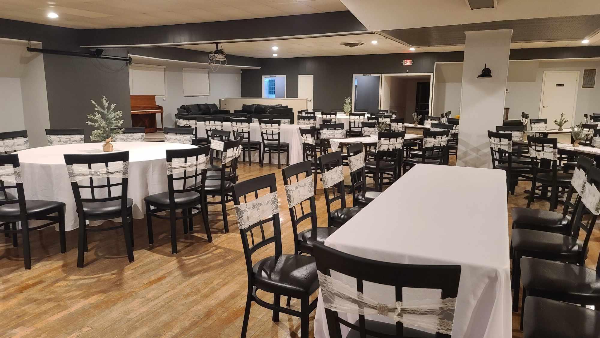 (25) 8' Banquet tables for guests (4) 72" round guest tables Black house chairs Private Restrooms Private Bar Overhead projector with screen In-house or offsite catering allowed Access from 10am-Midnight