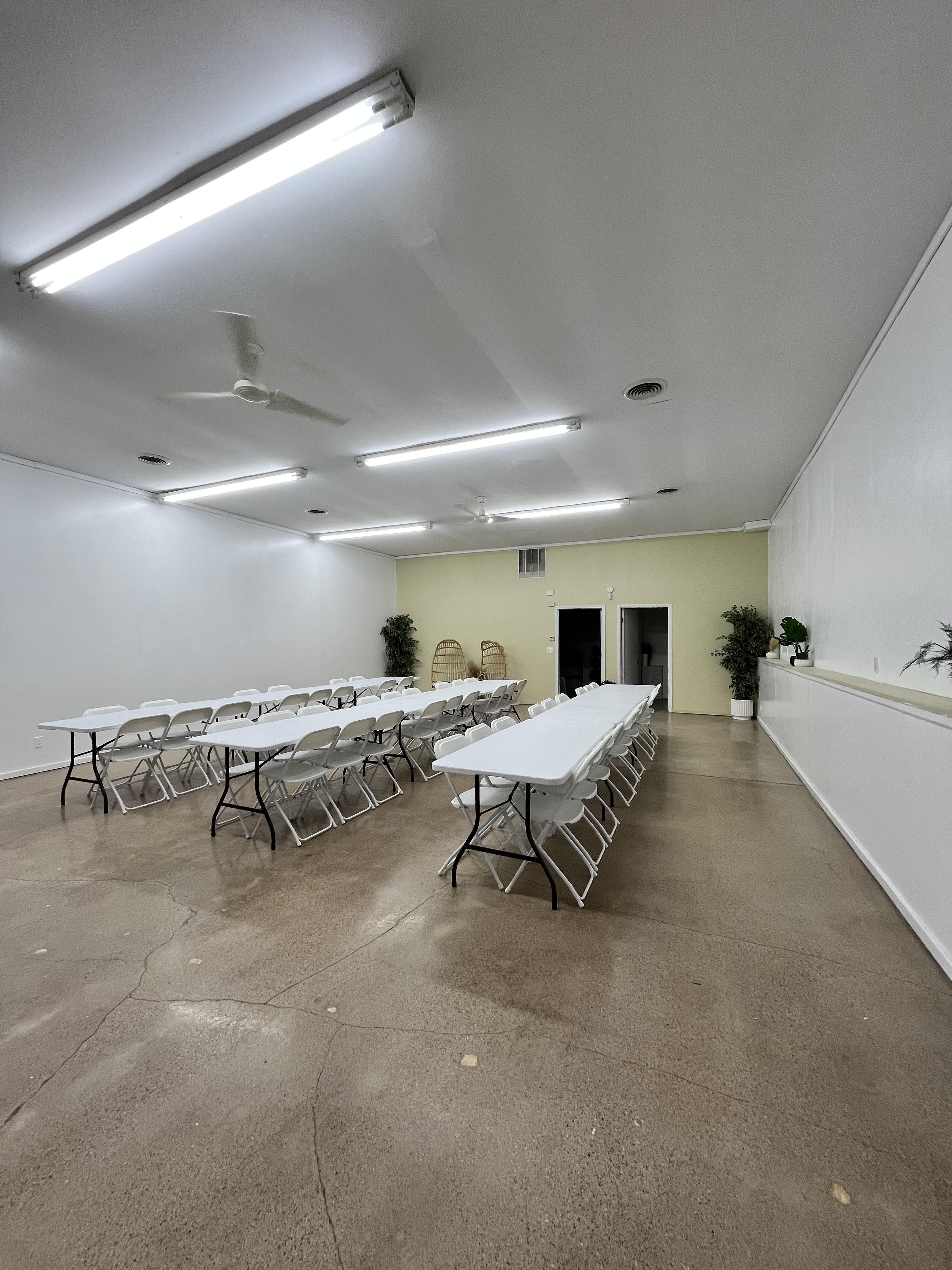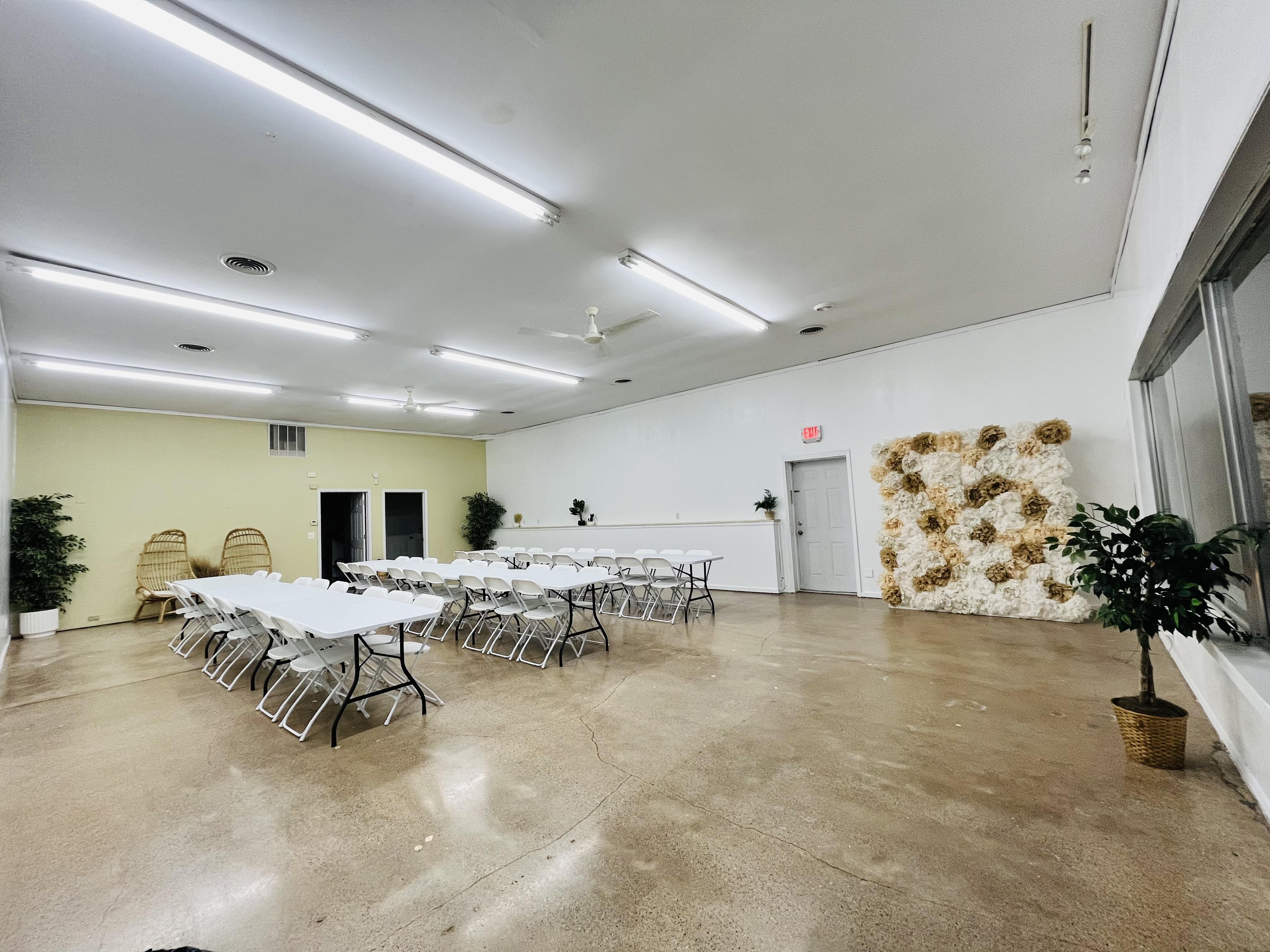 This space holds up to 50 people with tables and chairs provided. If you need extra space, check out our photography studio next door.