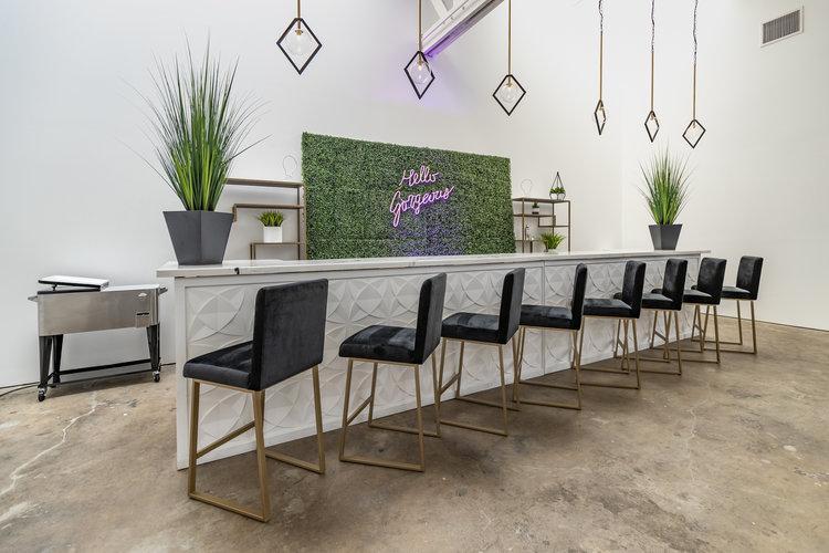 The Bar and Lounge area offers a flexible space to define your event's atmosphere. Complete with a chic, fixed bar featuring ample back-bar space for personalization (like a custom neon sign or greenery wall), this section is ready for your signature touch. The adjacent lounge grouping—featuring dark velvet textures and contemporary artwork—provides a comfortable and stylish retreat, ensuring your guests have a premium experience from arrival to last call.