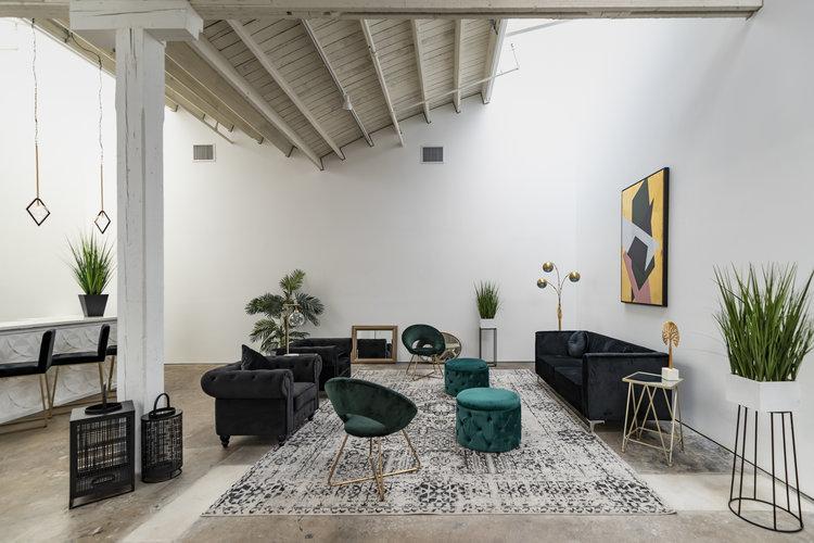 Adjacent to the main bar, the Lounge offers a stylish and comfortable retreat for your guests. Anchored by a chic, oversized area rug, the space is furnished with plush velvet sofas and accent seating in deep jewel tones, creating an atmosphere of exclusive intimacy. Ideal for casual conversation, this area maintains the venue’s industrial aesthetic while providing a luxurious pocket of comfort, perfect for escaping the dance floor hustle.