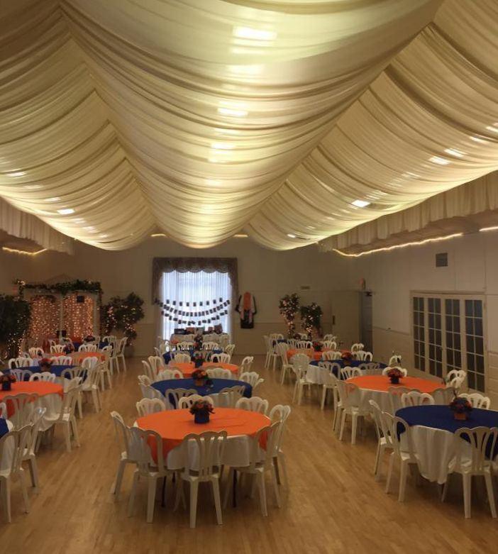 This well preserved hall built in 1937 features beautiful original hardwood floors; draped vaulted ceiling; large stage area with a pull down screen for presentations and a podium available; stage spot lighting; private bridal sitting room/bathroom; handicapped accessible entrance and bathrooms; lit gazebo area; central air conditioning and heating; restaurant style stainless steel kitchen; ample parking on site and around the perimeter of the building, and other special touches you will not find at other venues.