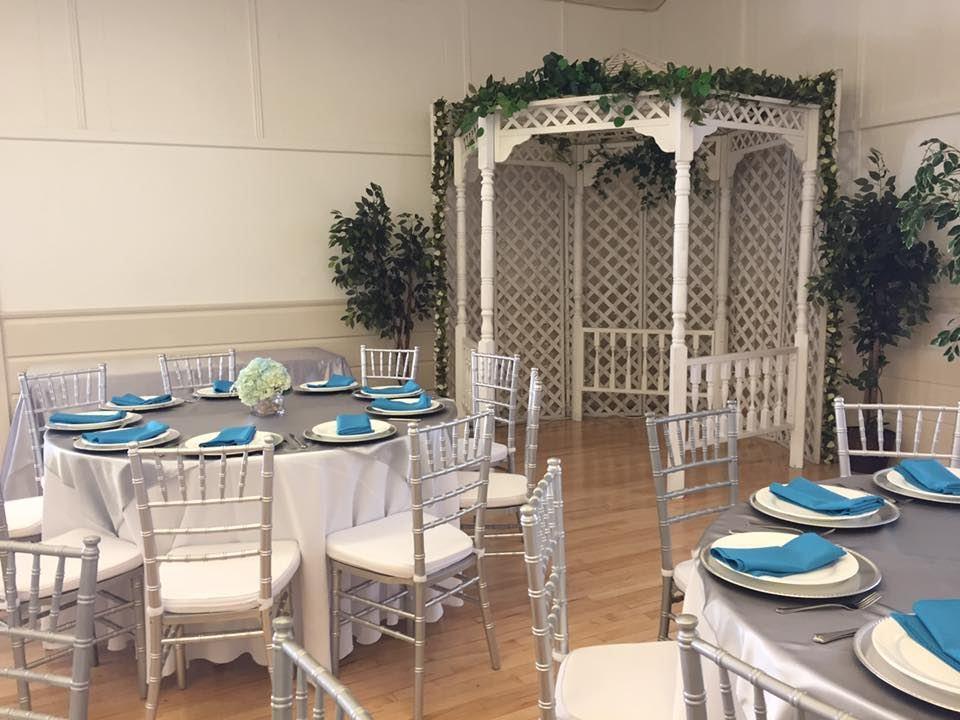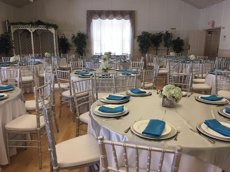 This well-preserved hall built in 1937 features beautiful original hardwood floors; a draped vaulted ceiling; a large stage area with a pull-down screen for presentations and a podium available; stage spotlighting; private bridal sitting room/bathroom; handicapped accessible entrance and bathrooms; lit gazebo area; central air conditioning and heating; restaurant style stainless steel kitchen; ample parking on site and around the perimeter of the building, and other special touches you will not find at other venues.