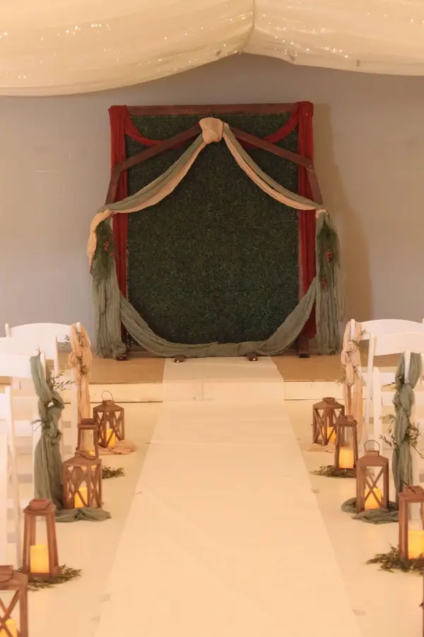 Procession areas for sparkler exits and glamorous entrances • Tables and chairs • Lights and curtains • Staging furniture • Stage for live music or wedding ceremony • Private kitchen • Three bathrooms • Private Bride’s room • Award-winning platform for your decorating dreams • Plenty of parking • Choose your own caterer, cater yourself or try one of our suggestions; alcohol allowed • Handicap accessible