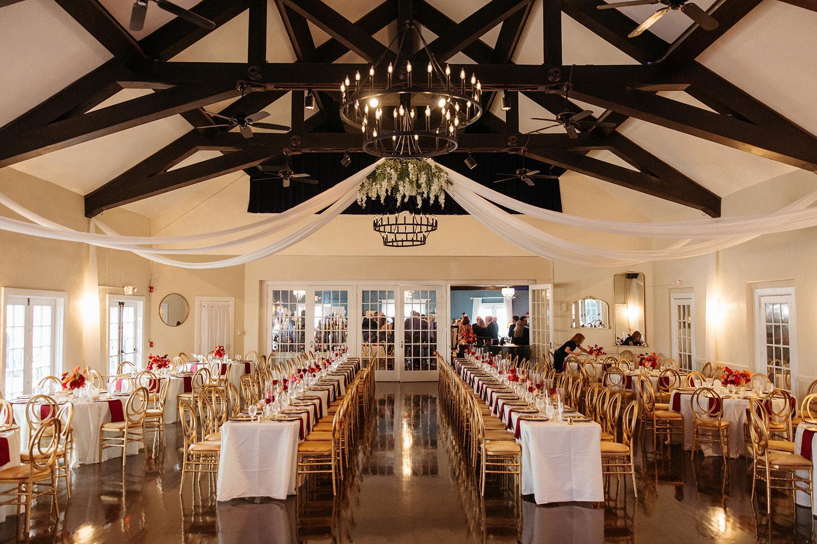Vaulted with beamed ceilings, gorgeous hardwood floors, and a classic palette, wrapped in French doors with intimate lighting, the ballroom is a timeless backdrop for the celebration of your dreams.