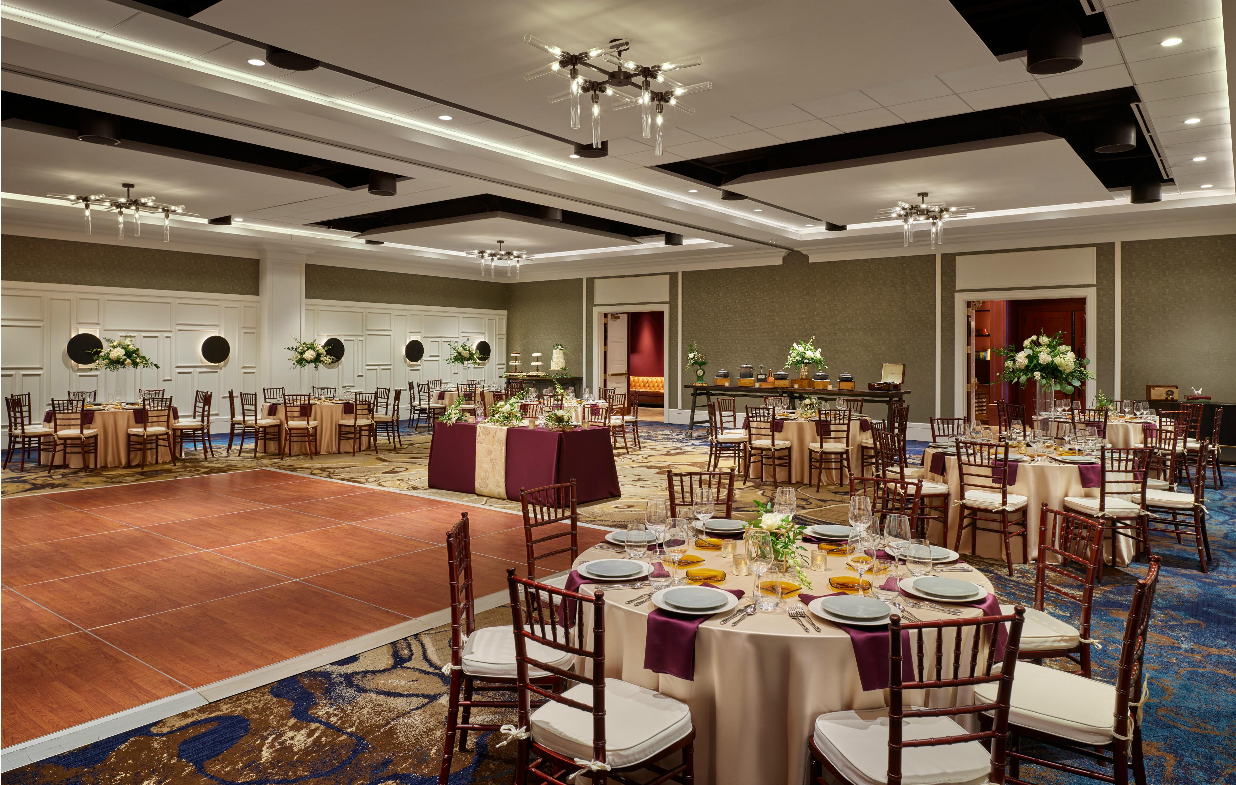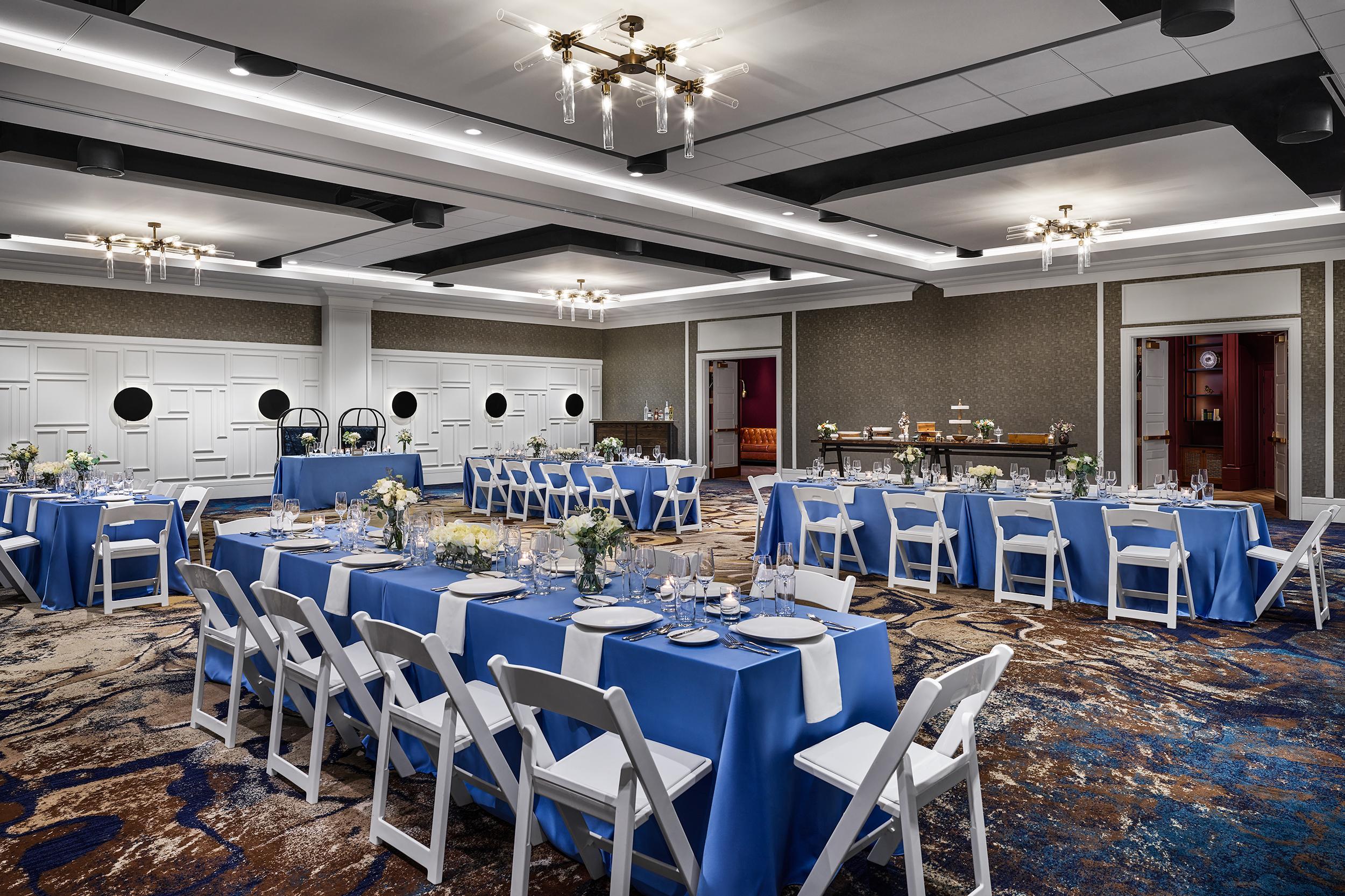 The perfect mix of contemporary design and traditional elements, our 2,605 square foot Walnut Ballroom seats up to 150 guests. Including fantastic small details like our crown molding accent walls and dim-able built-in lighting. Featuring marbled cerulean, gold, and sand colored carpet and bright millwork elements, this flexible reception space is easily transformed to match the size and style of your celebration.