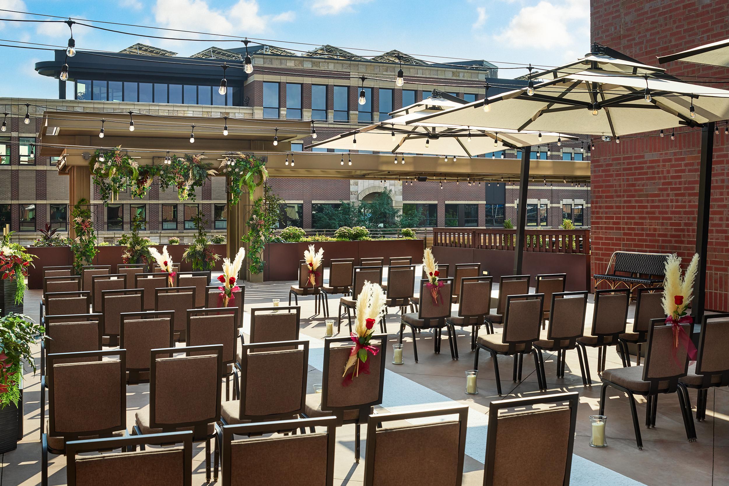 Our stunning outdoor Terrace is a secluded, open-air gathering place which features beautiful red-brick, bronze, and laser-cut details. It opens up to showcase views of Fort Collins’ Old Town area and the front range mountains in the distance. The space includes a pergola with silk floral décor, as well as several built in fire pits with lounge seating. The terrace is the perfect space to accommodate up to 150 guests for an outdoor ceremony or cocktail hour.