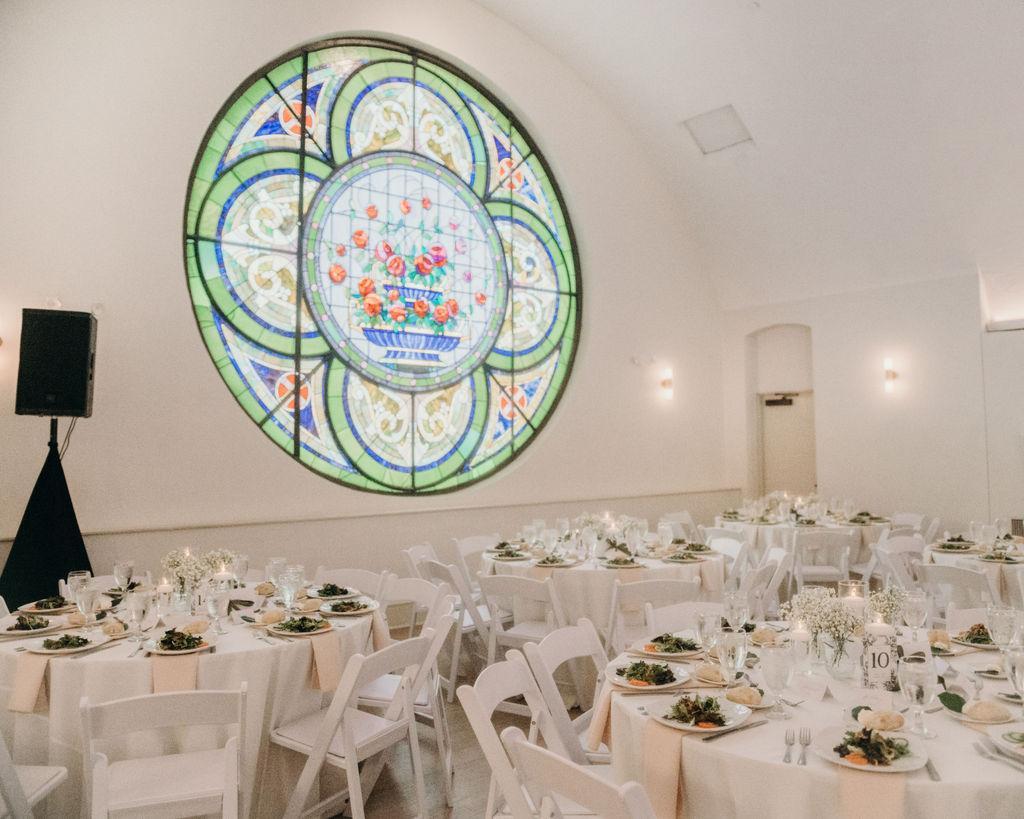 Our ballroom’s grand staircase leads to a balcony that highlights the iconic rose window and sits opposite the room’s stunning 8’ Swarovski crystal chandelier. The 29’ barrel-vaulted ceiling provides excellent acoustics and dimmable wash lighting that accent its historic structure and original stained glass. The 27' quartz bar, open floor plan & neutral hues allow for creative arrangements of seating, dance floors & décor, ensuring every detail aligns with your vision.