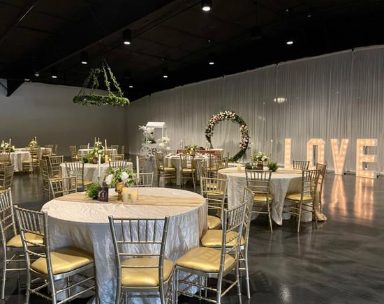 Nestled conveniently near the I-24 and accessible via the US Alt 41 Bypass, our venue boasts both indoor and outdoor spaces, ideal for creating cherished memories on your special day. Picture this: you start your wedding day in the comfort of our on-site dressing rooms, preparing for the magic ahead. As you step into our main event space, you'll be captivated by its elegant industrial-chic vibe, complete with exposed beams and ample natural light pouring in through large windows. With space for guest counts of 100-1000, our function room sets the stage for a dreamy reception, featuring beautifully decorated tables and twinkling chandeliers that add a touch of glamour to your celebration.