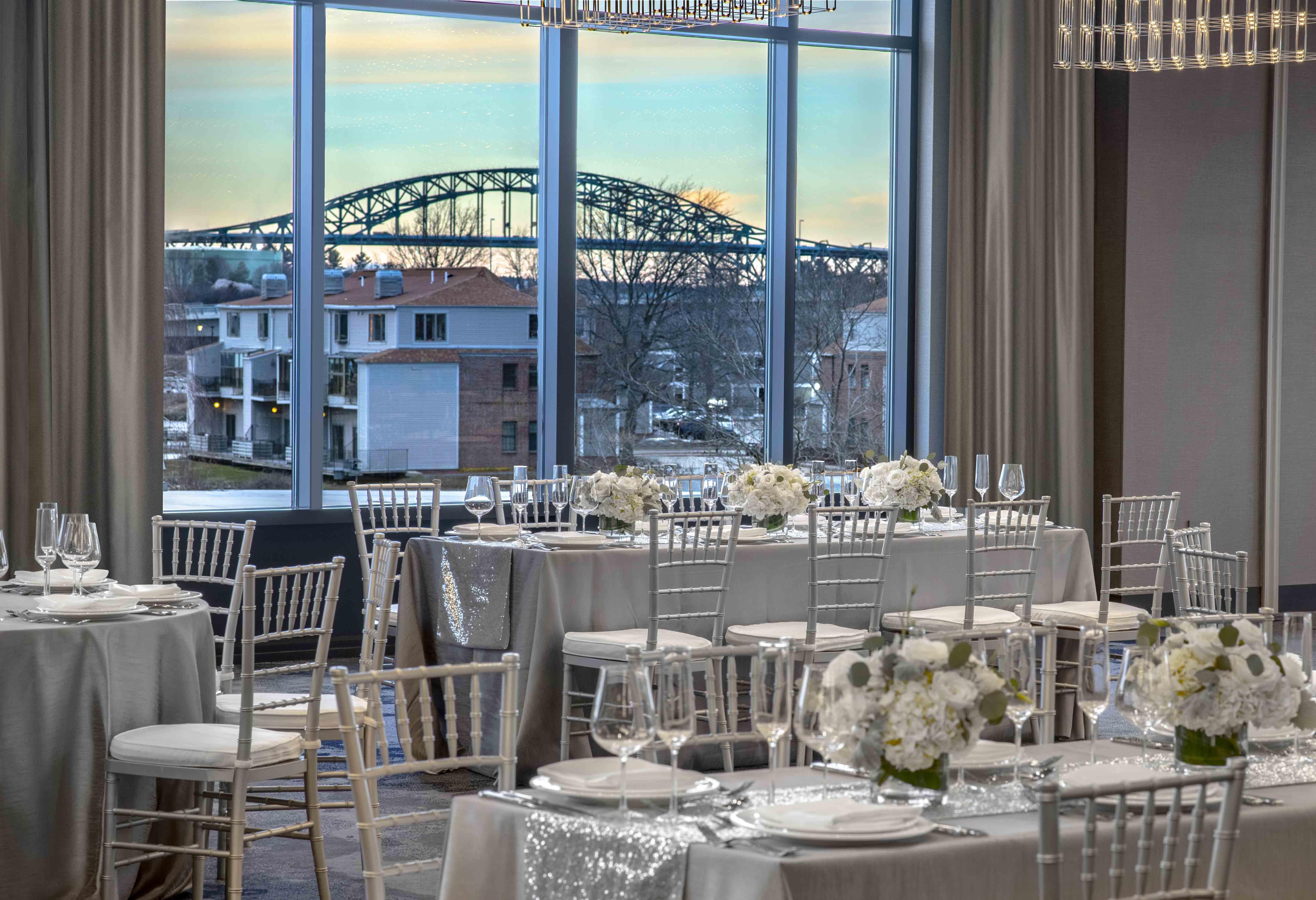 Guests arrive at a pre-function area boasting floor-to-ceiling windows and a terrace offering views of the active seaport of Portsmouth and the Piscataqua River. Watch the bridges rise as the ships come and go while your guests marvel at the stylish space.