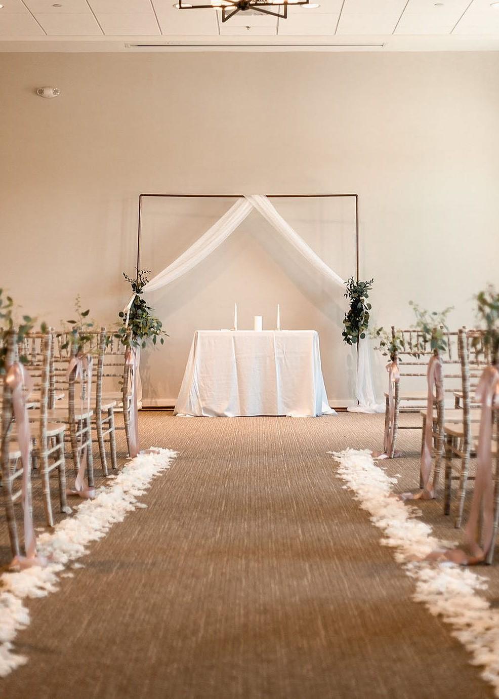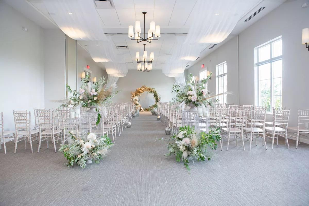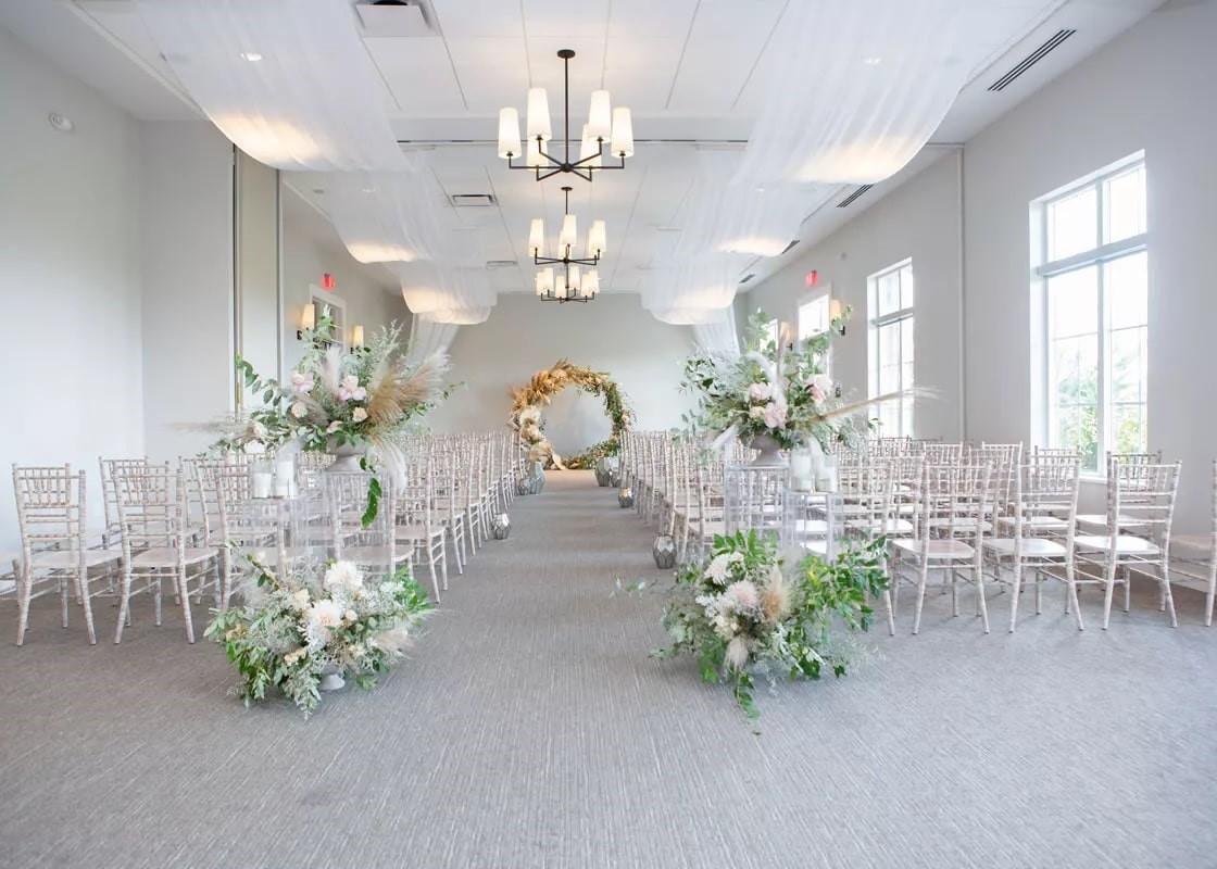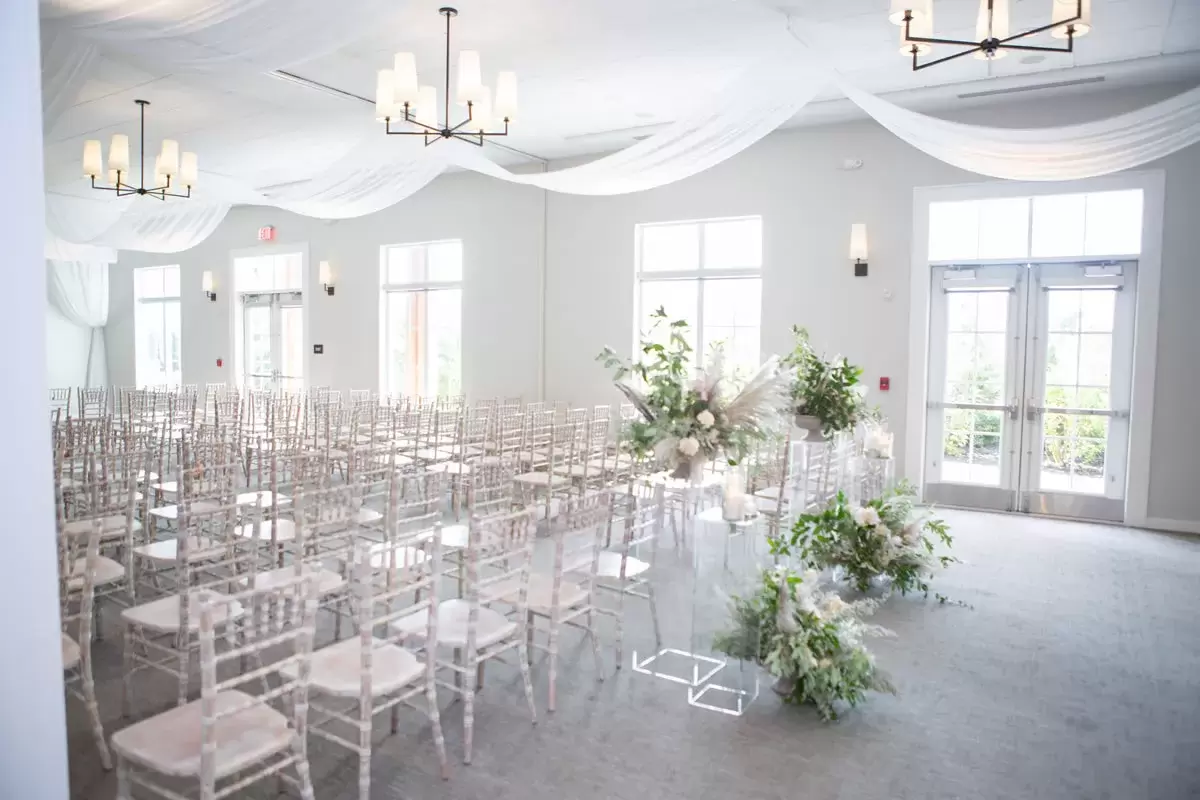 Our Forest & Noble Rooms are great for indoor ceremonies, meetings, and conference breakout sessions. The rooms can be separated via a partition or combined to create one beautiful, naturally lit room. For ceremonies, the room features a 75-foot aisle punctuated by softly lit chandeliers, neutral walls, and flooring. We have speakers built into the ceiling so that music is playing when guests first arrive and throughout the processional, and our whitewashed Chiavari chairs are the perfect icing on the cake.