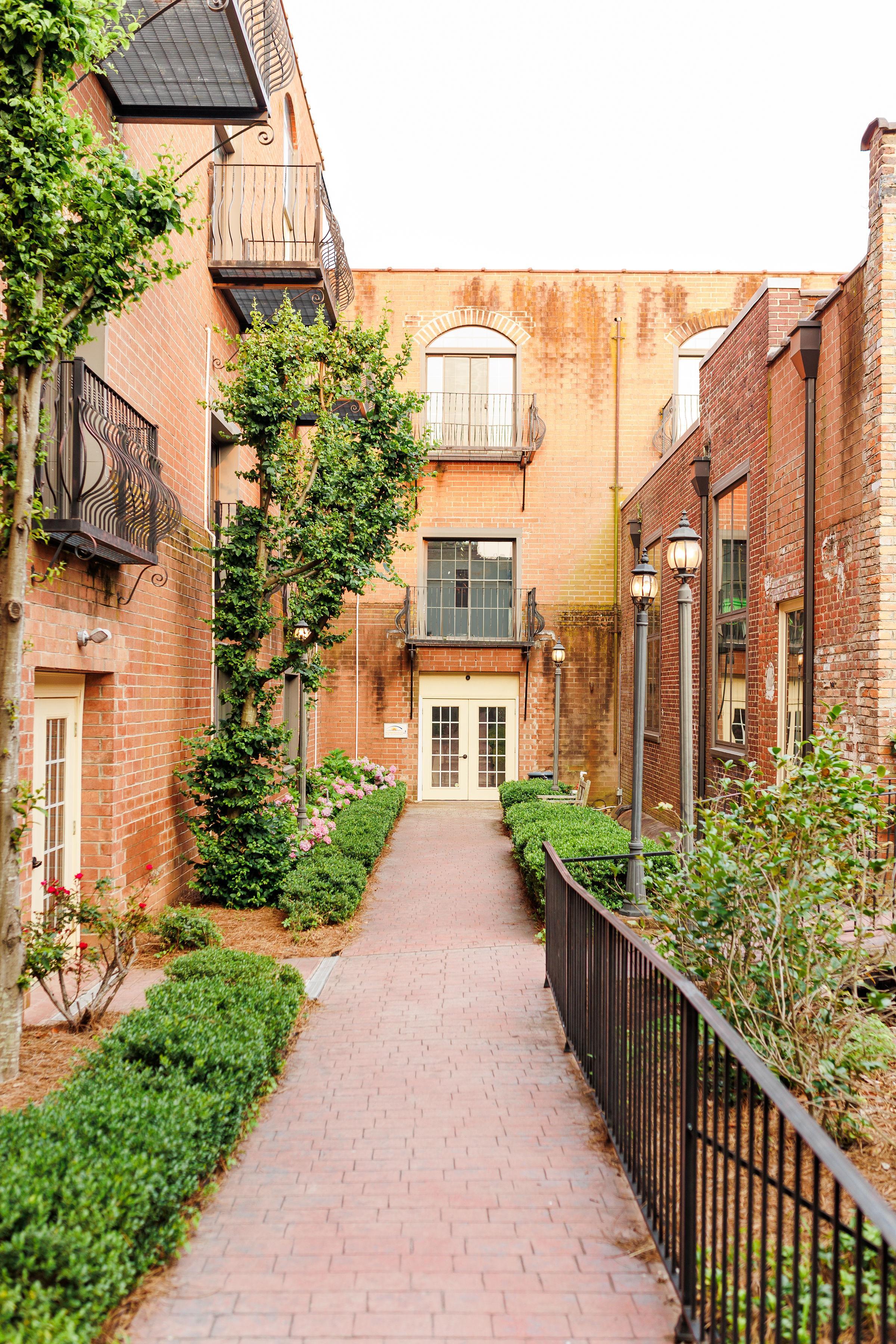 Discover a serene courtyard oasis, with a charming fountain nestled among vibrant foliage, all within the enchanting embrace of a historic factory.