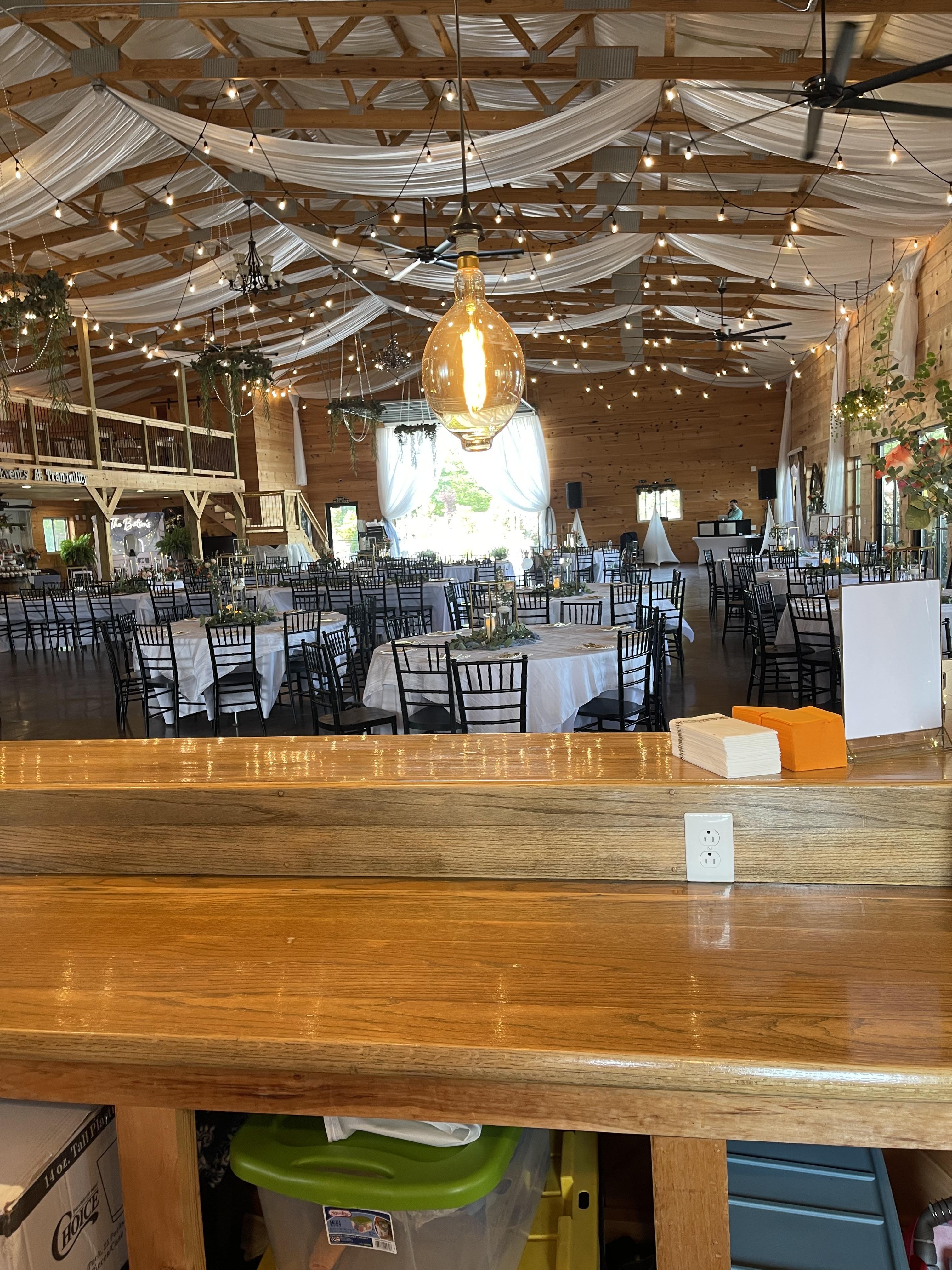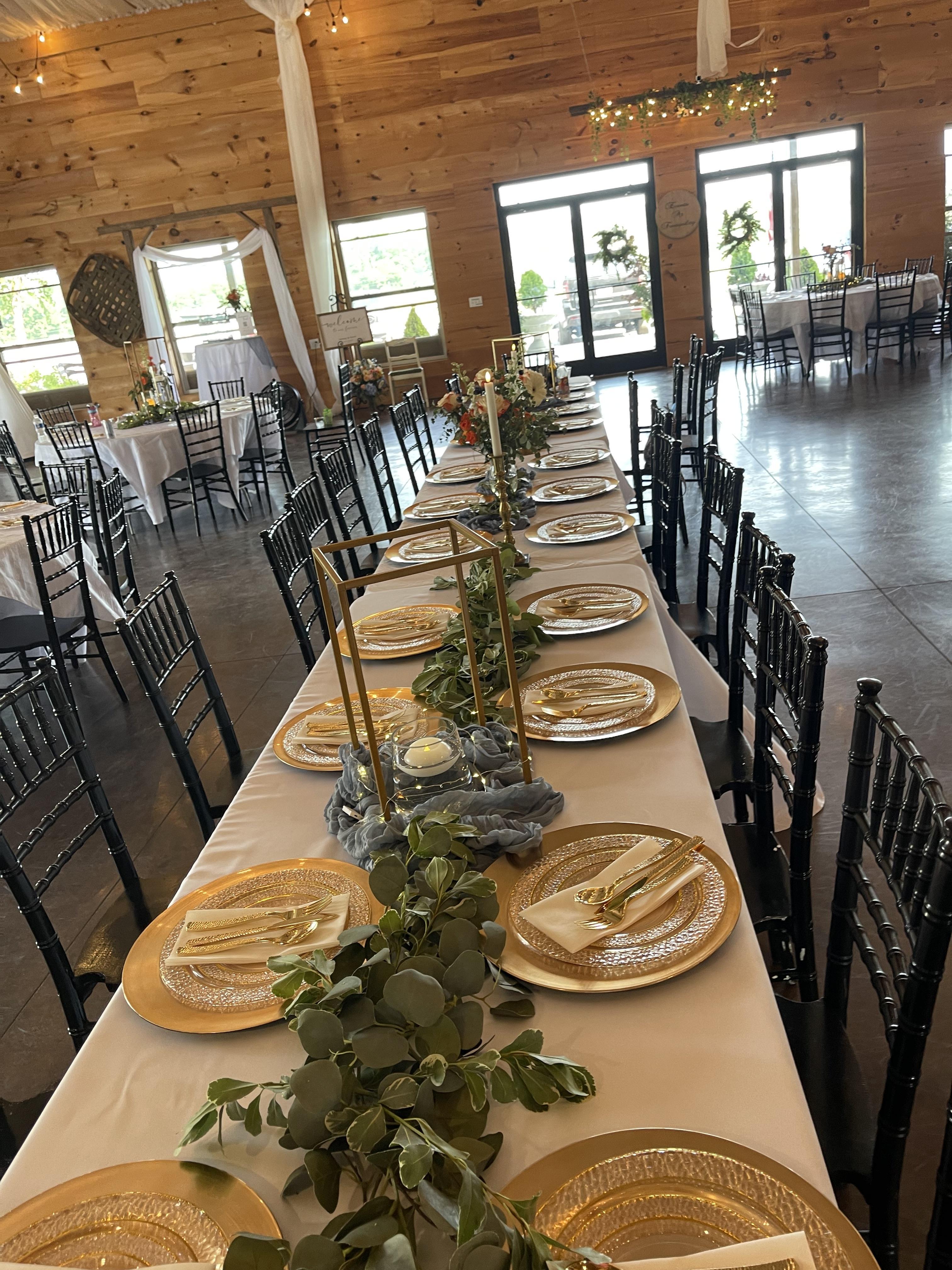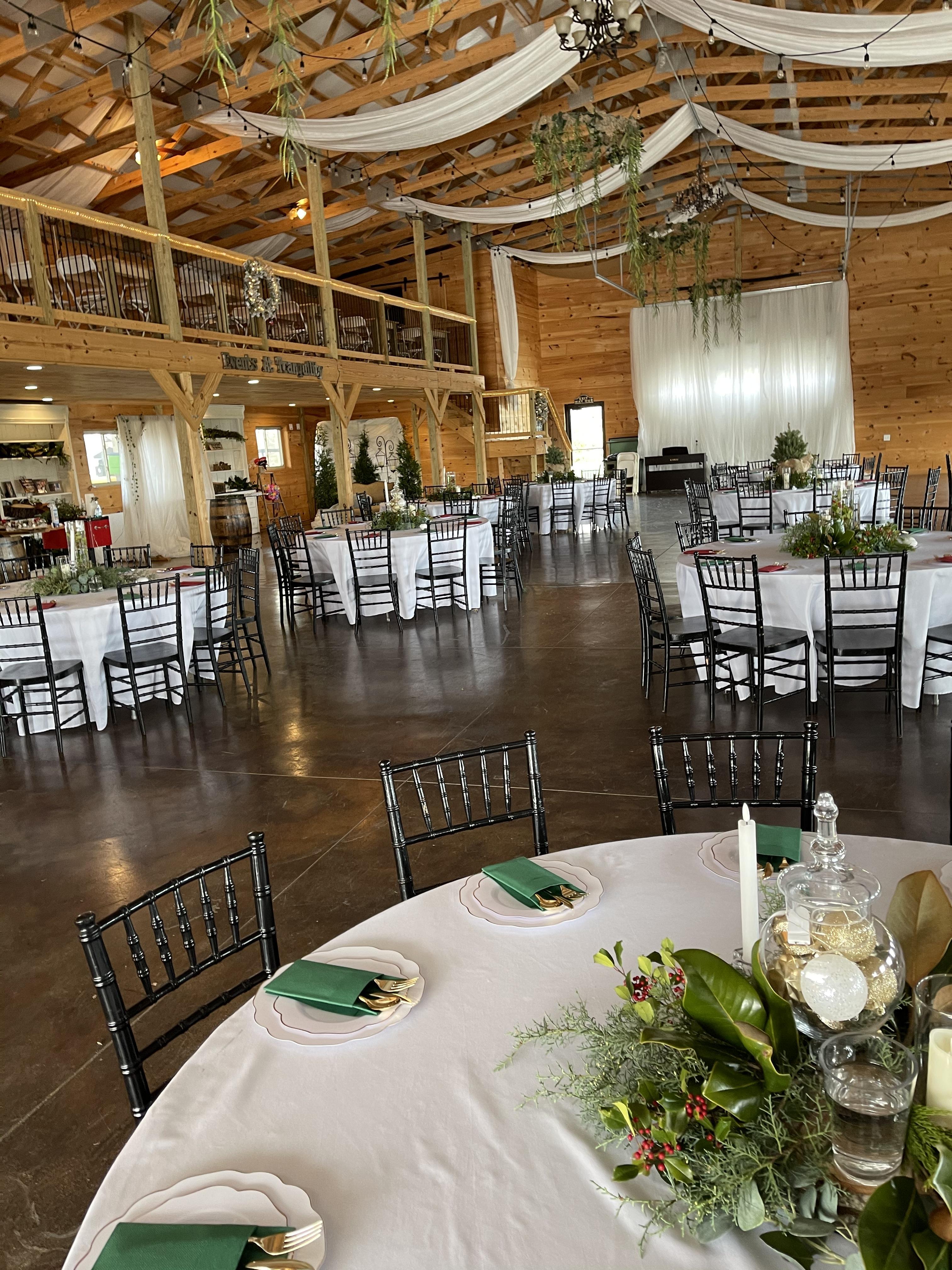 -tabels -chairs -linens -bride and groom room -some decorations -chargers -dinner plates -dinner glasses -black stainless flatware -custom Buffett -cake table -Photo Booth backdrop -climate controlled