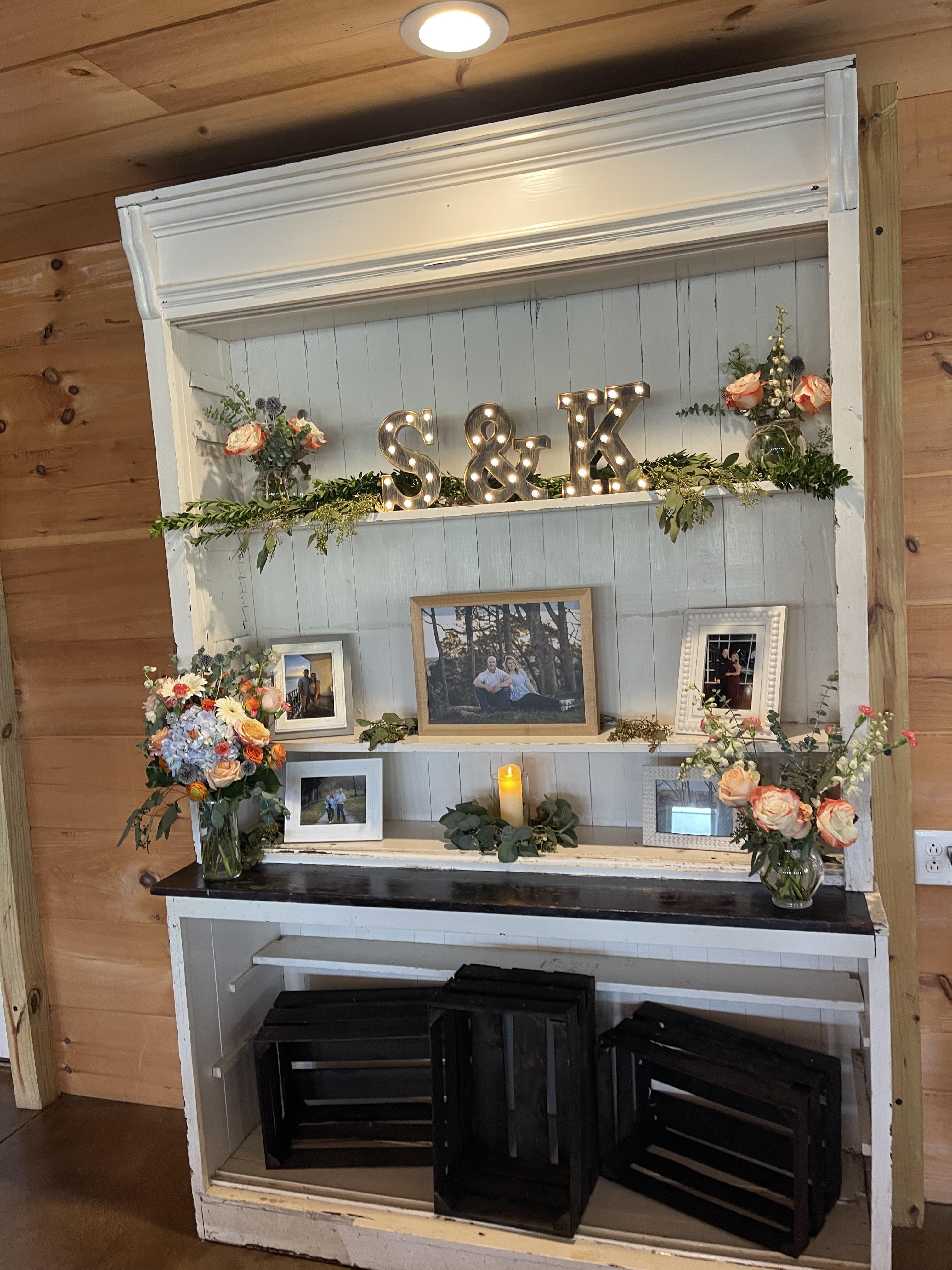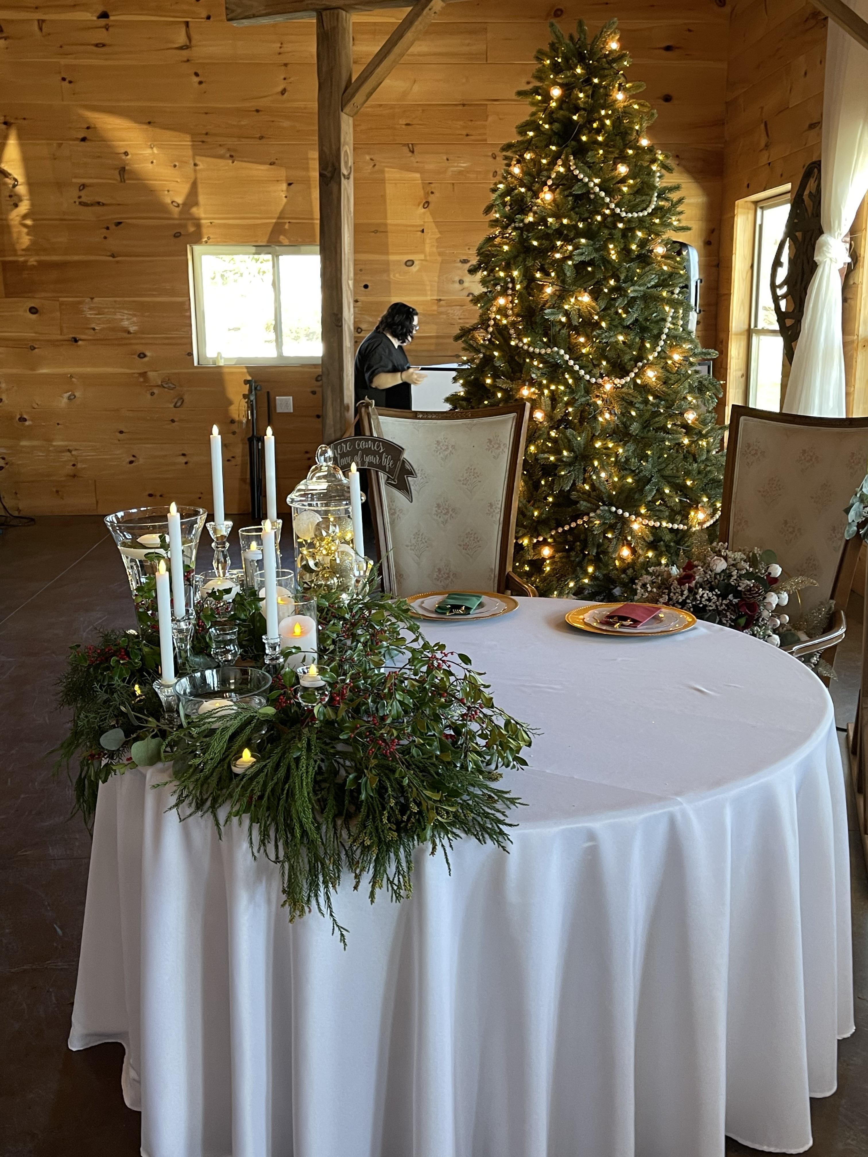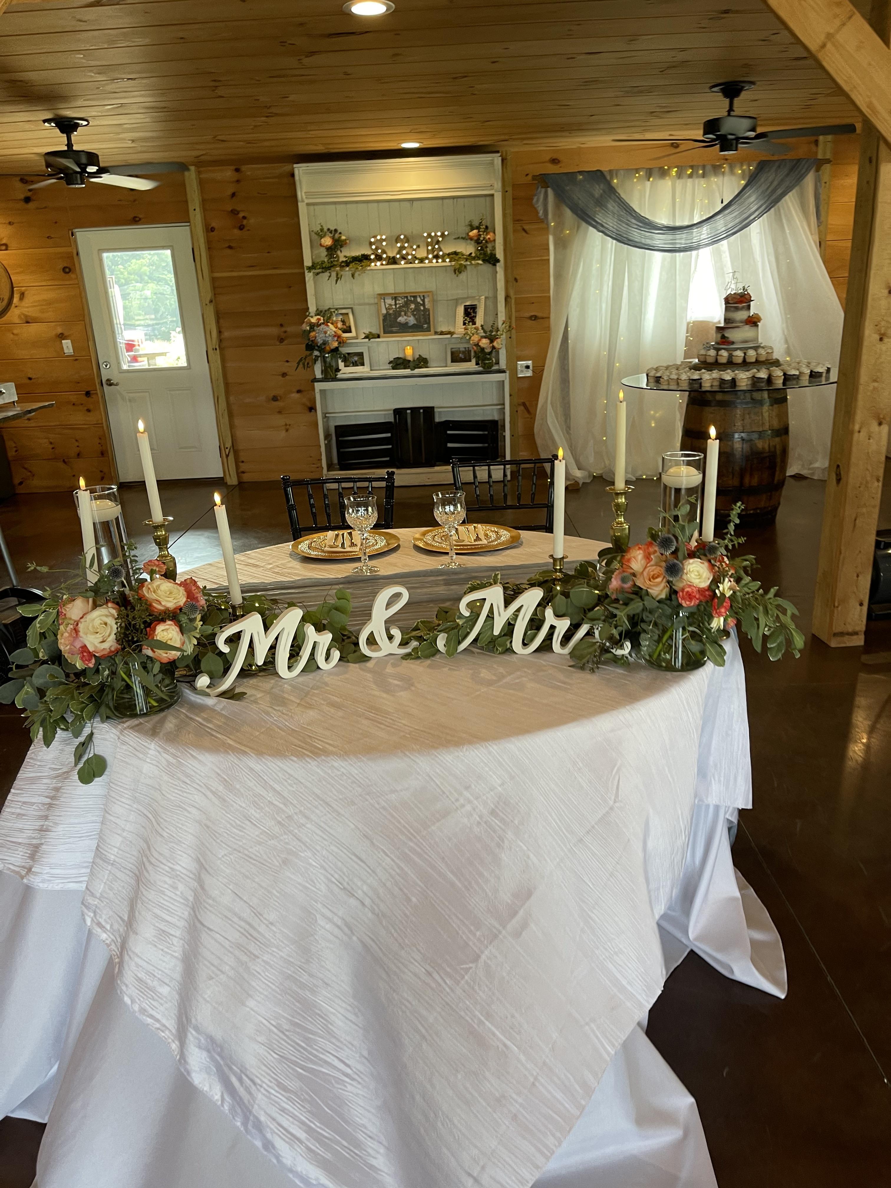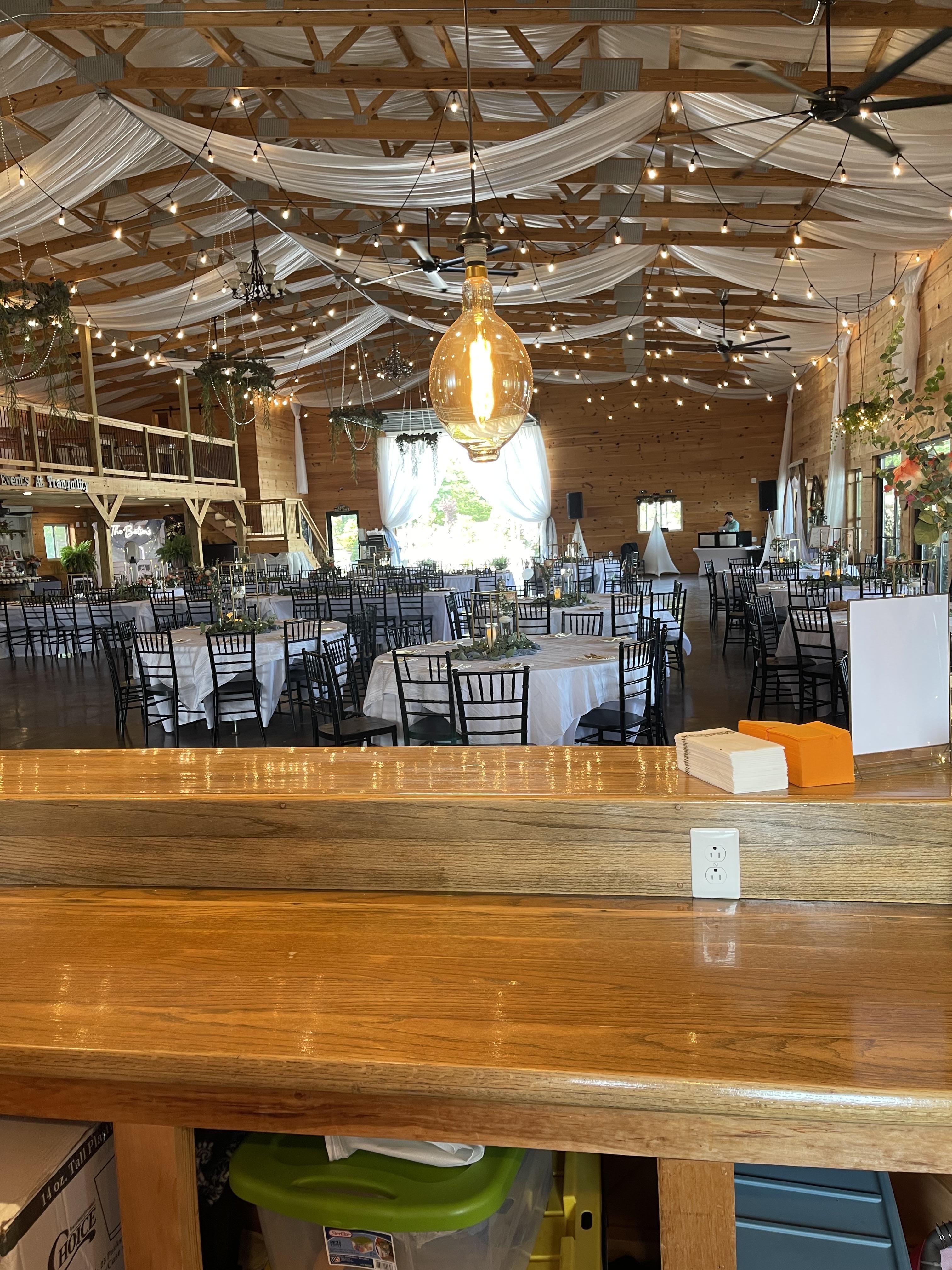 -tabels -chairs -linens -bride and groom room -some decorations -chargers -dinner plates -dinner glasses -black stainless flatware -custom Buffett -cake table -Photo Booth backdrop -climate controlled
