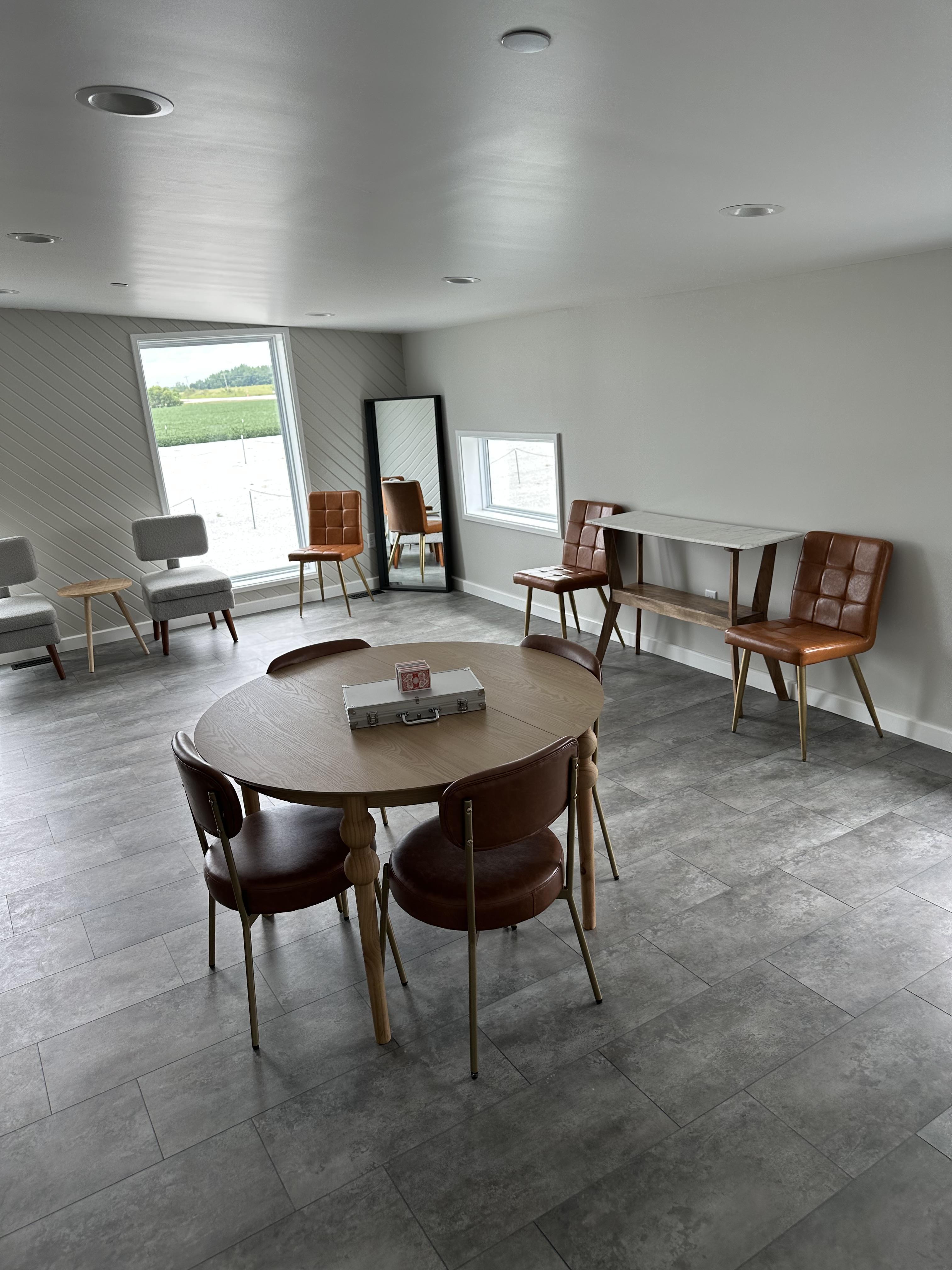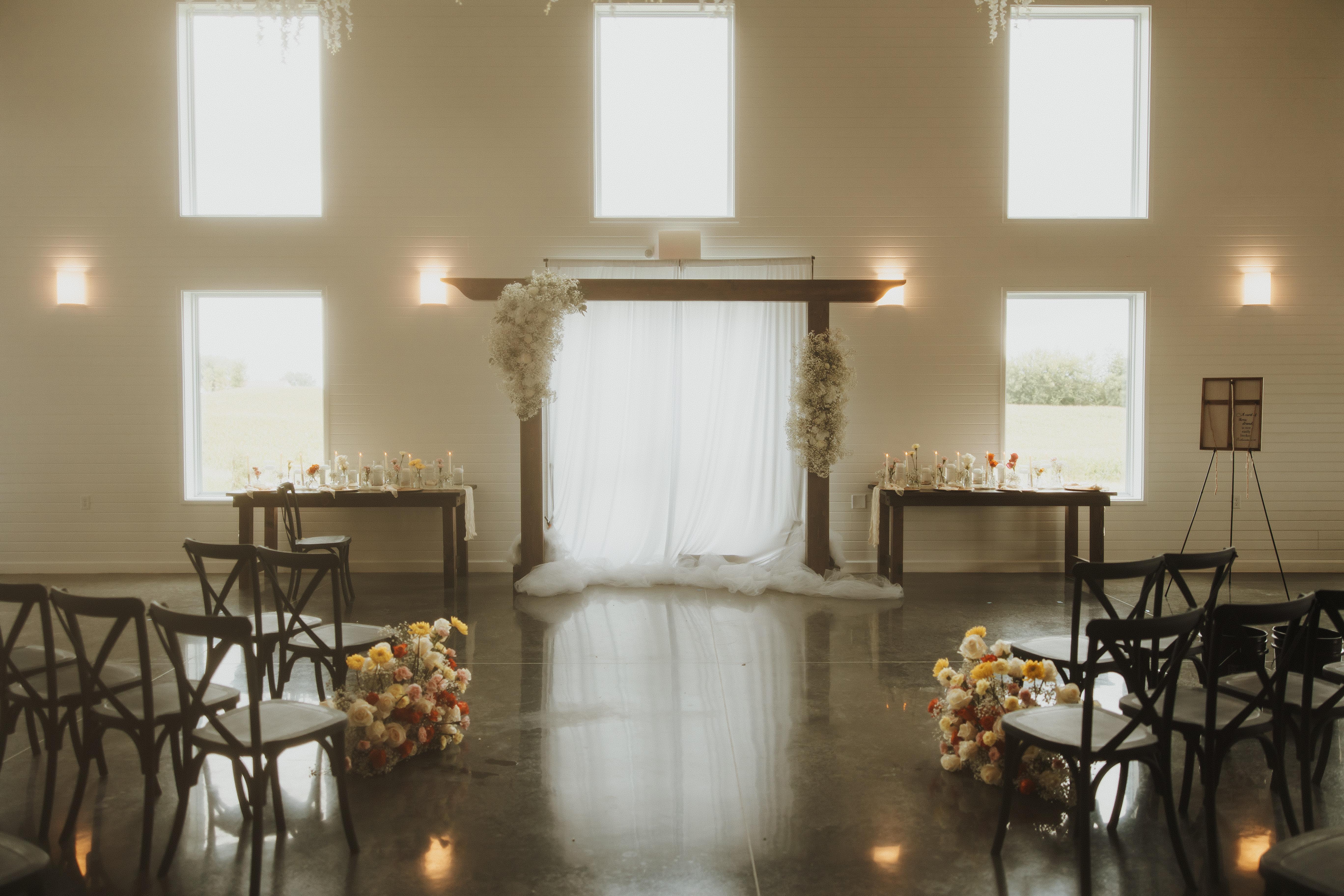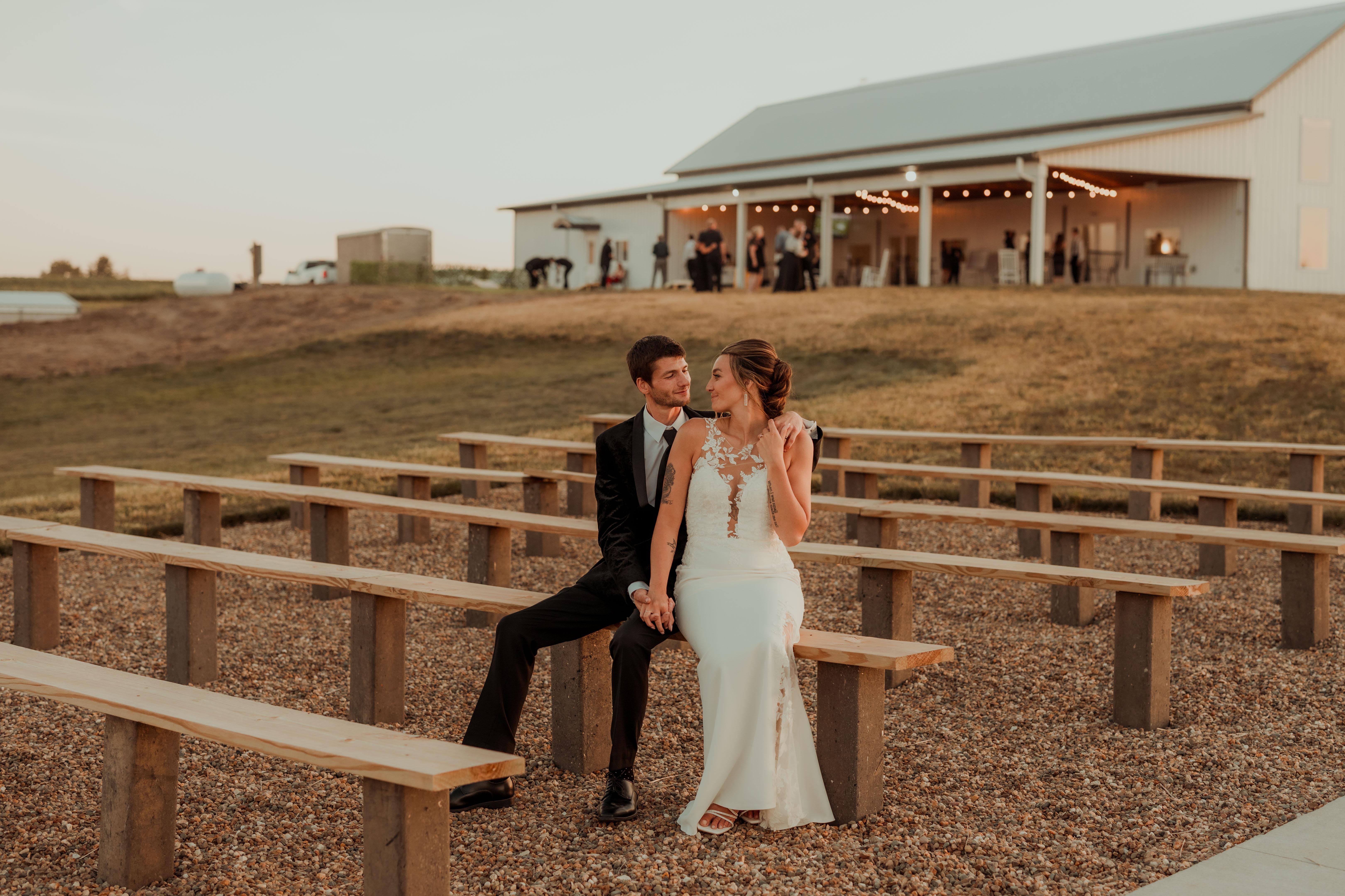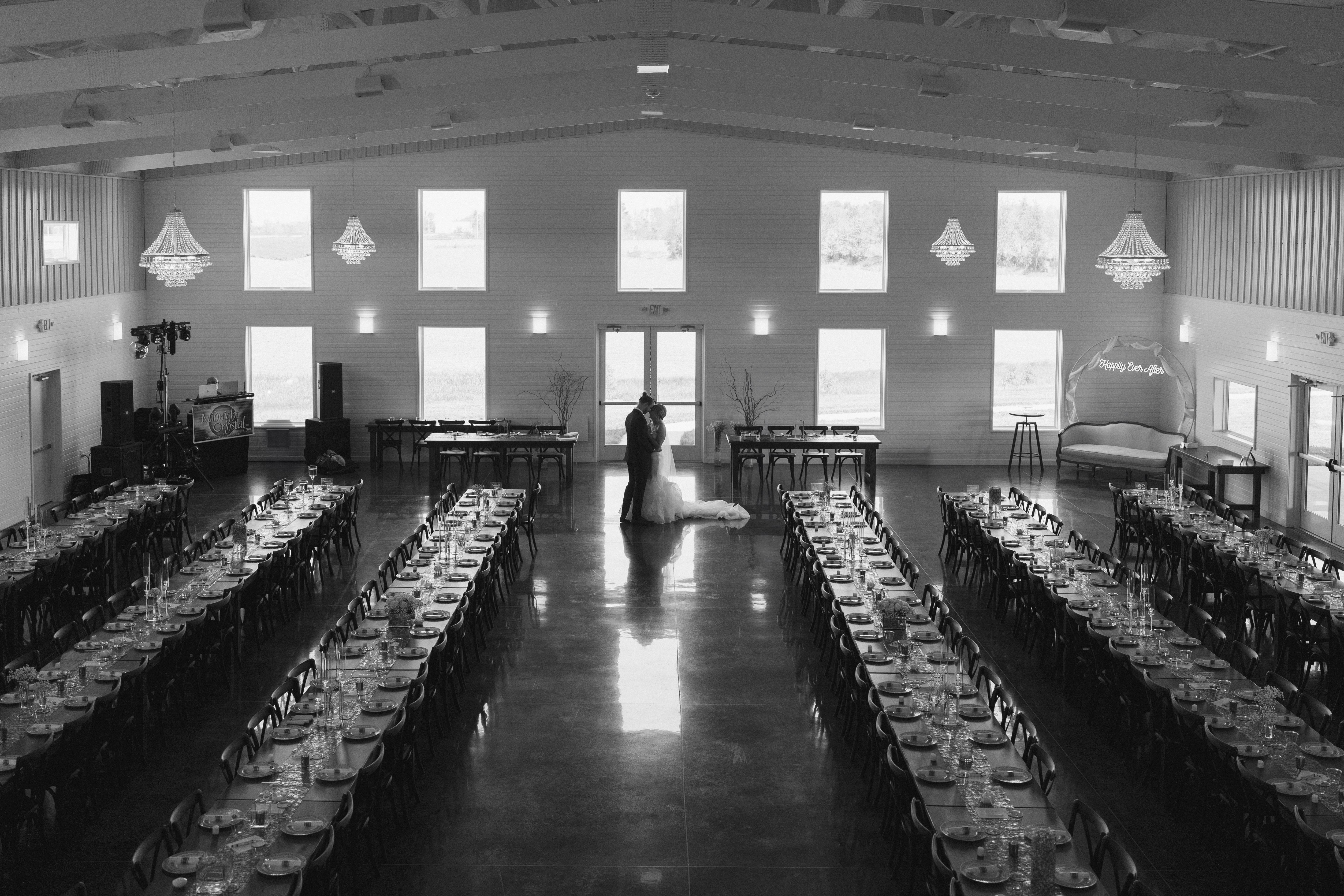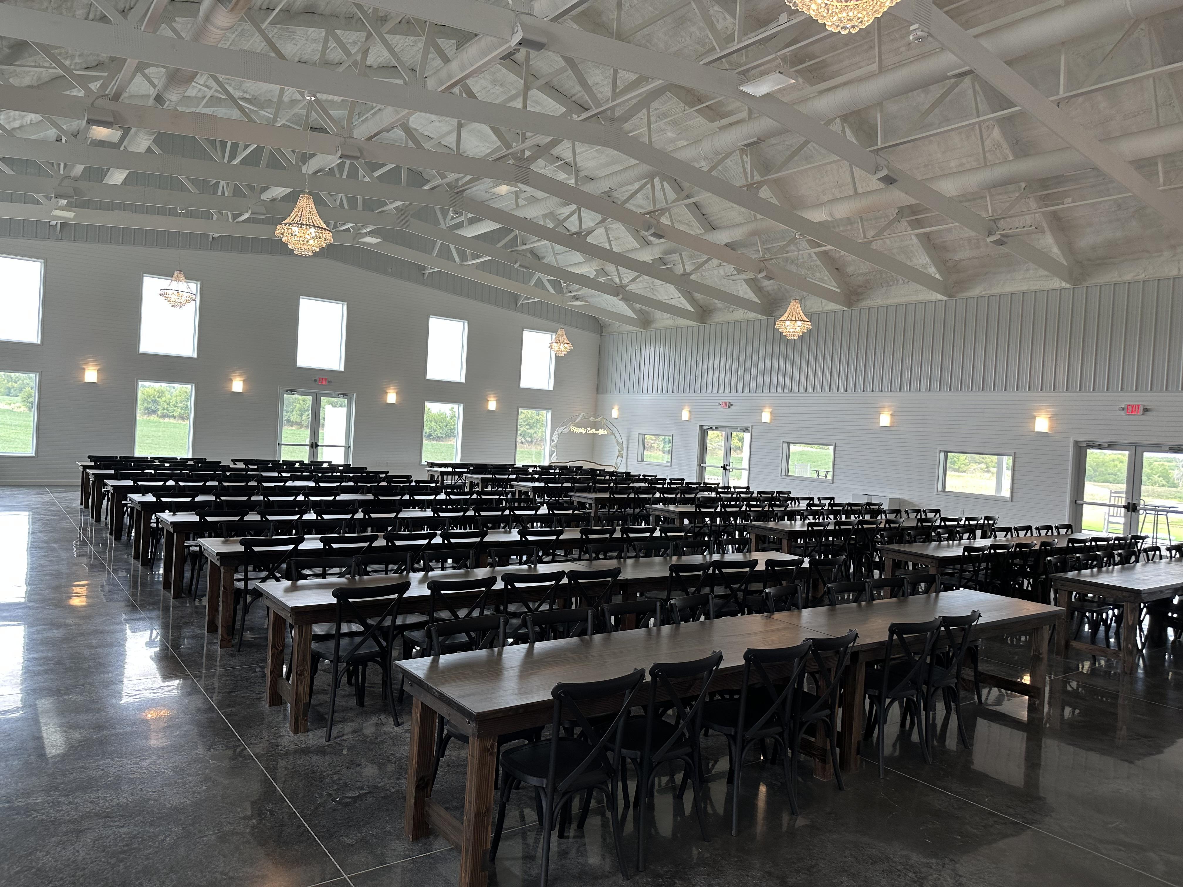 Immerse yourself in the beauty of Iowa’s countryside. The sparkling white gambrel barn overlooks fields, timber and two ponds. Our temperature controlled Ballroom comfortably seats up to 320 guests, on the wooden farmhouse-tables and black cross-back chairs we provide. Every package includes ample day-before rehearsal AND decorating time, 6:00 am - midnight full access the day of, and time to return the day after to retrieve decor, rentals, food, personal times, and vehicles.