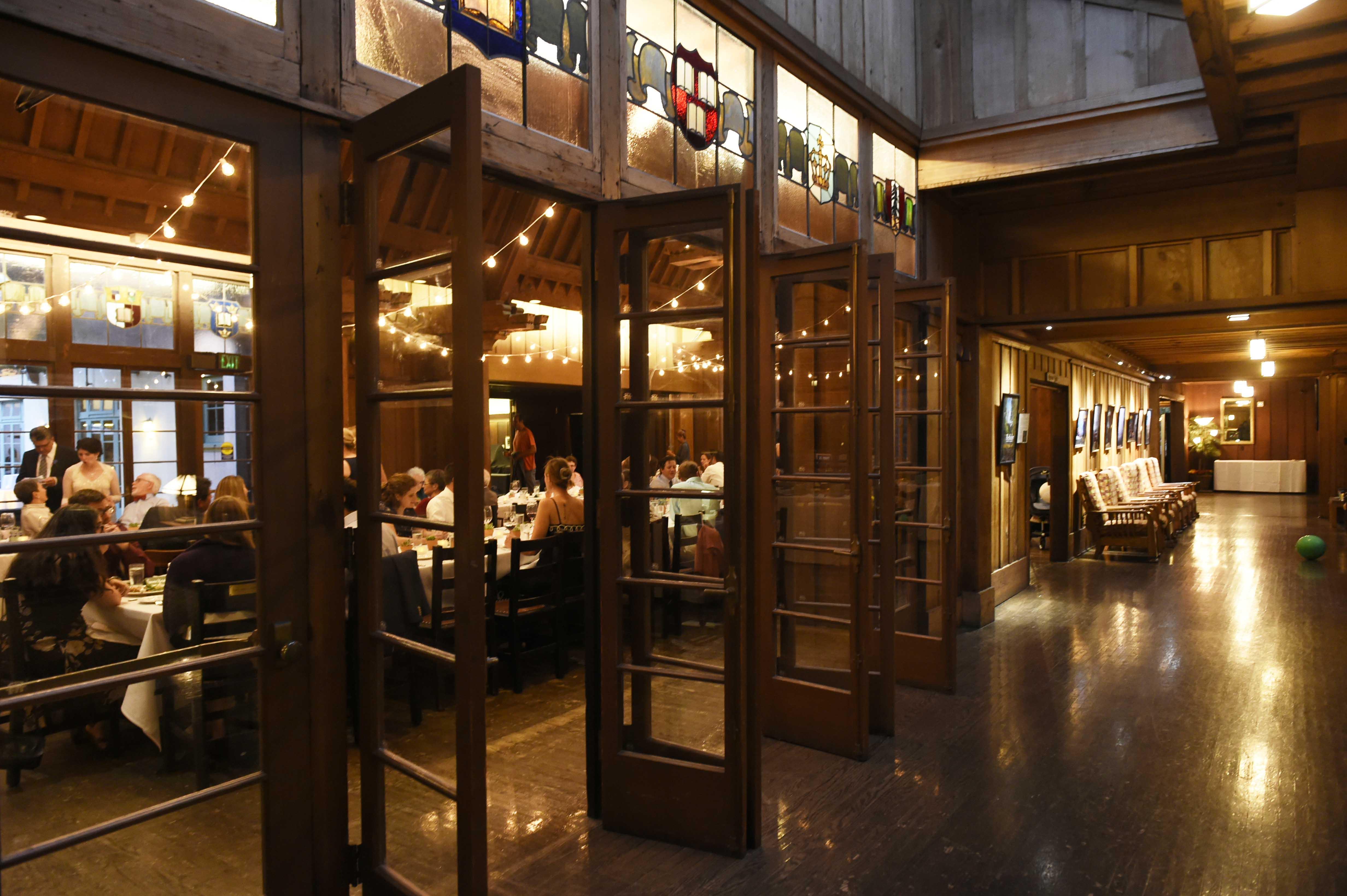 he crowning glory of the club is the three-story Great Hall. With its vaulted ceiling, massive stone fireplace, and stained-glass windows featuring heraldic crests of the great universities of the world, it's reminiscent of many a European cathedral. Light from the floor-to-ceiling windows warms the redwood paneling and suffuses the Hall in a golden glow.