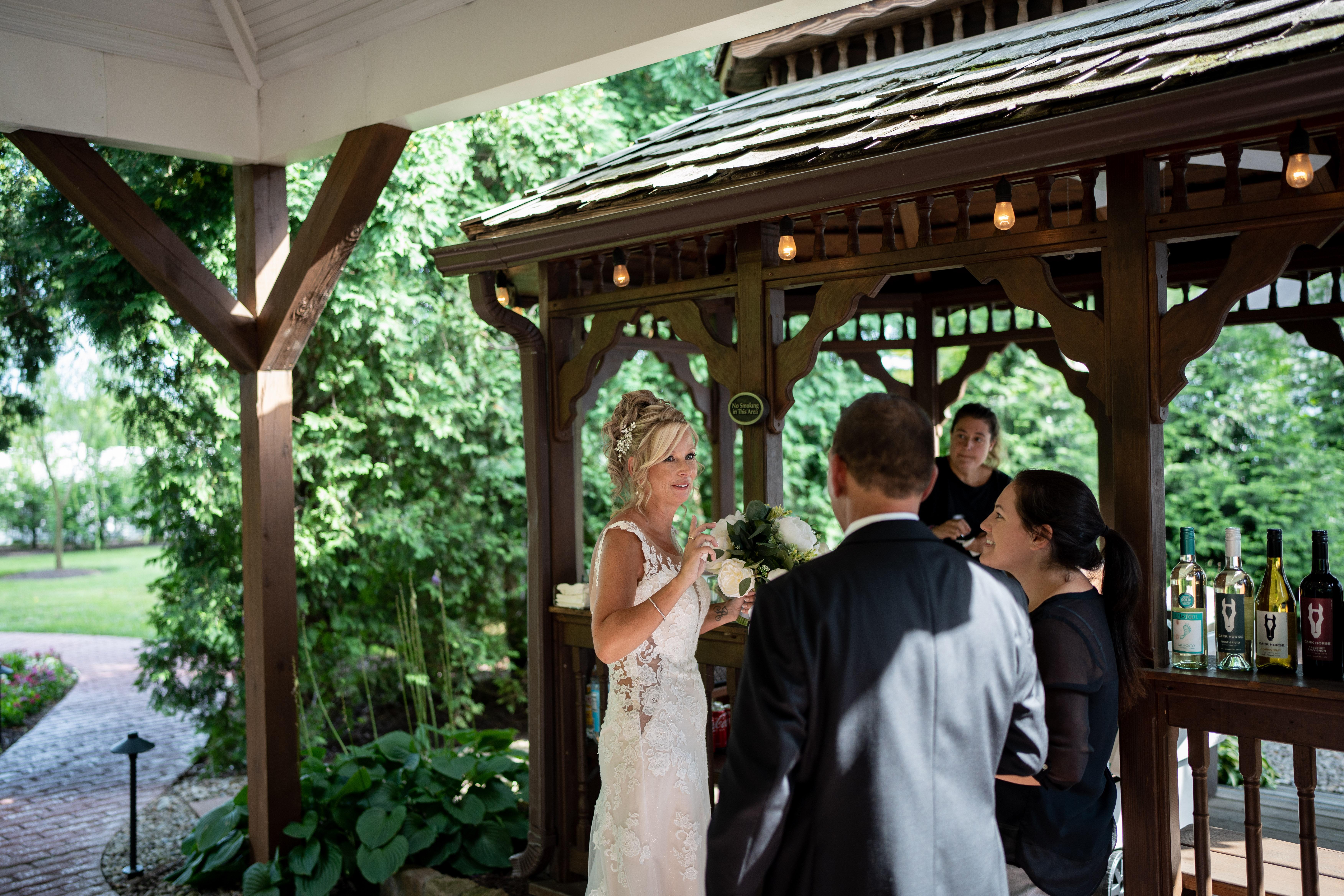 Directly outside the main ballroom, french doors open up to a wrap-around deck and patio that overlooks our gardens and two gazebos. Guests can mingle and enjoy the deck and outdoor space during the entire reception. The deck and outdoor gazebo bar are partially covered, allowing use of the space during inclement weather.