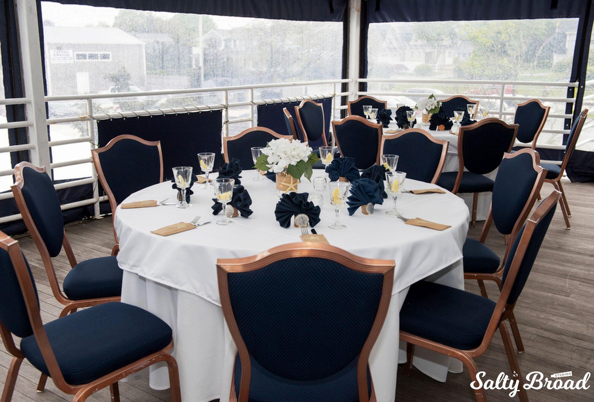 Celebrate your special day with us at The Flying Bridge, where we offer a variety of stunning options for both ceremonies and receptions. This elegant venue features a grand stairway entrance, floor-to-ceiling windows, and a wraparound deck that provides panoramic views of Falmouth Harbor and Vineyard Sound. The space boasts a luxurious marble-top bar, a spacious dance floor, and ample room for live entertainment or a DJ. A unique feature of this room is the wall of accordion glass doors, which open to the deck, offering a seamless transition between the indoor and outdoor celebrations. For those seeking additional options, we also offer the Falmouth Tides Hotel for convenient room blocks, and our beach or roof deck ceremonies provide an enchanting backdrop for your vows. Please inquire about our menu options and ask for more details about our various offerings to make your wedding day truly unforgettable.