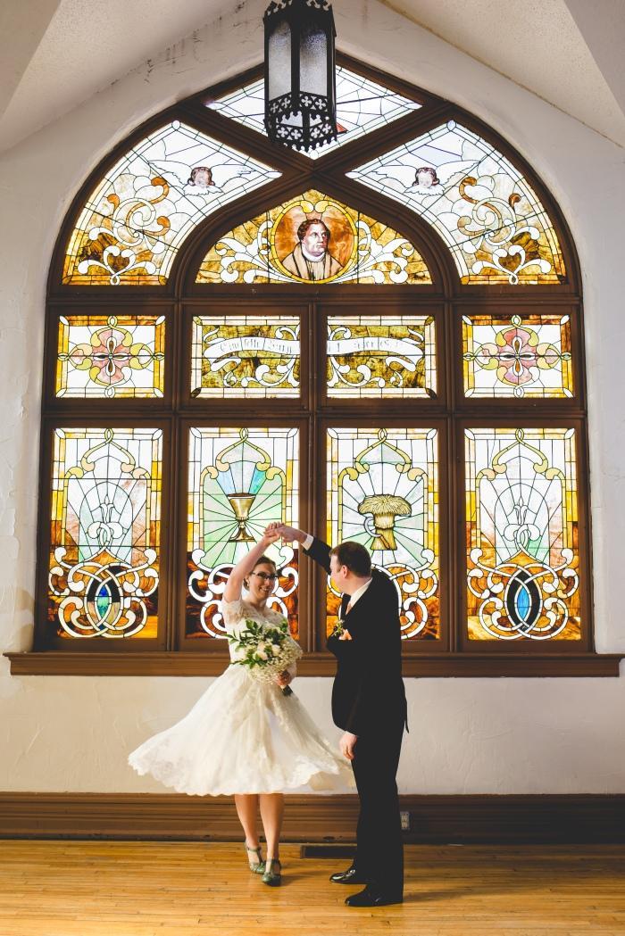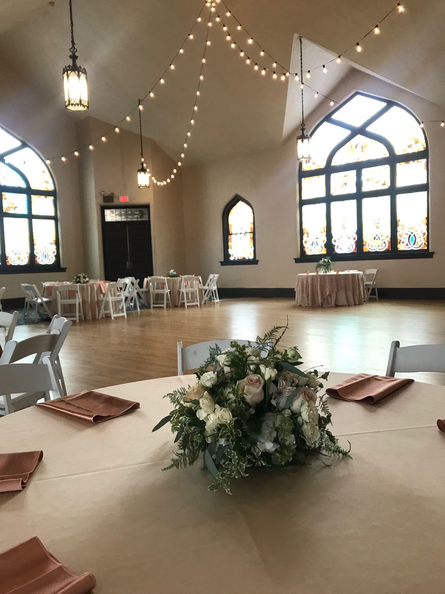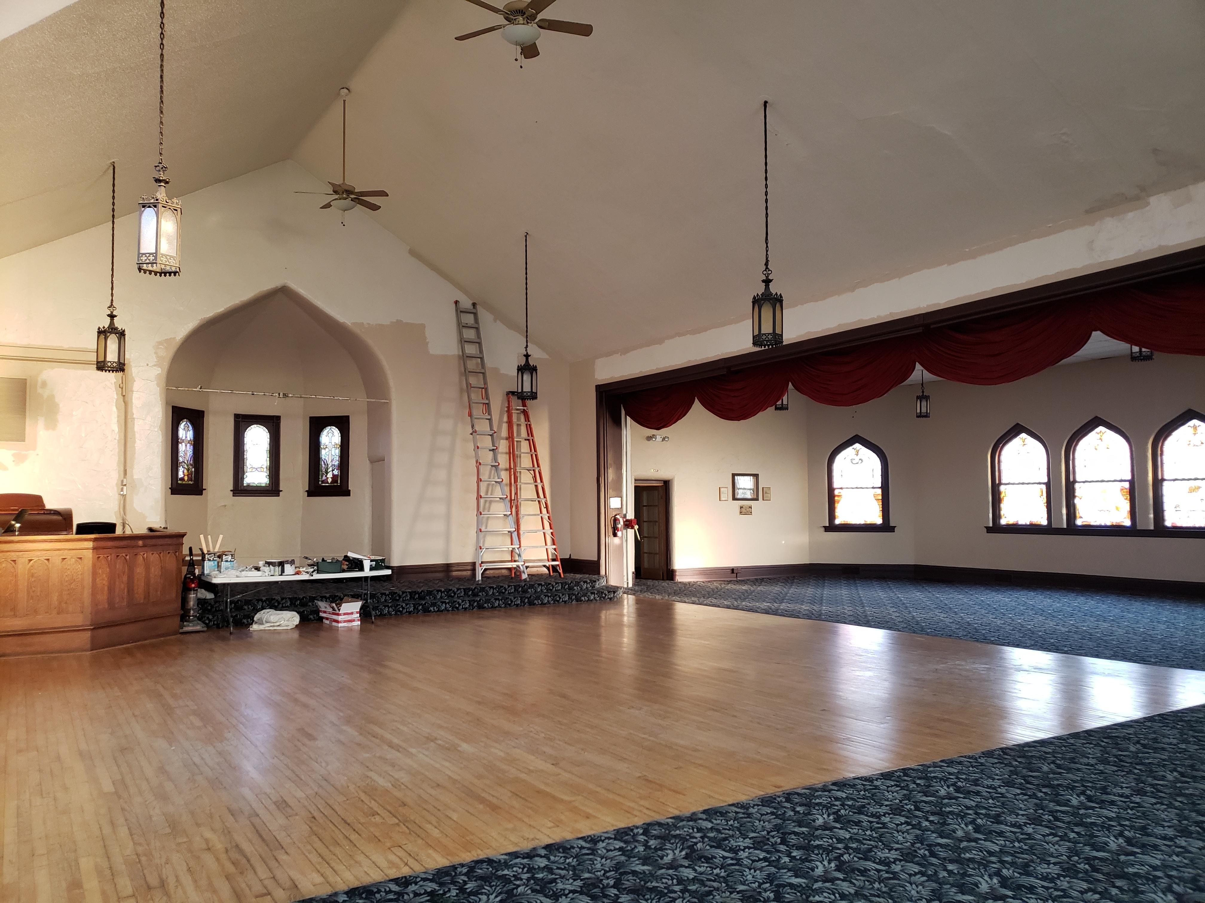 Beautiful and historic stained glass windows, dance floor, tables and chairs.