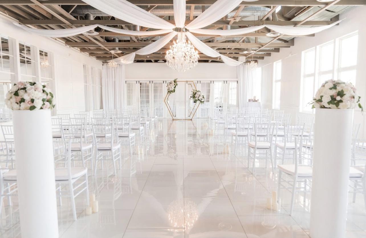 The Gala 417 – Virginia's Top All-Inclusive Waterfront Wedding Venue The Gala 417 is an all-inclusive, luxury wedding venue offering couples exclusive all-day access to our 10,000 sq. ft. space that includes indoor, outdoor and covered outdoor spaces! Every wedding includes full wedding day management—complete with two dedicated coordinators—as well as setup, breakdown, tables, chairs, elegant place settings, and comprehensive planning assistance leading up to your big day. Our stunning property features: A large, modern ballroom with floor-to-ceiling windows, chandeliers, and white marble floors A modern & luxurious covered outdoor terrace A striking 20-foot marble bar, and a 12x12 customizable boxwood feature wall A dreamy sunset deck for golden hour moments Lavishly designed bridal and groom suites for getting ready with the all the *Wedding Day Vibes* The Gala 417 was designed to deliver a seamless, high-end experience from start to finish.