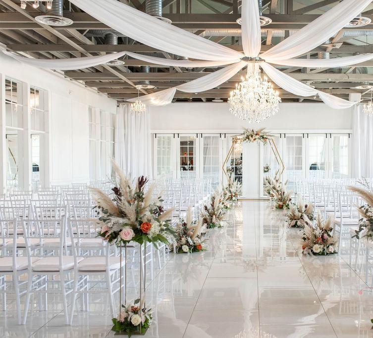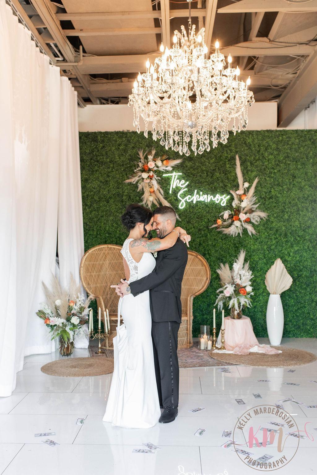 This 5,000 sq ft venue offers room for a ceremony, cocktail hour and reception with a large dance floor, 50 foot marble bar, 3 enormous crystal chandeliers and a 144sq ft boxwood feature wall!
