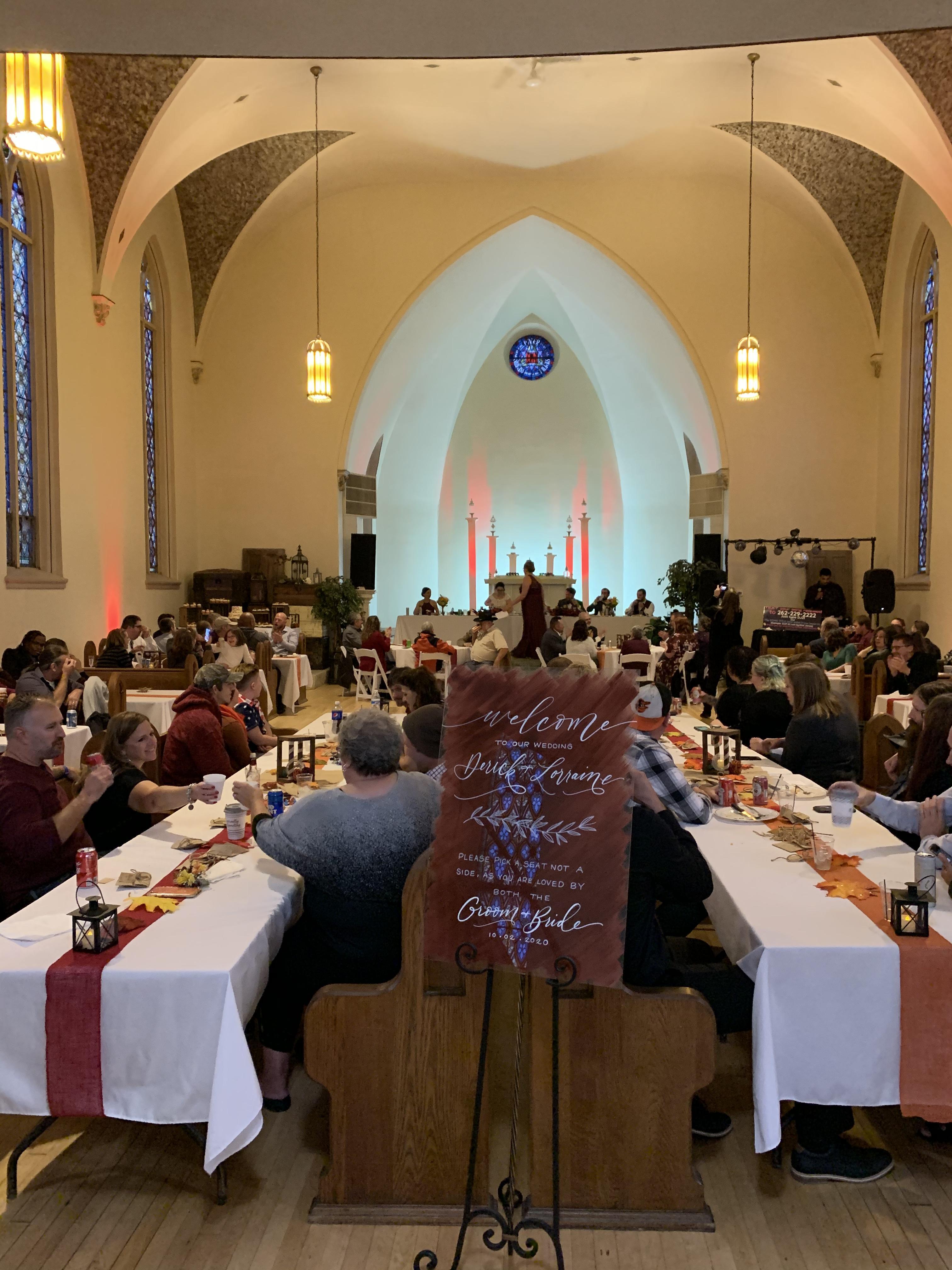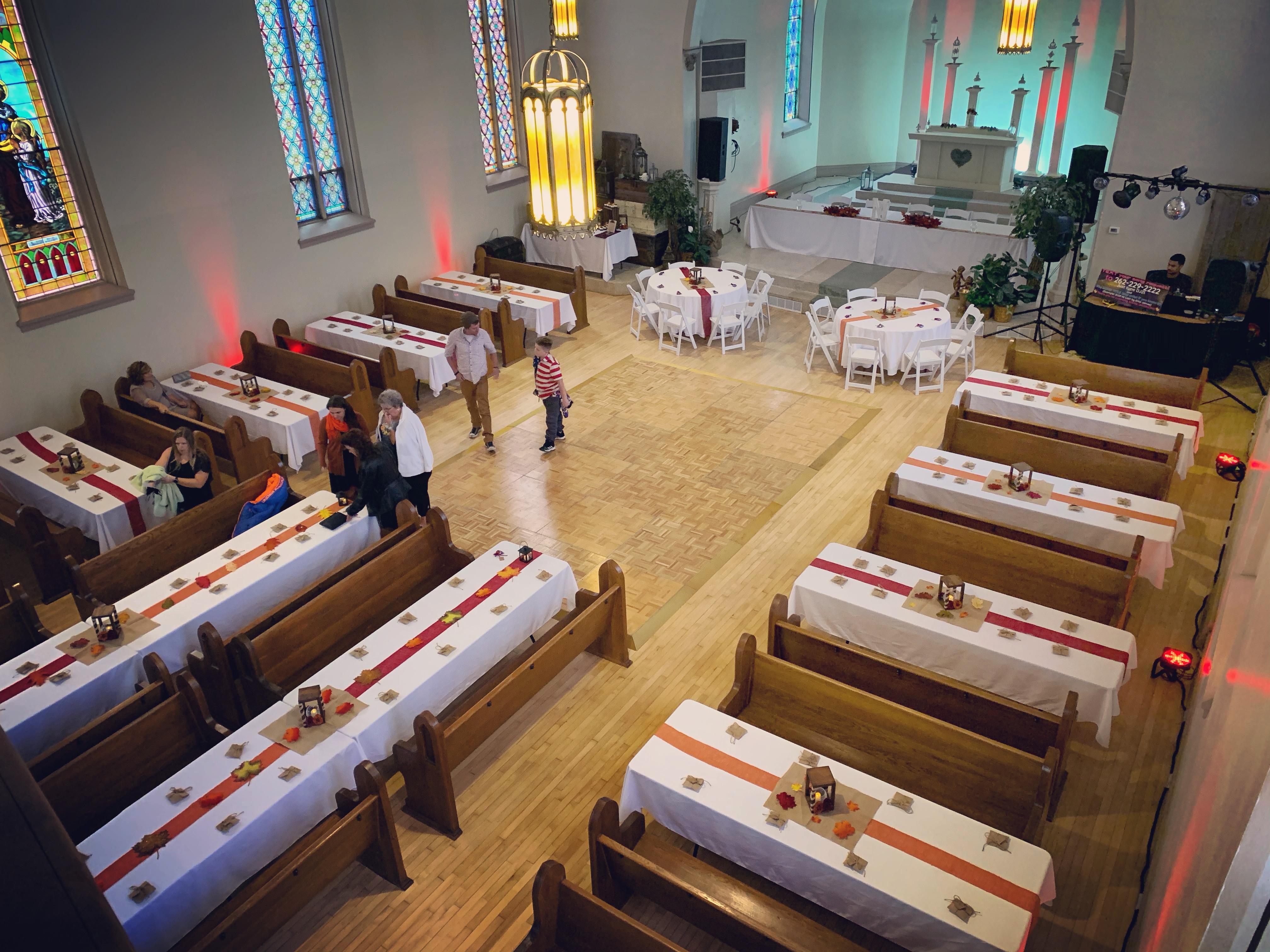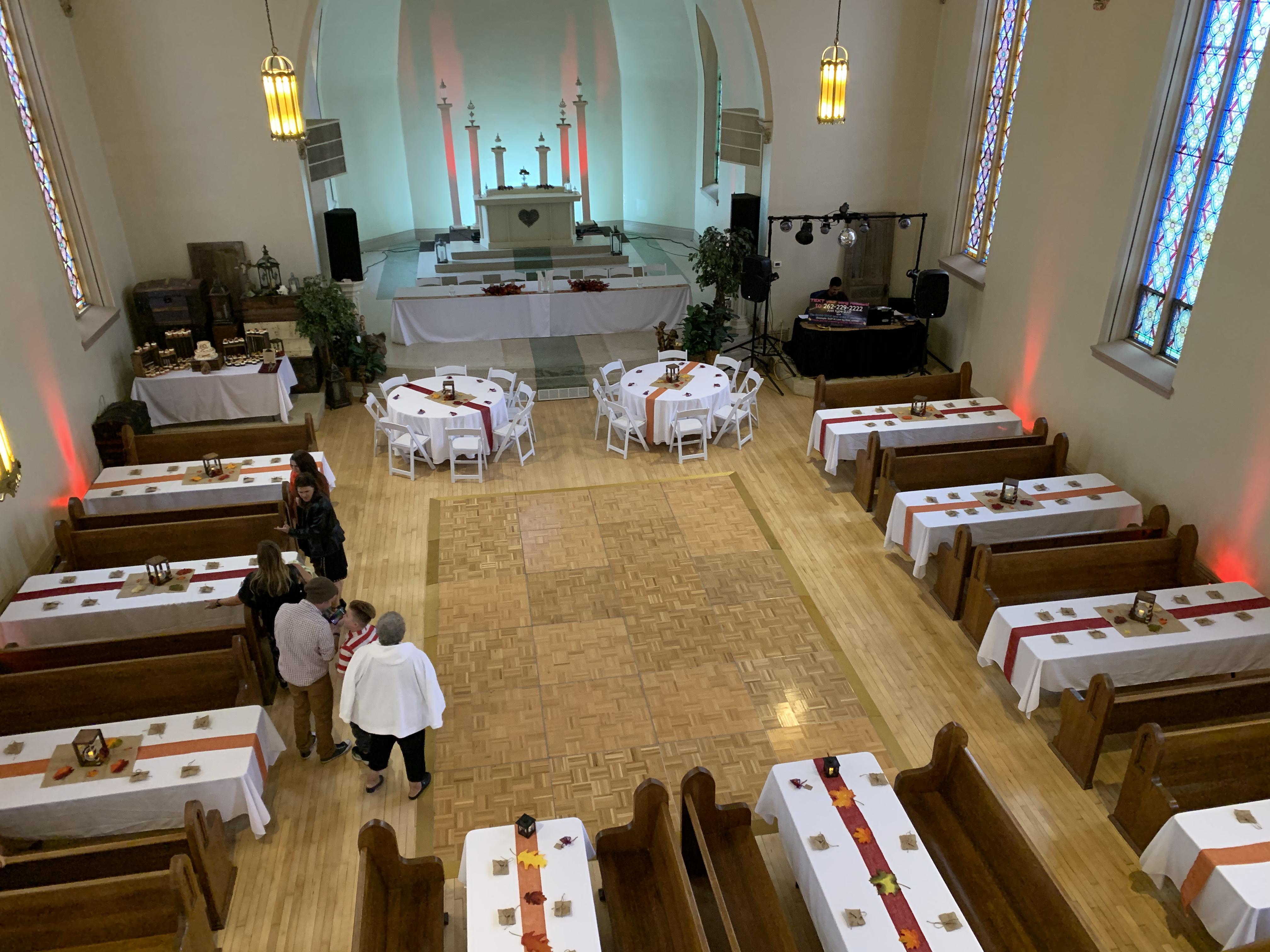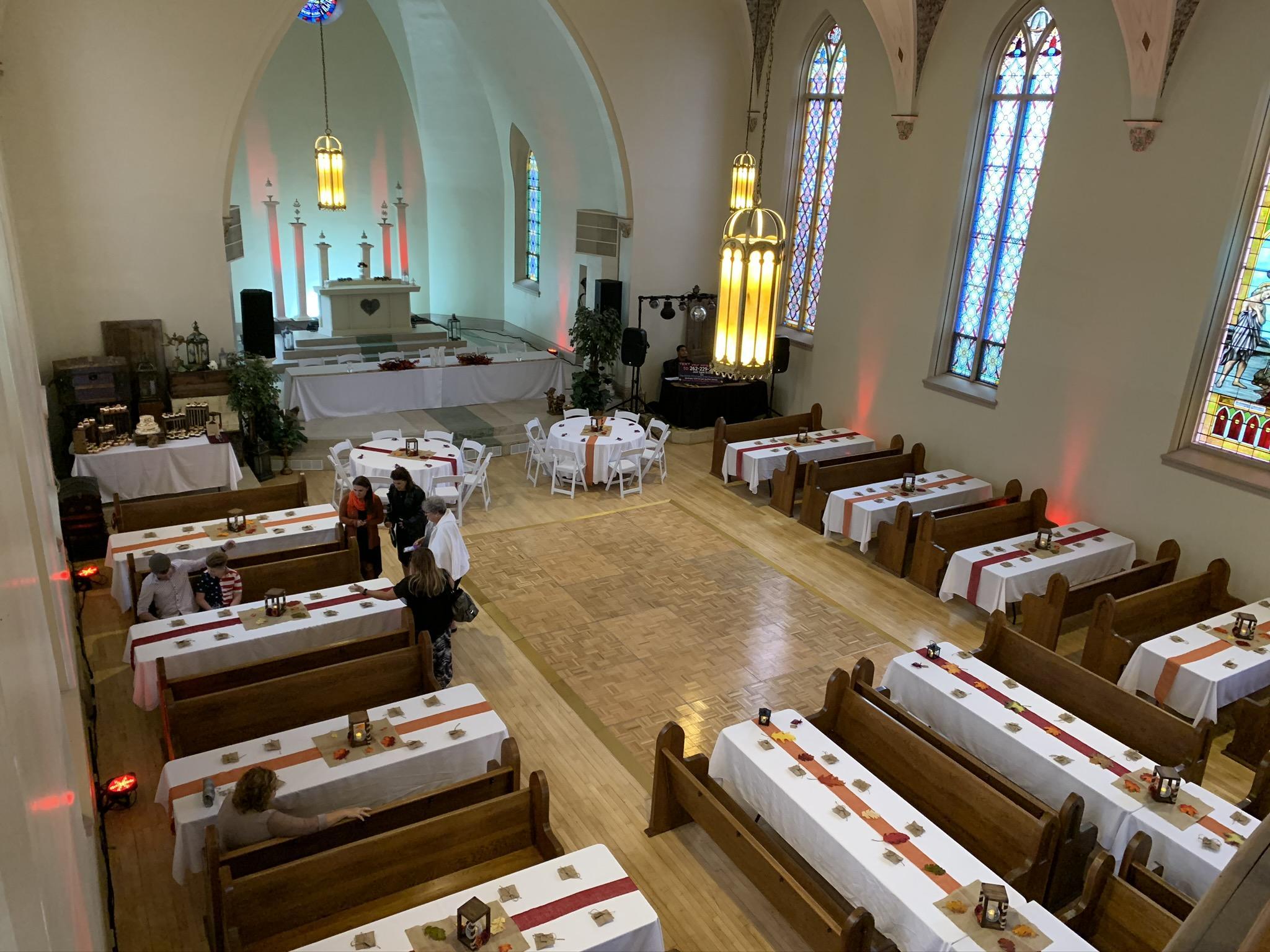 Dimmers for lighting, original chapel pews able to be adjusted in numerous ways, upper level balcony bar, lower level get ready space with overflow event area