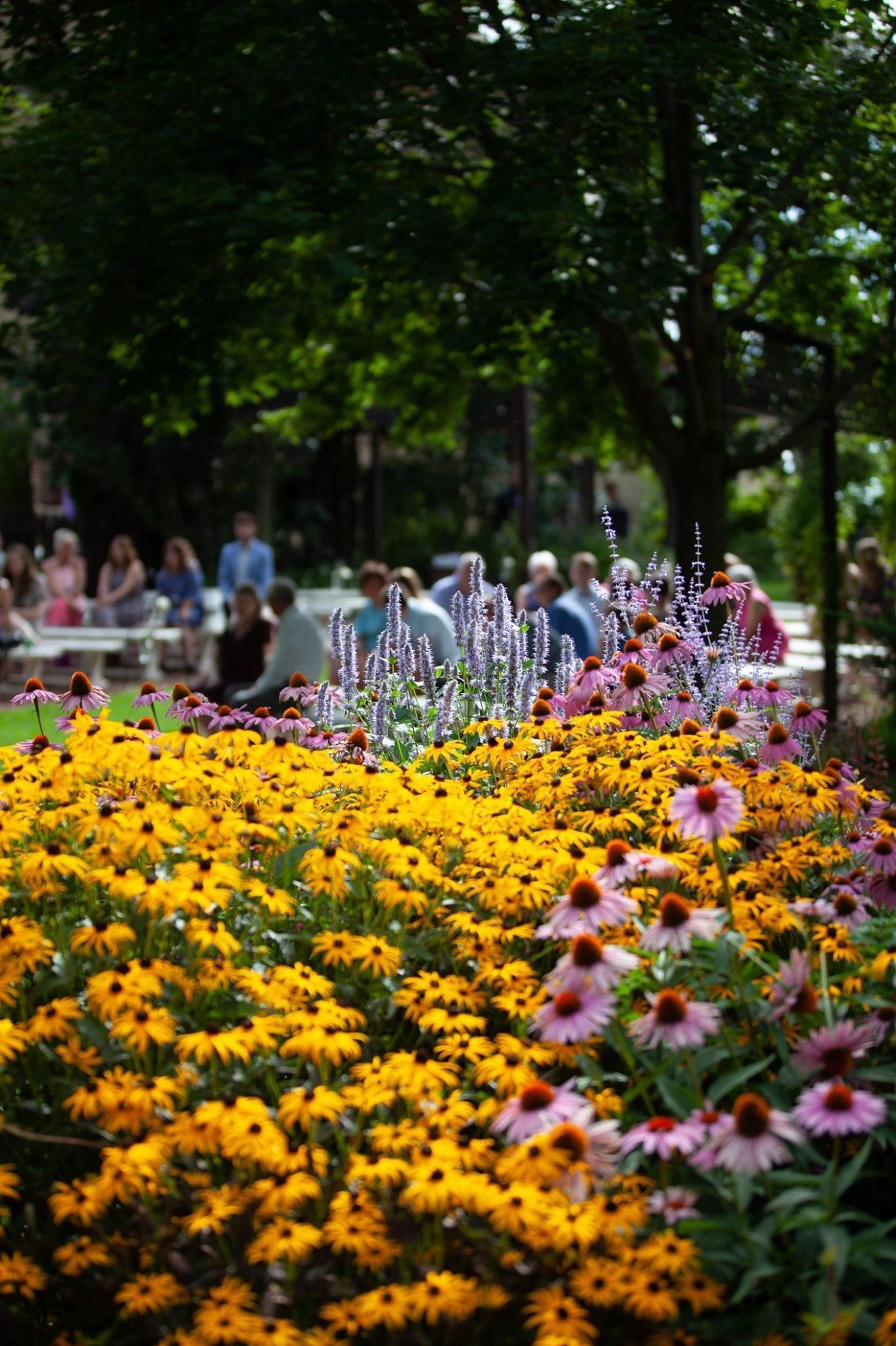Bench seating, lush floral gardens and a raised altar