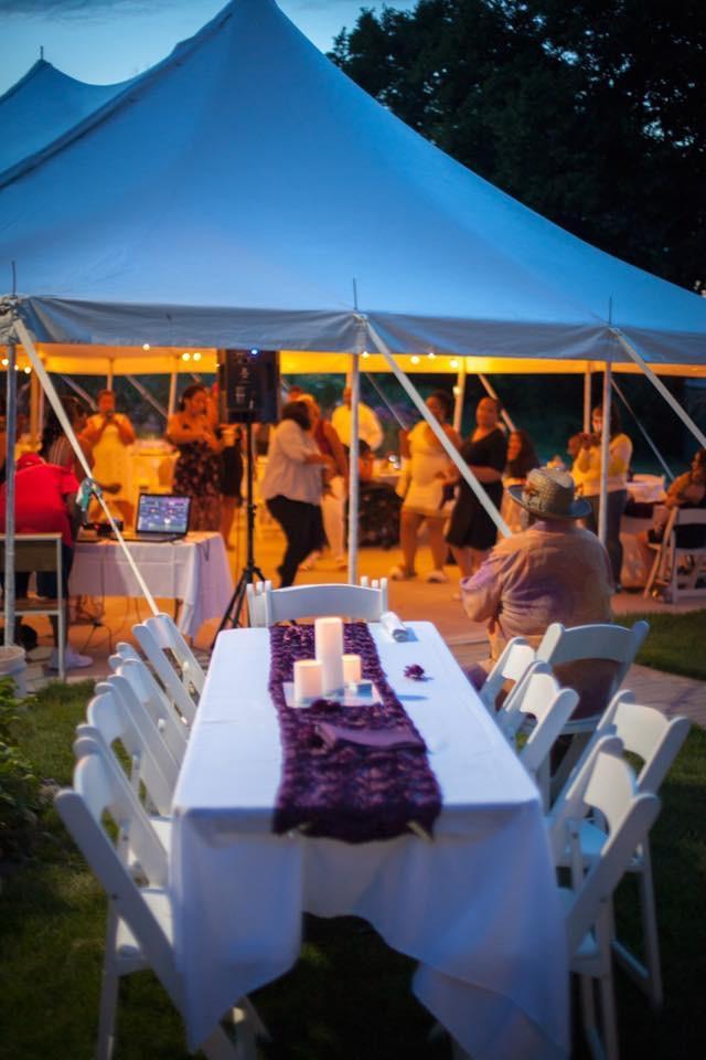 Chairs and tables for 150, bistro lighting, adjacent gathering space, ADA compliant portable restroom