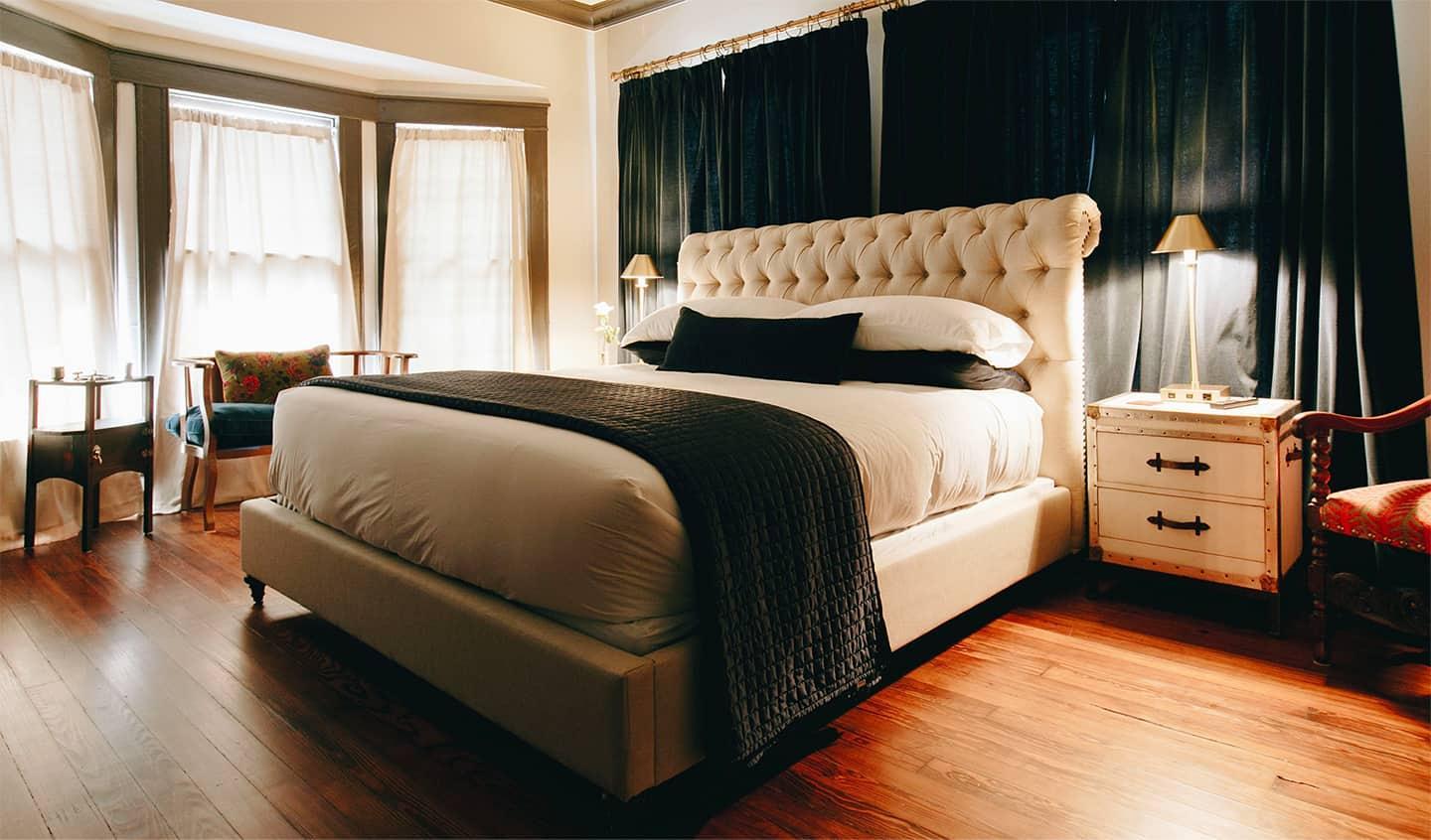 The home was turned into a boutique hotel and wedding and event center with 5 bedrooms, 5 ½ bathrooms. Eastham "The Bridal Suite" (clawfoot tub w/ stainglass windows) Dealey "Presidental Suite" Dentzel - (smallest w/ queen) "Fair Park" with biggest bathroom and balcony Adair - The Western Suite Varco - Nod to Texas Industry