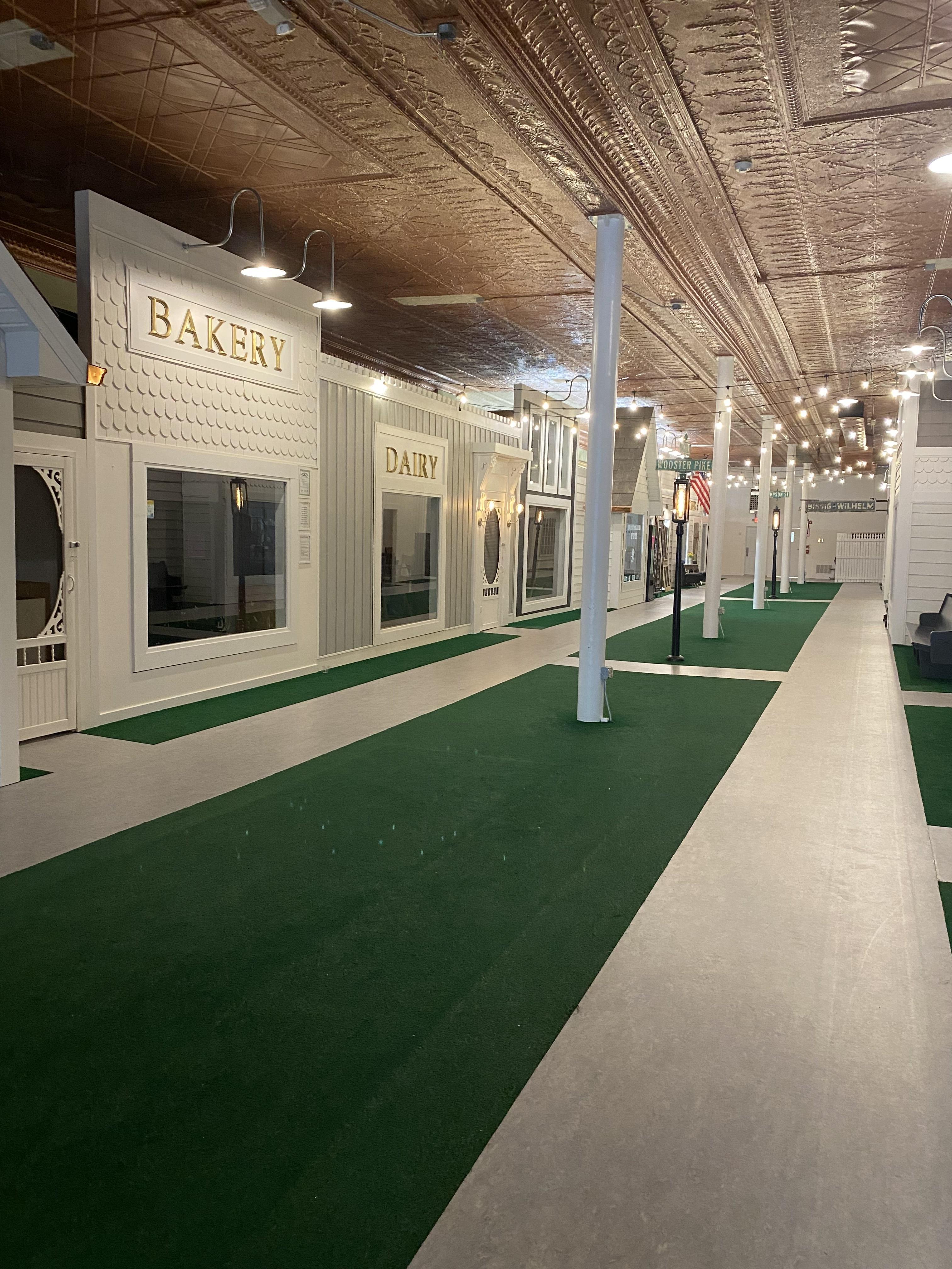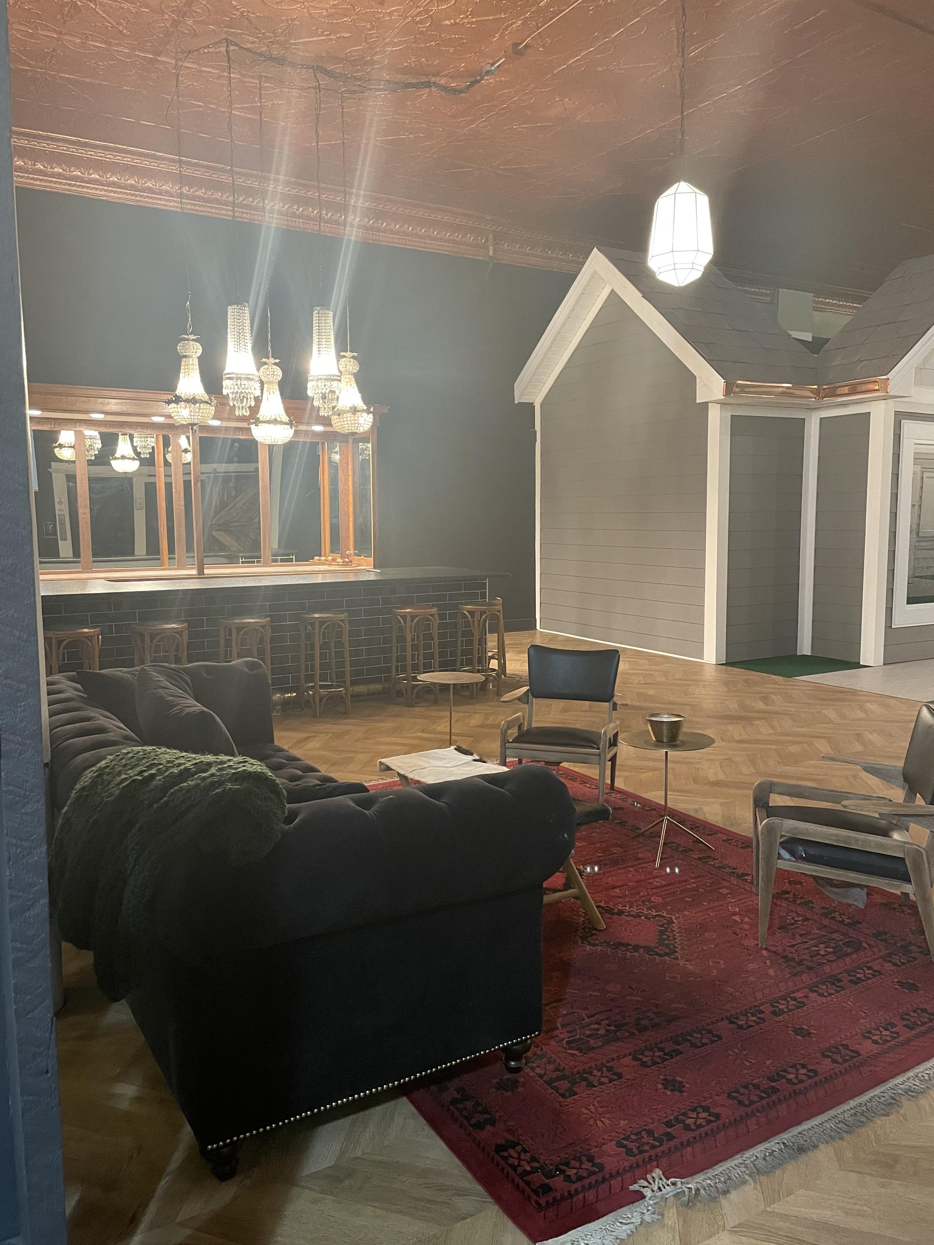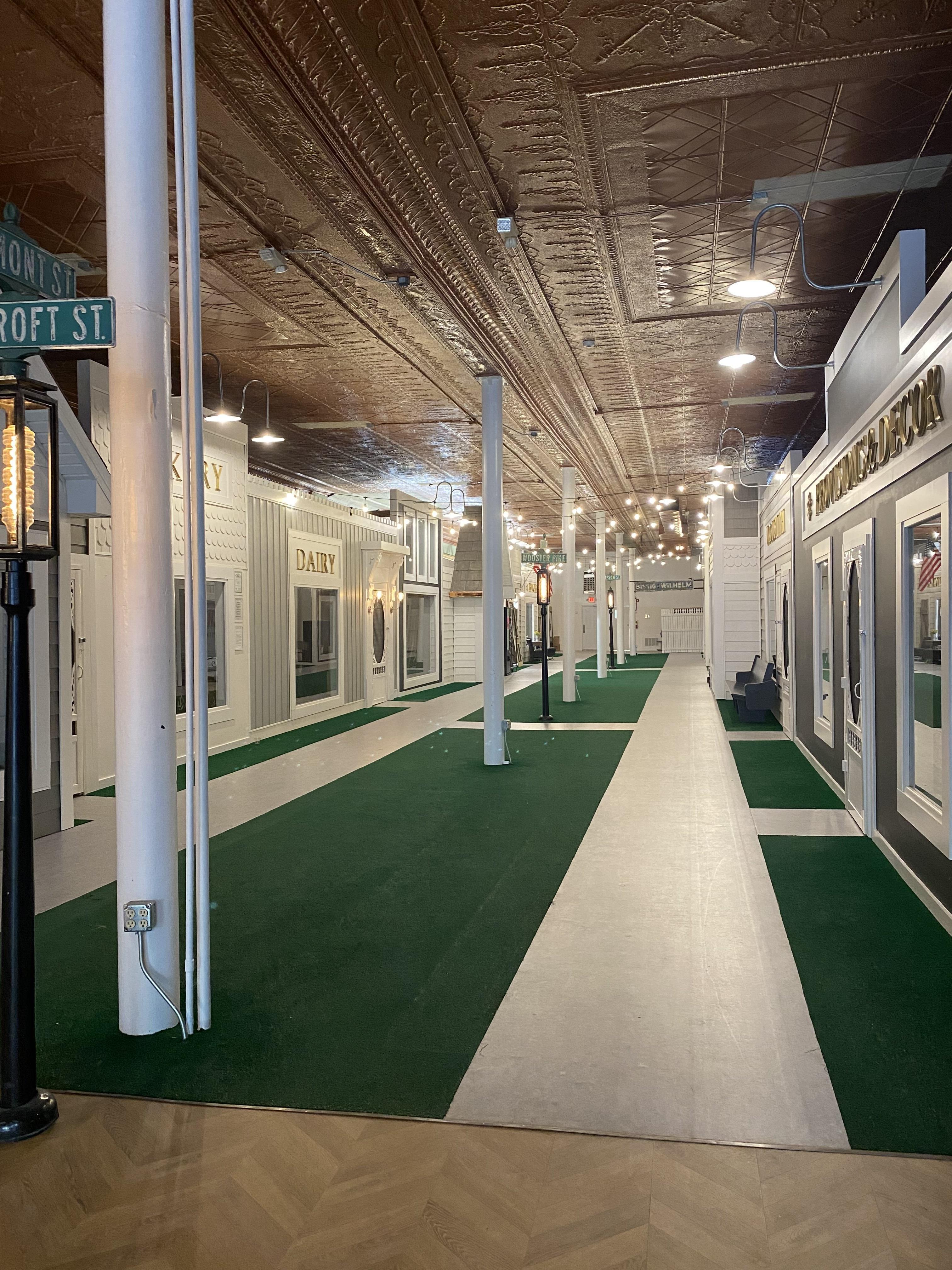 This space features a town look in the back, but in the front a bar that matches the look of the second level. Your guest will be delightfully surprised with this space.