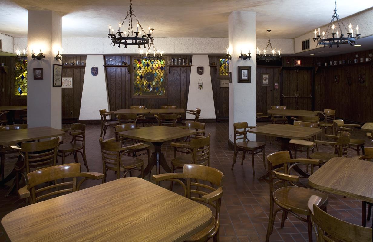 The German Society's Ratskeller is a cozy dining room with a traditional, old-world ambiance. The room includes wooden tables and chairs that can seat up to 45. Larger tables and chairs may be brought in to seat up to 80. The room comes with an attached kitchen with refrigerator, oven, microwave, and industrial dishwasher, as well as a 26' wet bar with two refrigeration units and 8 bar stools.