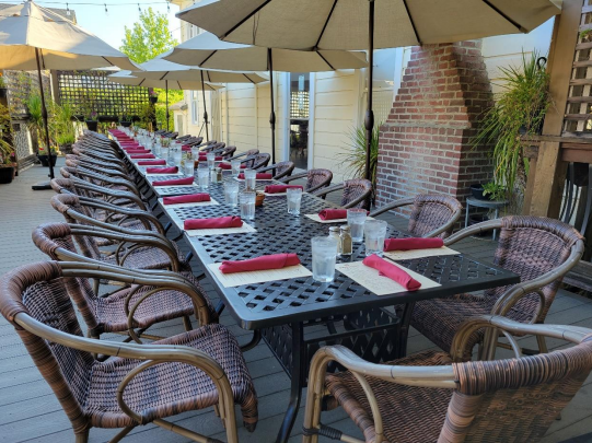 This space features a full bar, with ample indoor and outdoor seating, perfect for hosting a variety of events including private gatherings, corporate meetings, rehearsal dinners, and more.