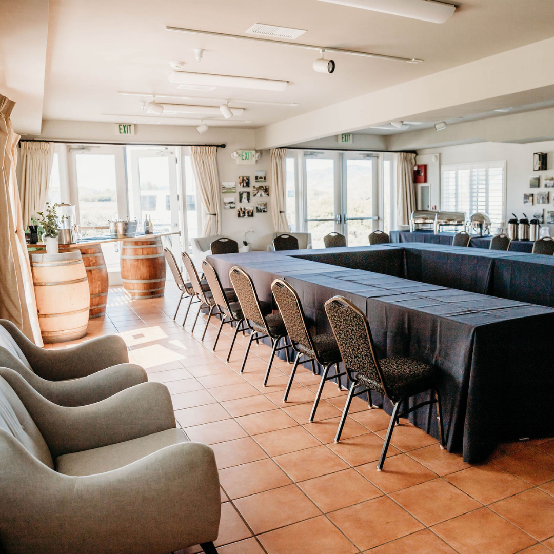Spanning 825 sq. ft, this venue offers both indoor and outdoor spaces, each equipped with 2 bathrooms and scenic views of the surrounding vineyards. The indoor area comfortably accommodates 45 guests, while the outdoor space can host up to 80, making it an ideal choice for events such as cocktail hours or bridal brunches!