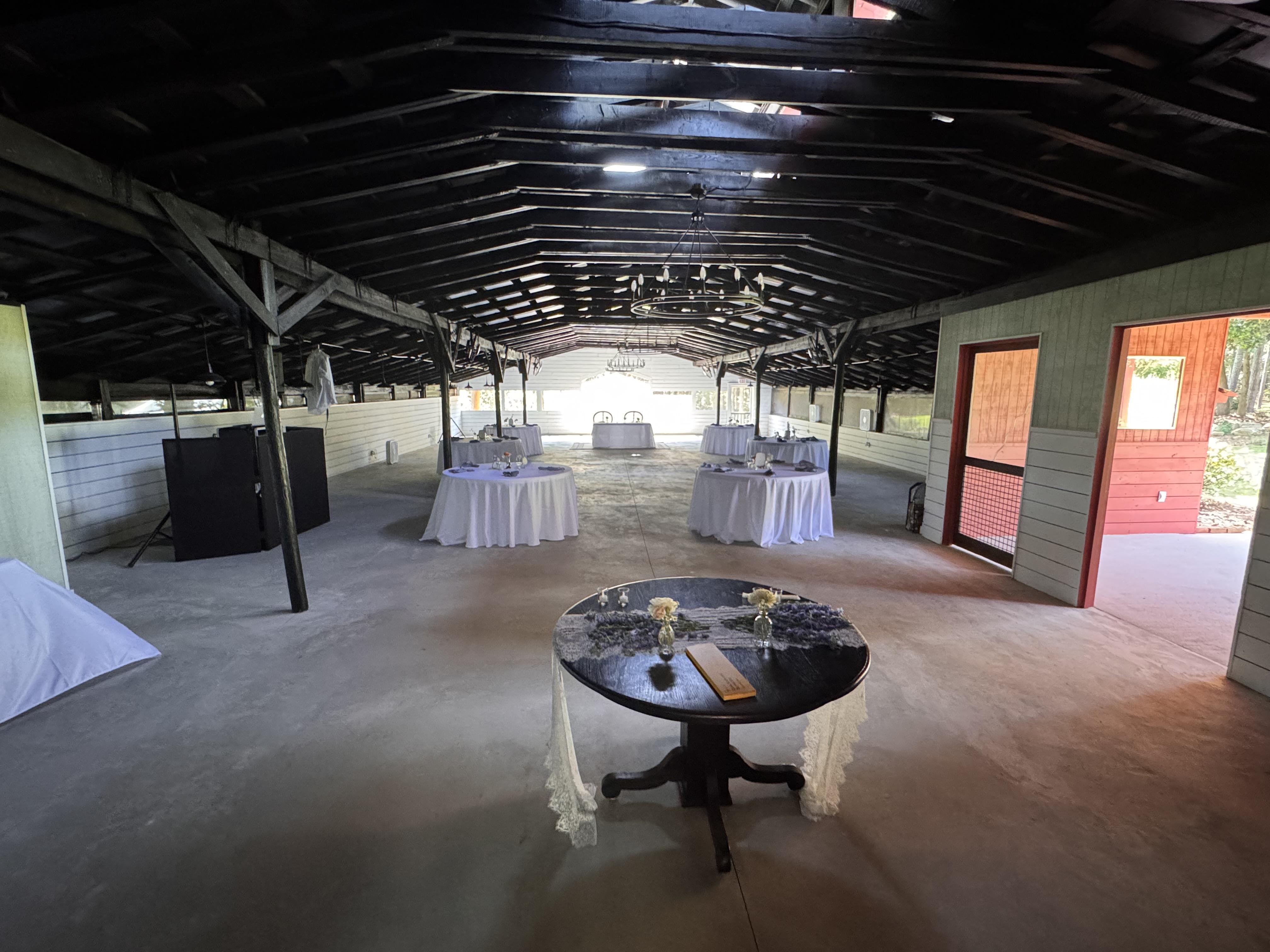 The Serenity Hall Barn is a Rustic Chic style refurbished chicken house! There is ample space for up to 120 guests seated & a dance floor. The building has two bathrooms and a large hall for the reception, two bathrooms and a food prep area. White washed wooden walls, with a black ceiling that includes two open air copulas, with sage green walls make this a perfect backdrop to create a magical place for your guests to enjoy