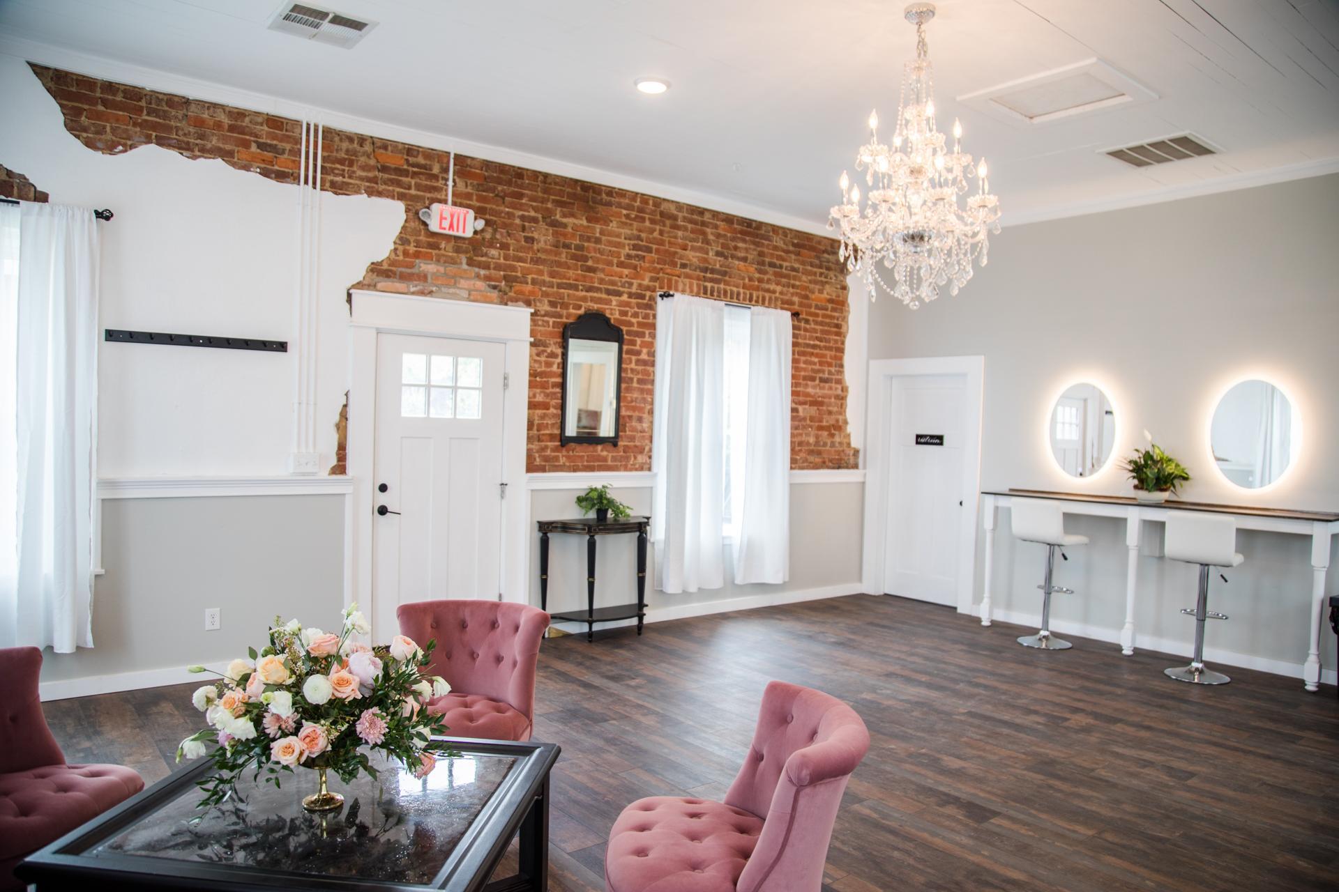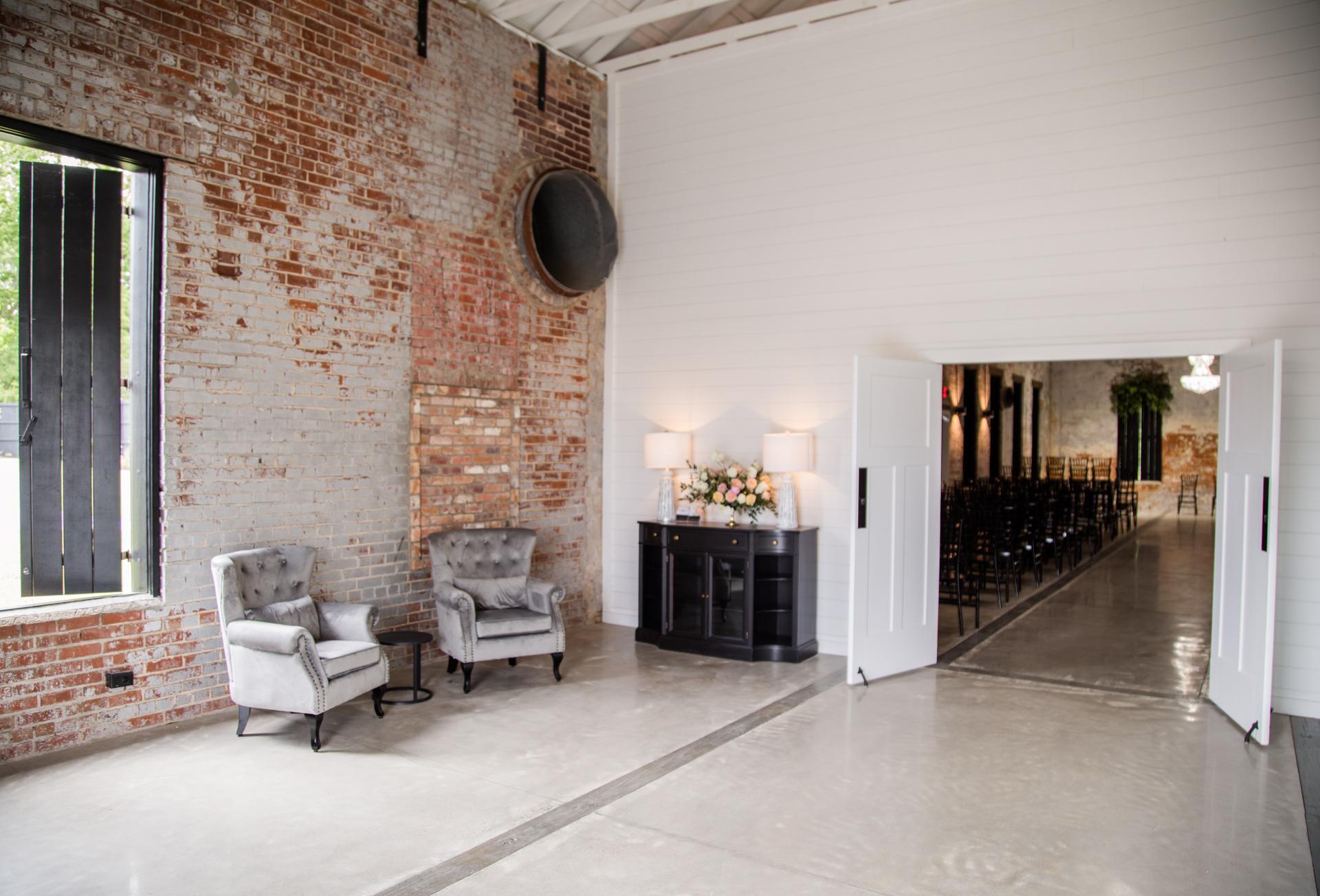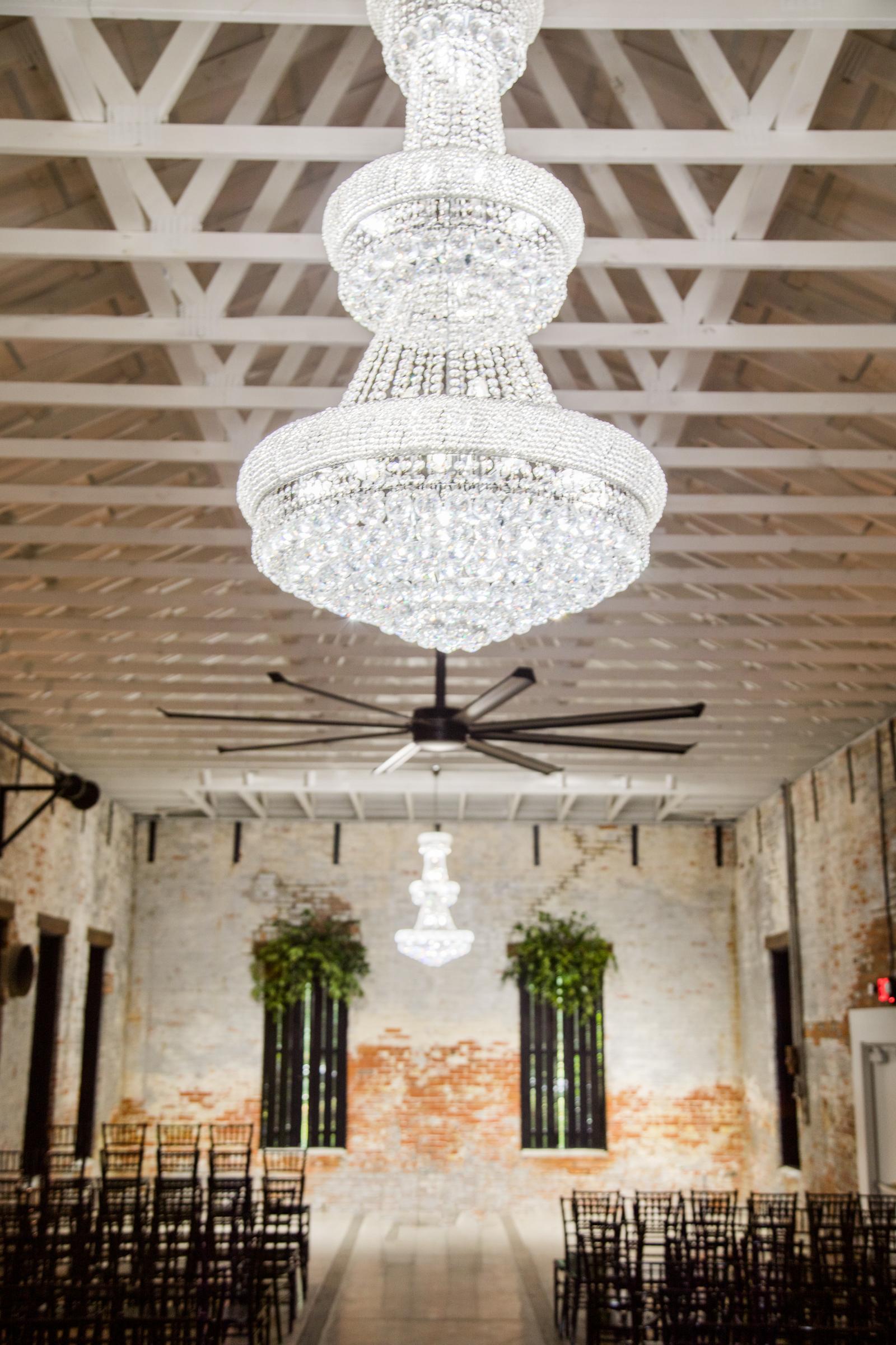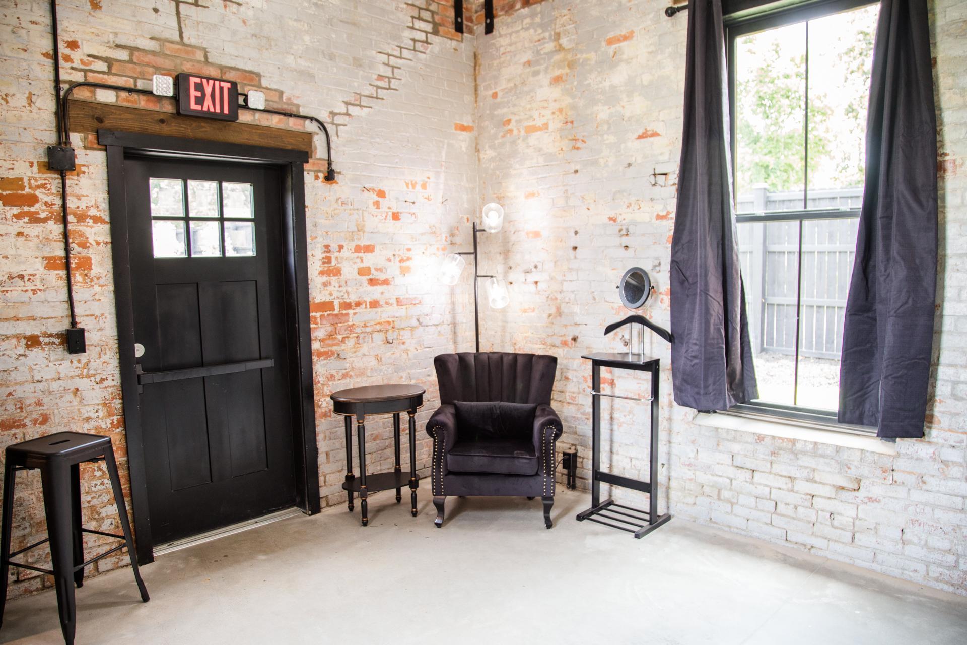 The bride and her bridesmaids will get ready for the big day in the Bridal Suite located in its own separate building. The 800-square-foot space has dazzling chandeliers throughout, yet continues with the industrial brick-and-mortar walls that are a trademark of these historic buildings. This is a large space and a perfect place to spend the day getting ready with your friends and family.