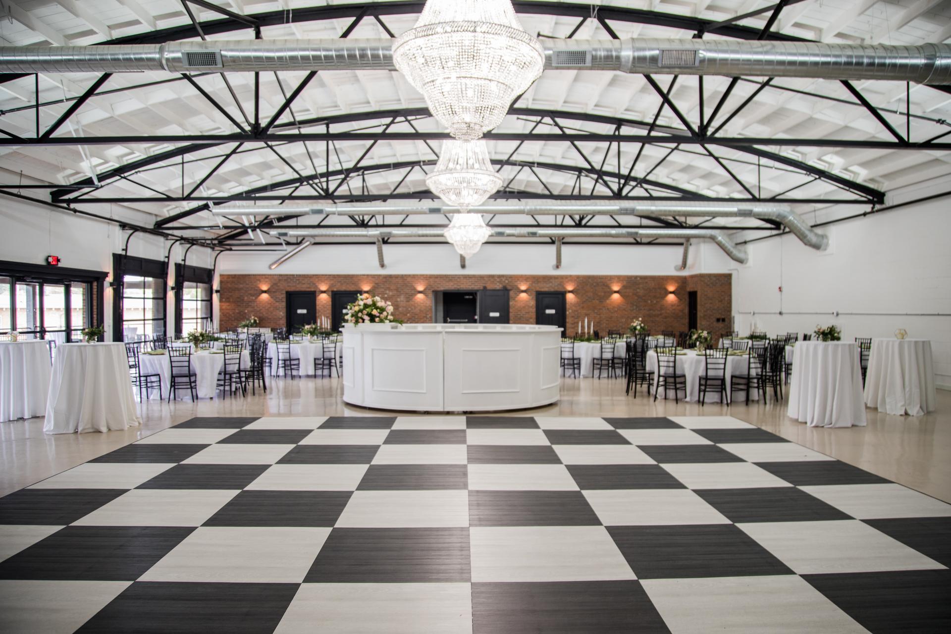 -Temperature Controlled -Large Elegant Restrooms -Prep Kitchen for Caterers -White Wooden Bar -Roll-Up Glass Doors -25’x25’ Black & White Dance Floor -Three 6’ Sparkling Chandeliers -Ten 72” Round Tables with Linens -Eight Cocktail Tables with Linens -120 Black Chiavari Chairs -Four 9’ Rectangular Tables for Catering (Linens Not Included)
