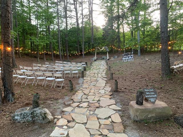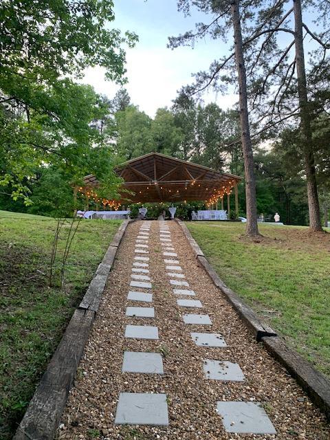 Great outdoor space in a magical wooded glen of trees and lights - adjacent is a 40X60 covered wedding pavilion with a fire pit - all set in a secluded, wooded area with large open fields, as well. Couples may have their ceremony in a wide open field surrounded with trees - totally private - or in the Glen, a magical forest of trees with a stone path.