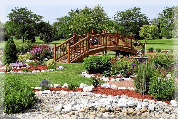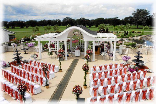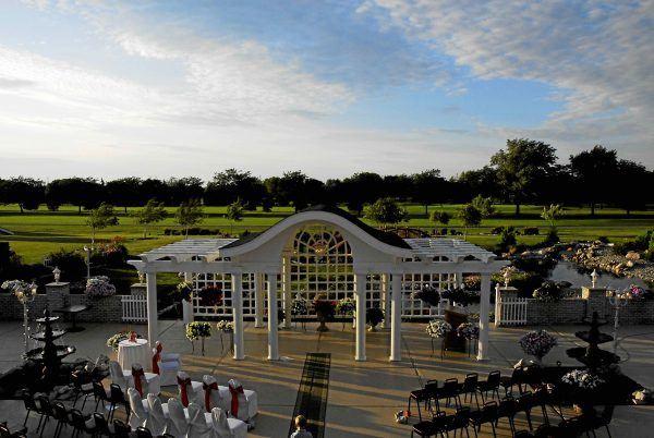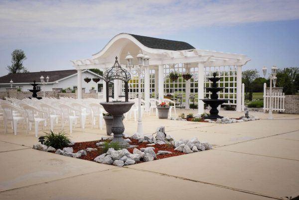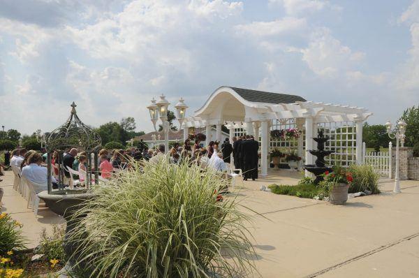 The outdoor gazebo offers a nontraditional option for a wedding ceremony venue. The gazebo is a completely decorated area with a seating capacity of up to 200 guests. The aisle is lined with white petunias on wrought iron stands. The arch is covered in beautiful vines, and the aisle is covered with a soft green runner. The garden area includes unique hanging baskets, window boxes, and large urns of flowers to enhance the floral beauty.