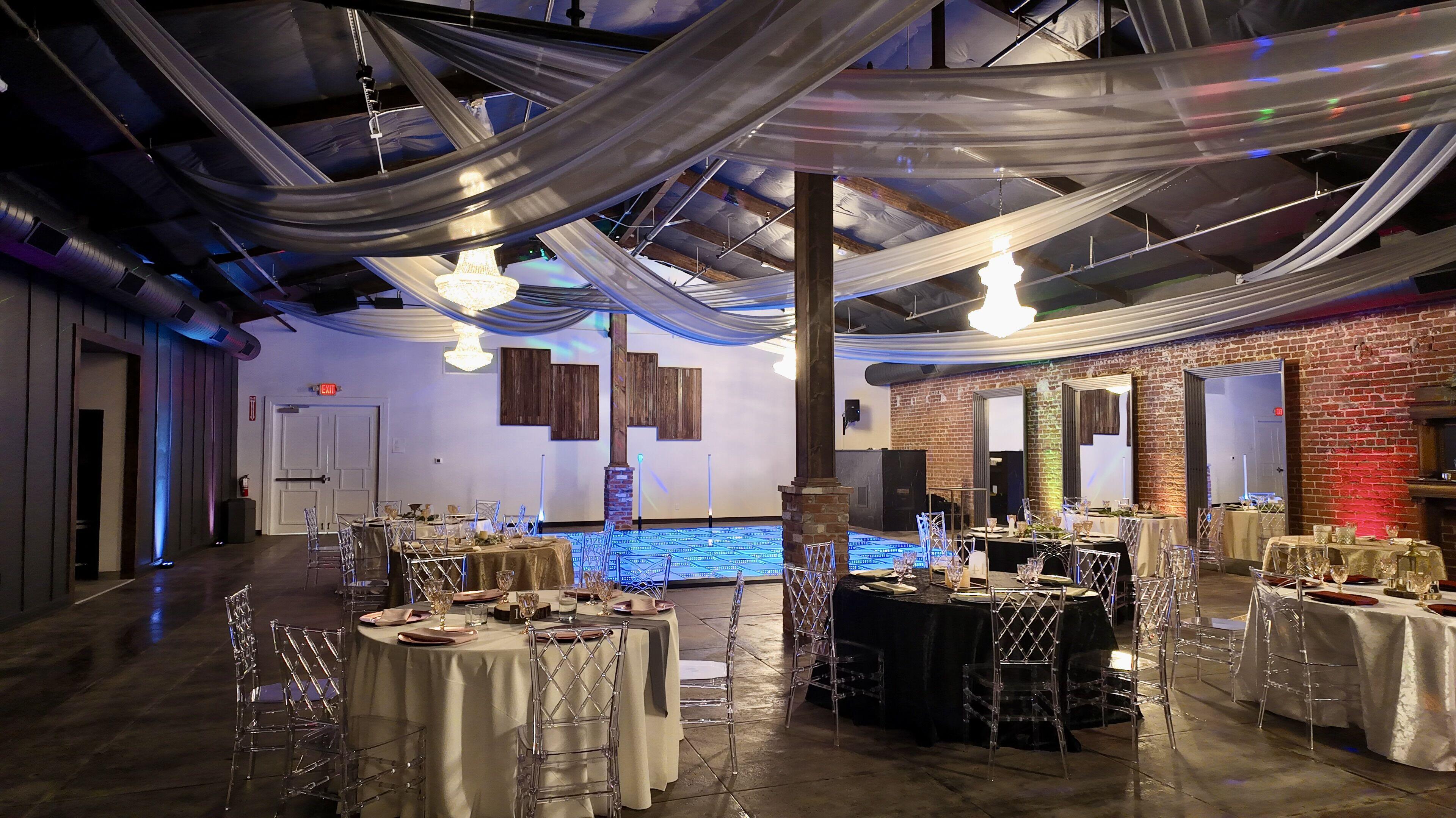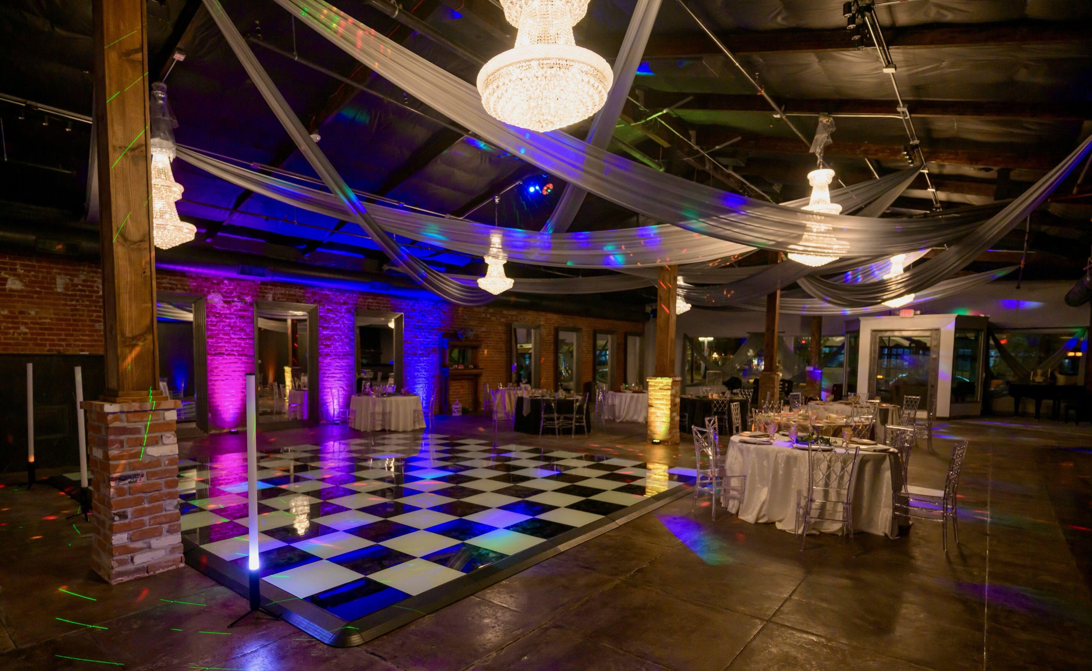 The Grand Tucson event center is a spacious and elegant venue with a modern yet classic feel. The exposed brick walls, high ceilings, and glittering chandeliers create a warm and inviting atmosphere, perfect for weddings and other related events. The space is versatile enough to accommodate a variety of events, from receptions to ceremonies. The colorful lighting and checkered dance floor add a touch of excitement and fun, making it the perfect place to celebrate your special day.