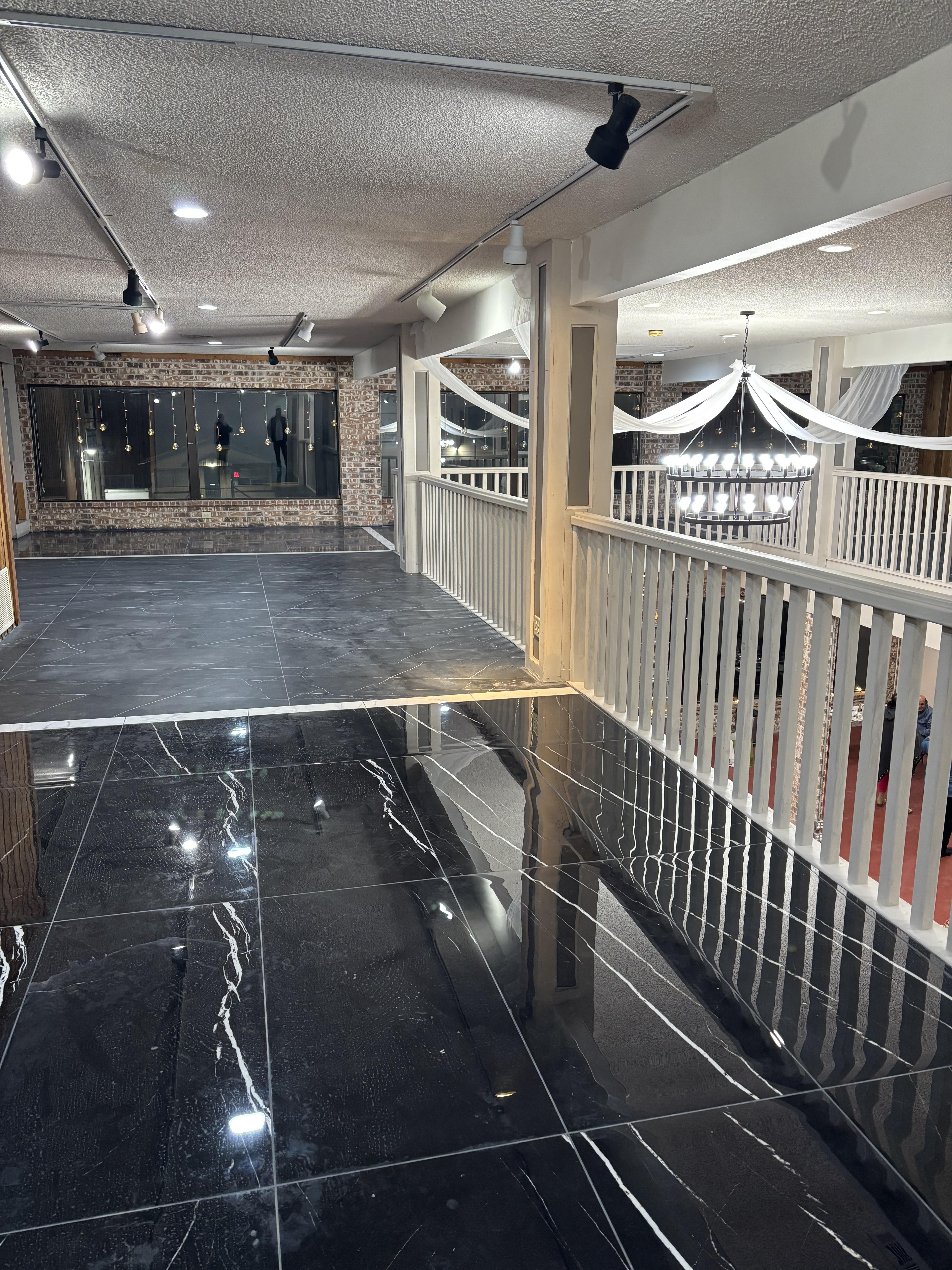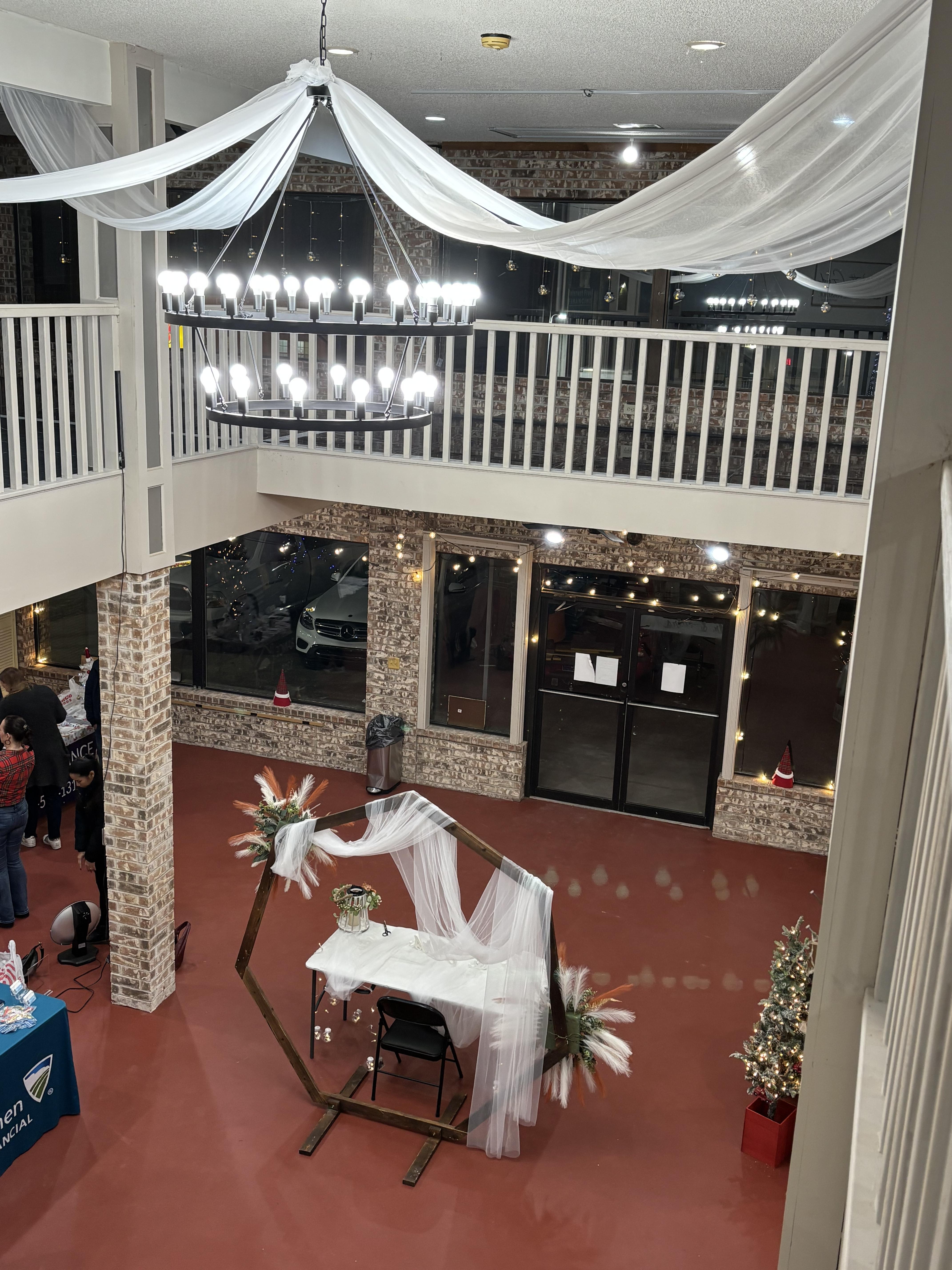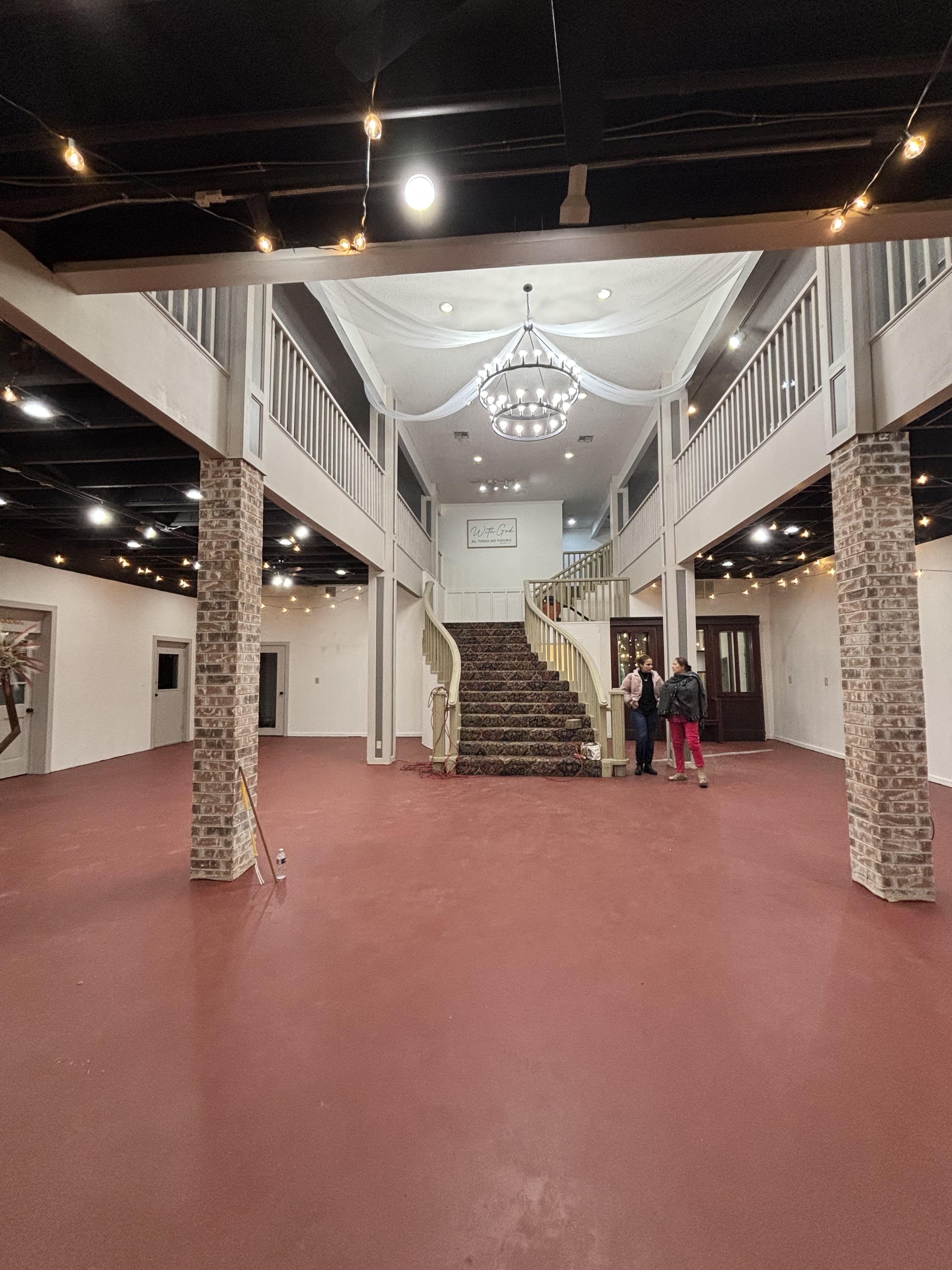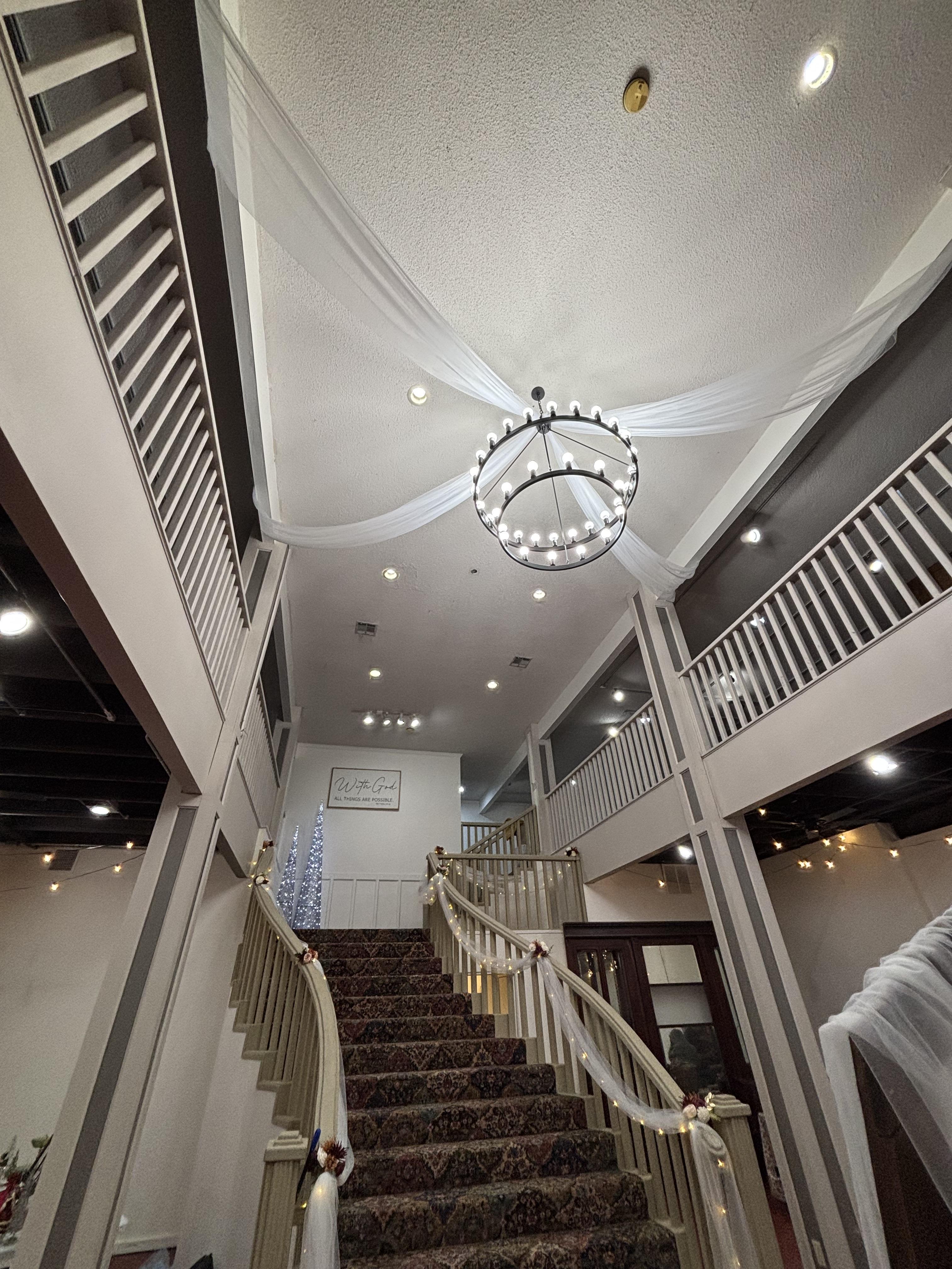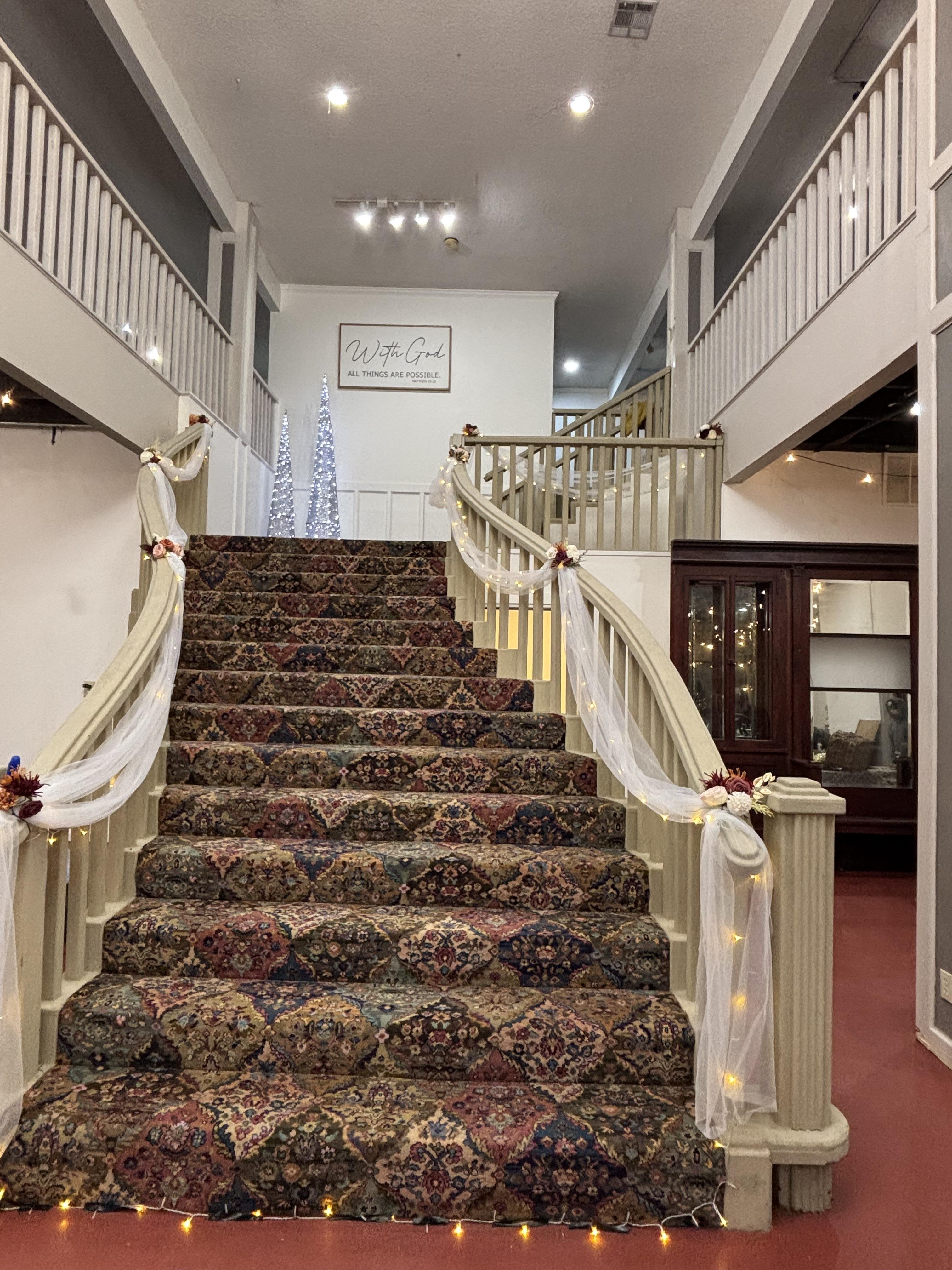 The Grass Plaza is located on historical Route 66. A place where urban charm meets timeless glamour with a fairy tale like ambiance, elegant chandelier & vintage glam. It features intimate weddings and large celebrations. Our stunning staircase, adorned with timeless elegance, creates the perfect setting for your grand entrance and unforgettable photos. Imagine descending these steps as newlyweds, surrounded by the ones you love most. Make a grand entrance down our iconic staircase. Step into your happily-ever-after With the Grass Plaza!