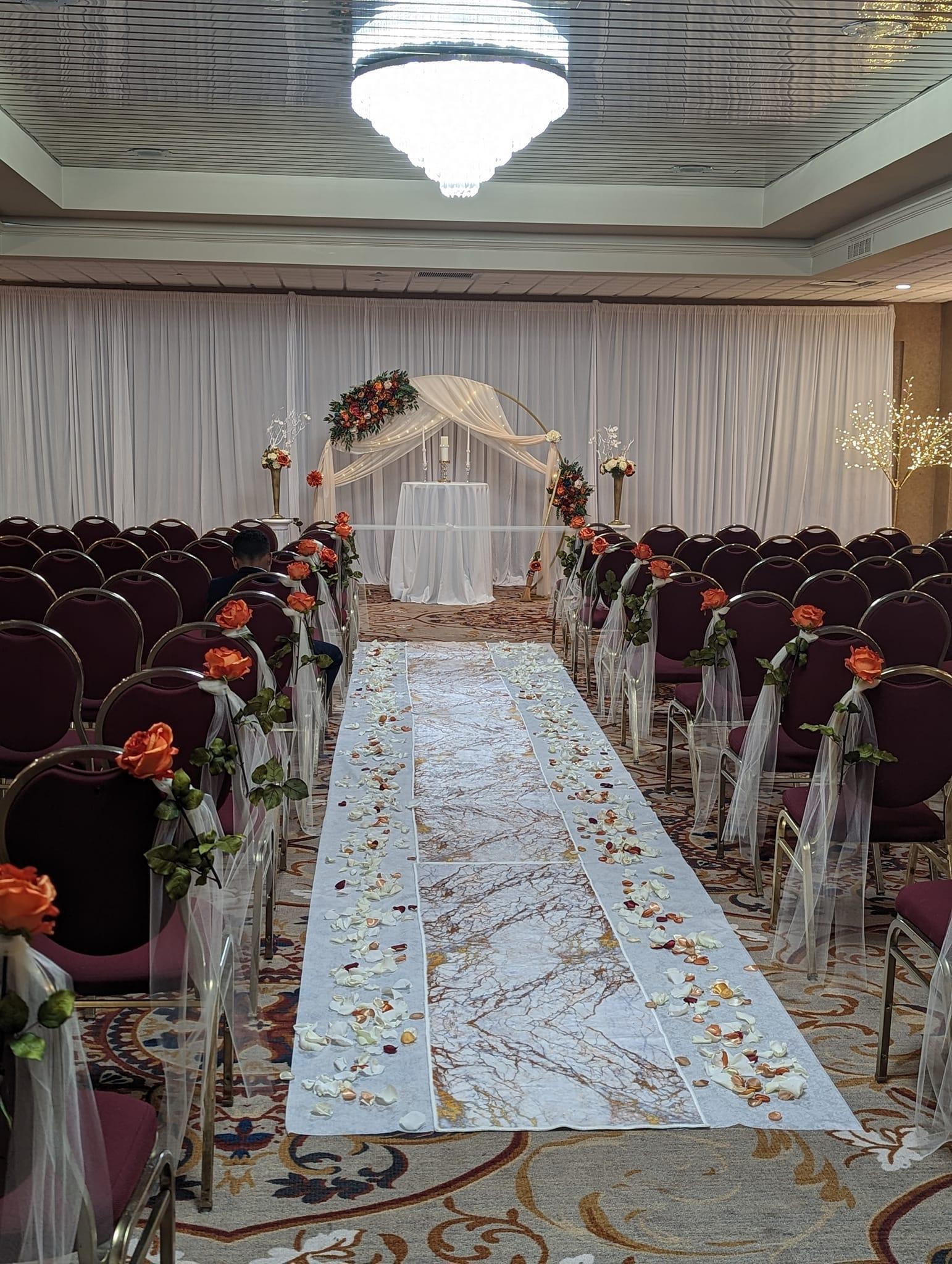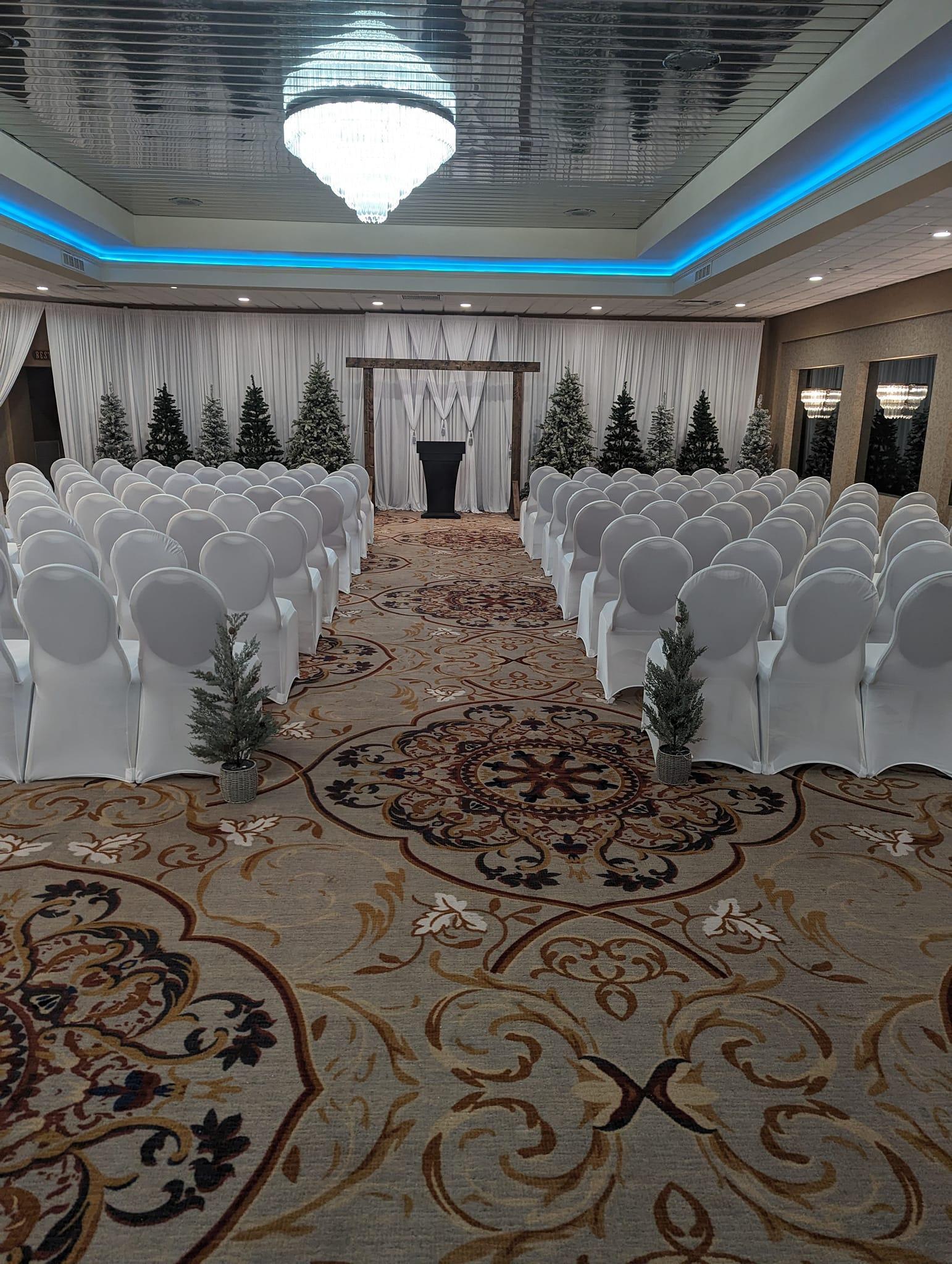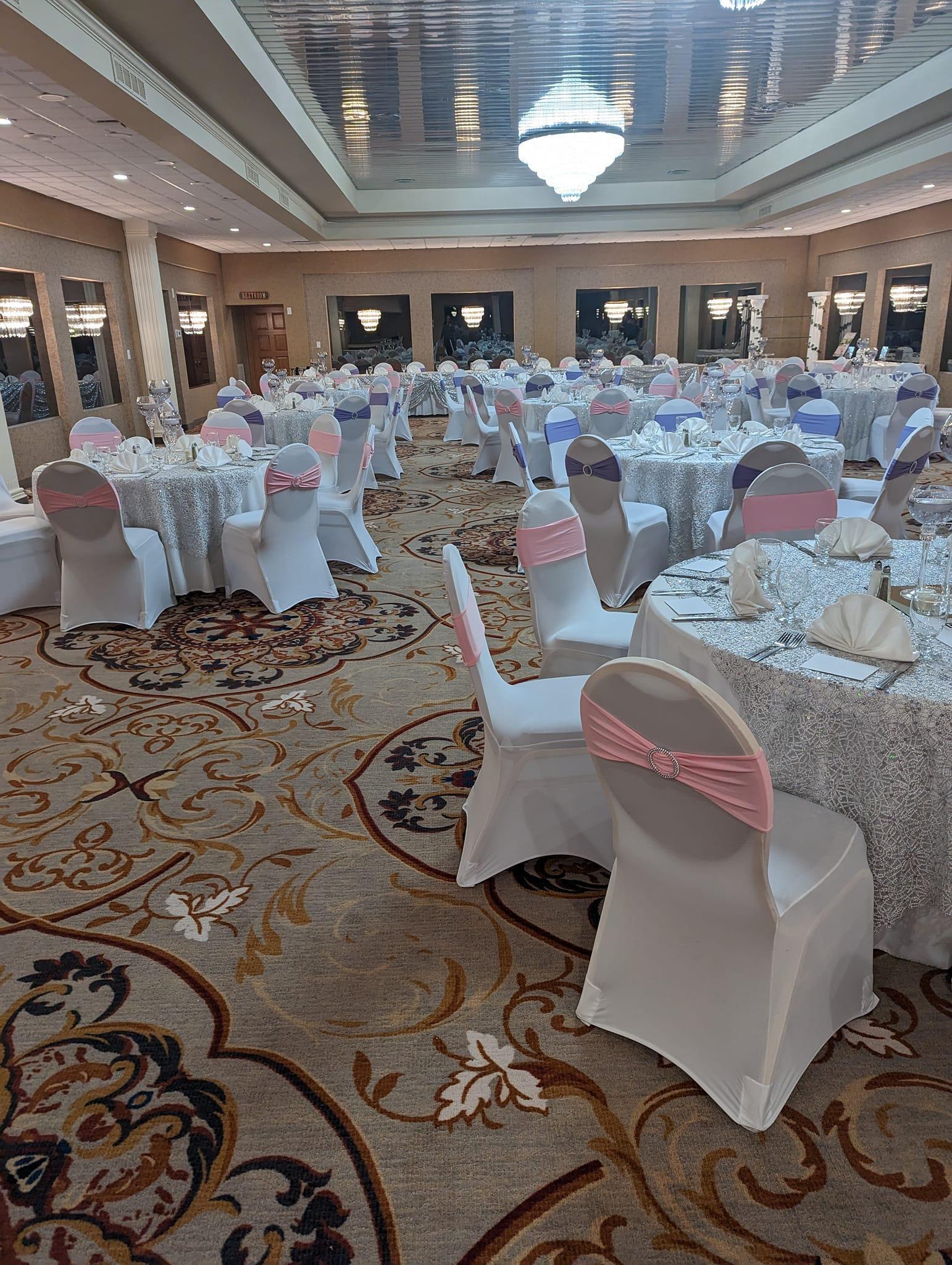 Music by our DJ, Fireworks, & dancing on a cloud for your first dance, Love/ Mr & Mrs Leg Letters, Up Lighting around the Reception Room, Projected Cus tom Monogram. White Chiavari Chairs, Full Length Specialty Linen, Select Color Napkins, Specialty Head Table Design, Custom Back Drop & Chargers, Photo booth, In House Centerpieces. Cake Cut & Plate Bridal Party Champagne Toast, Free Parking Premium Bar.