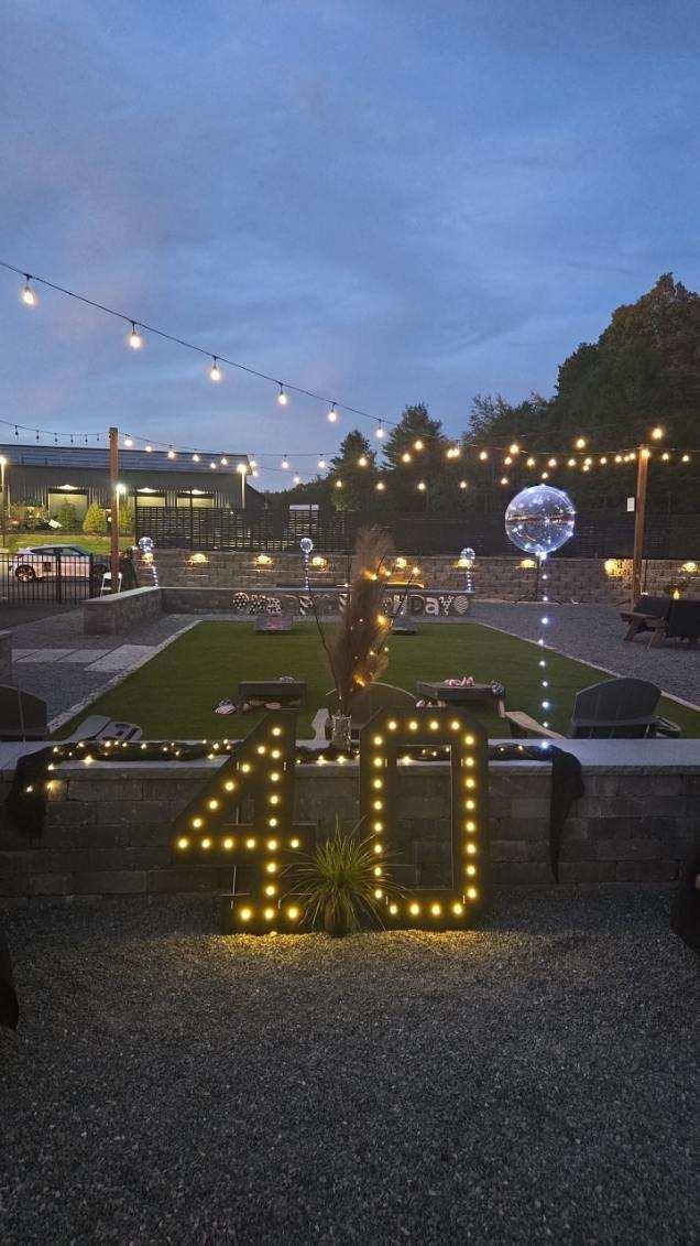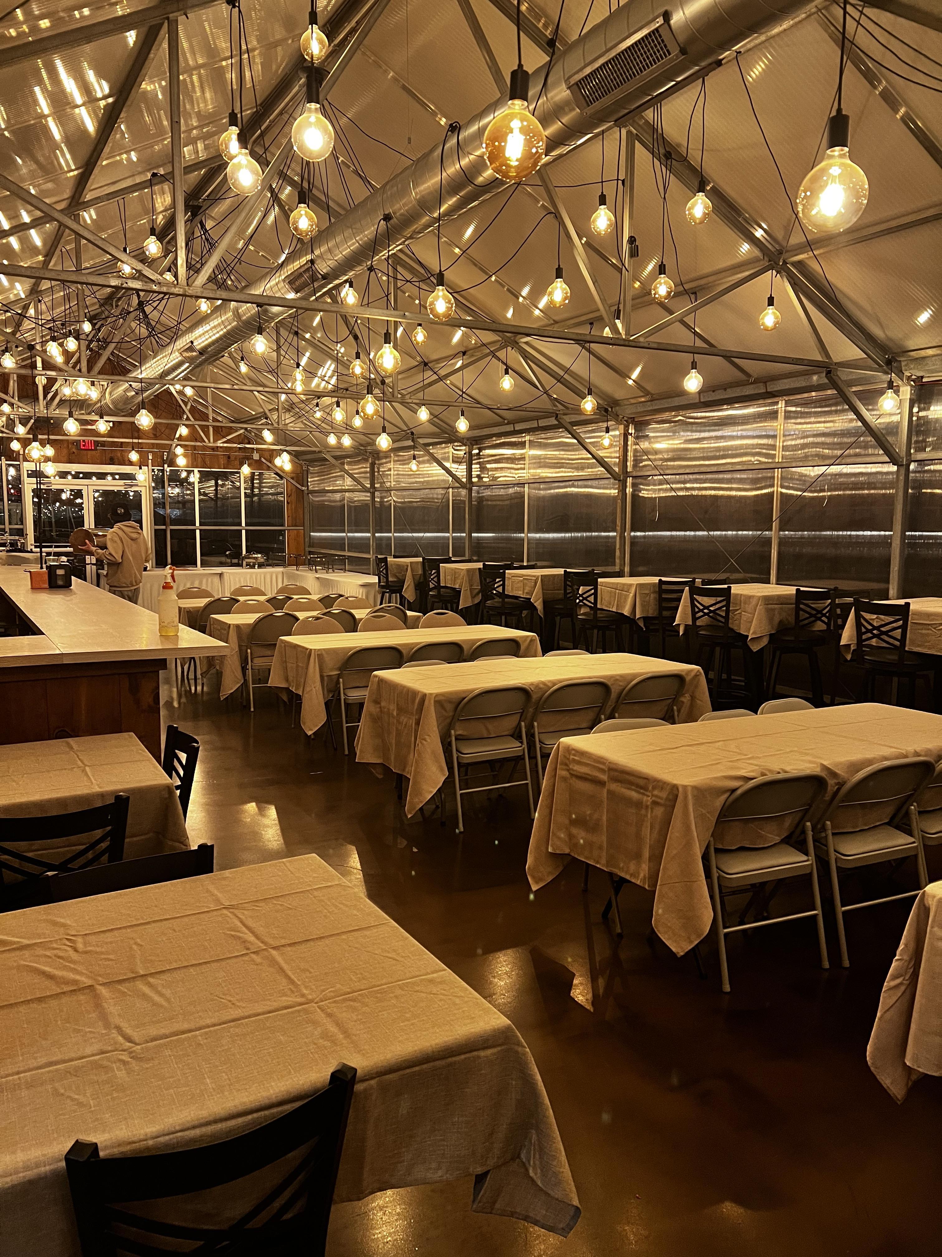 This space features 1000 sq ft of space with a long bar, ample natural light during the day along with 114 hanging bulbs to create a magical ambiance at night. Just outside the doors enjoy an amazing hardscaped area with a huge gas firepit, gazebo and area for a ceremony, outdoor dining space or some backyard games.
