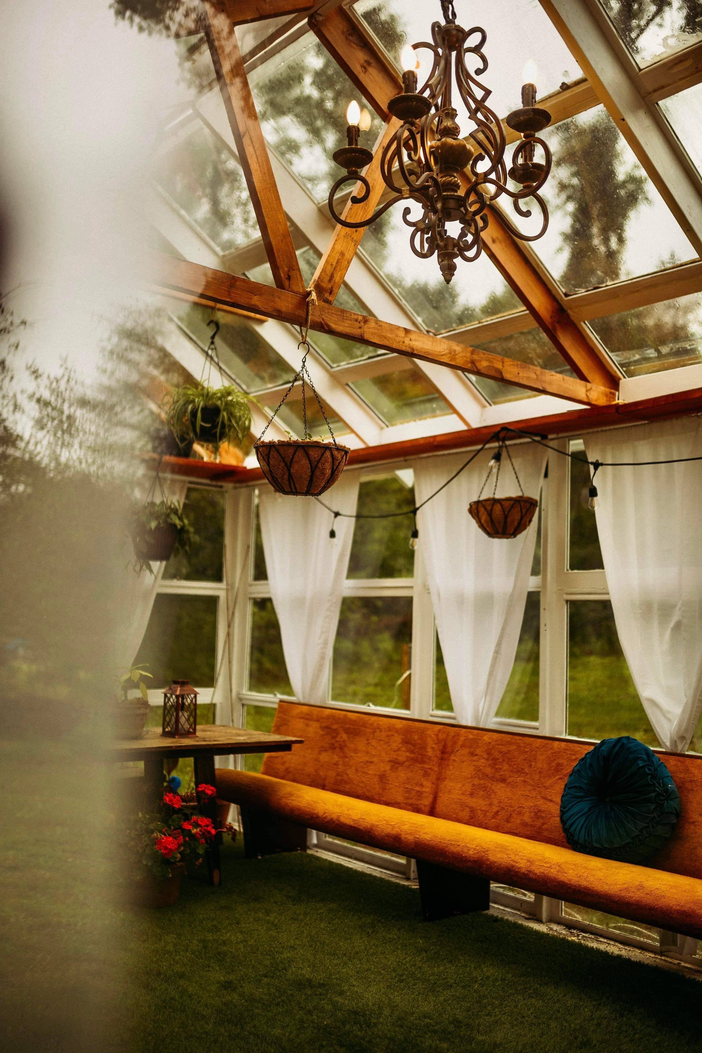 This space offers heating and air conditioning and all sides and the ceiling are windows providing great views of the trees. Curtains on literally every side of the greenhouse providing a very cozy romantic vibe.