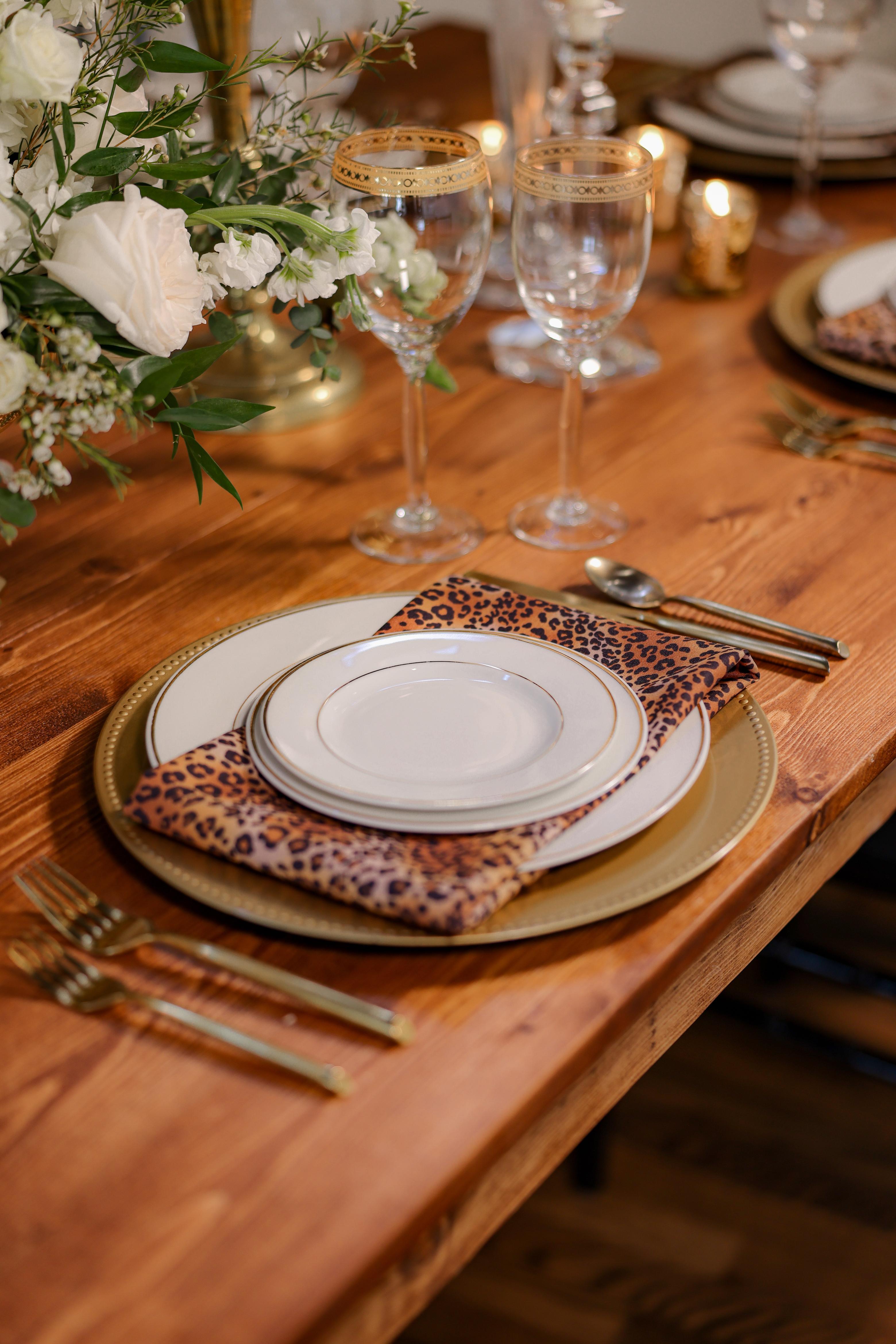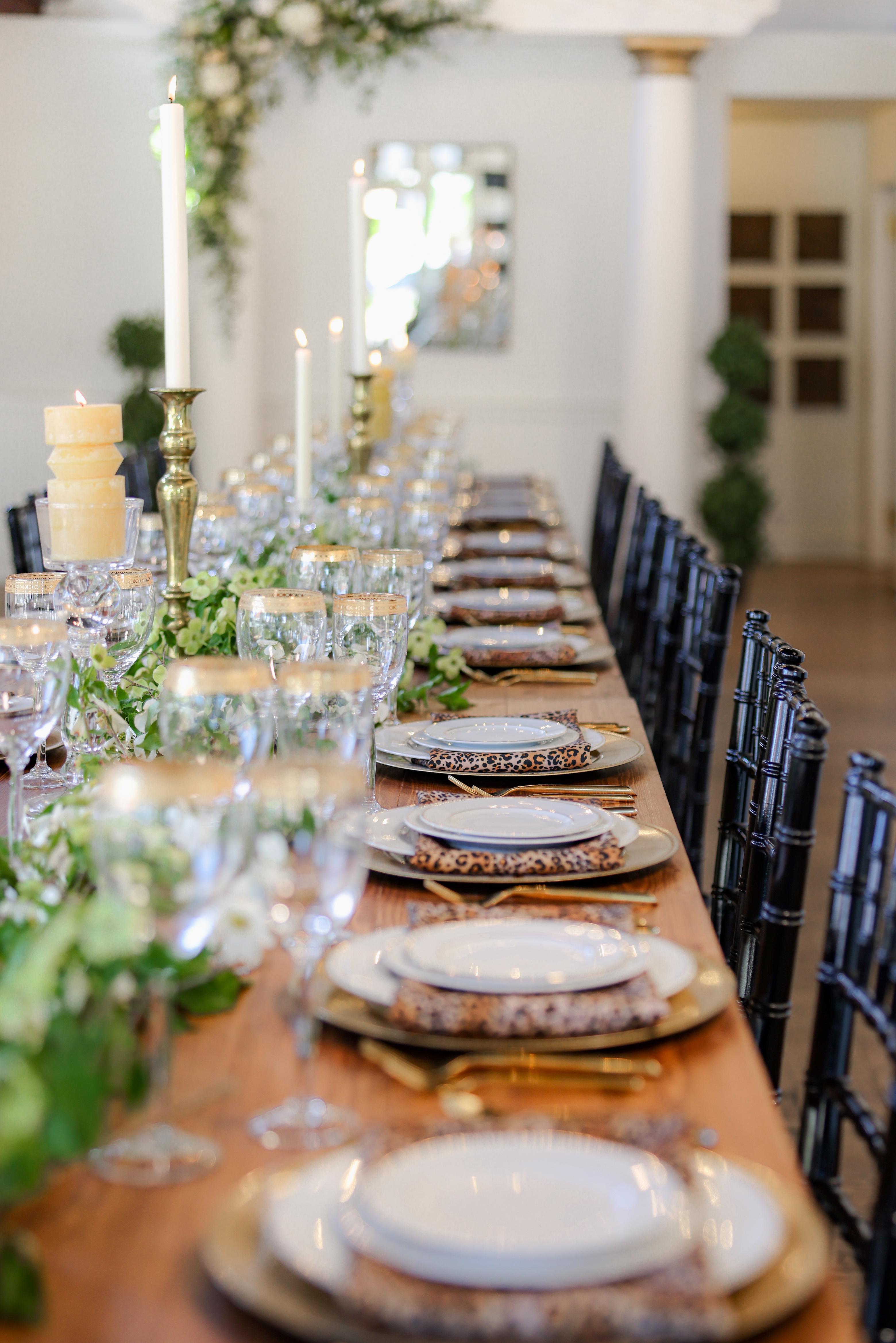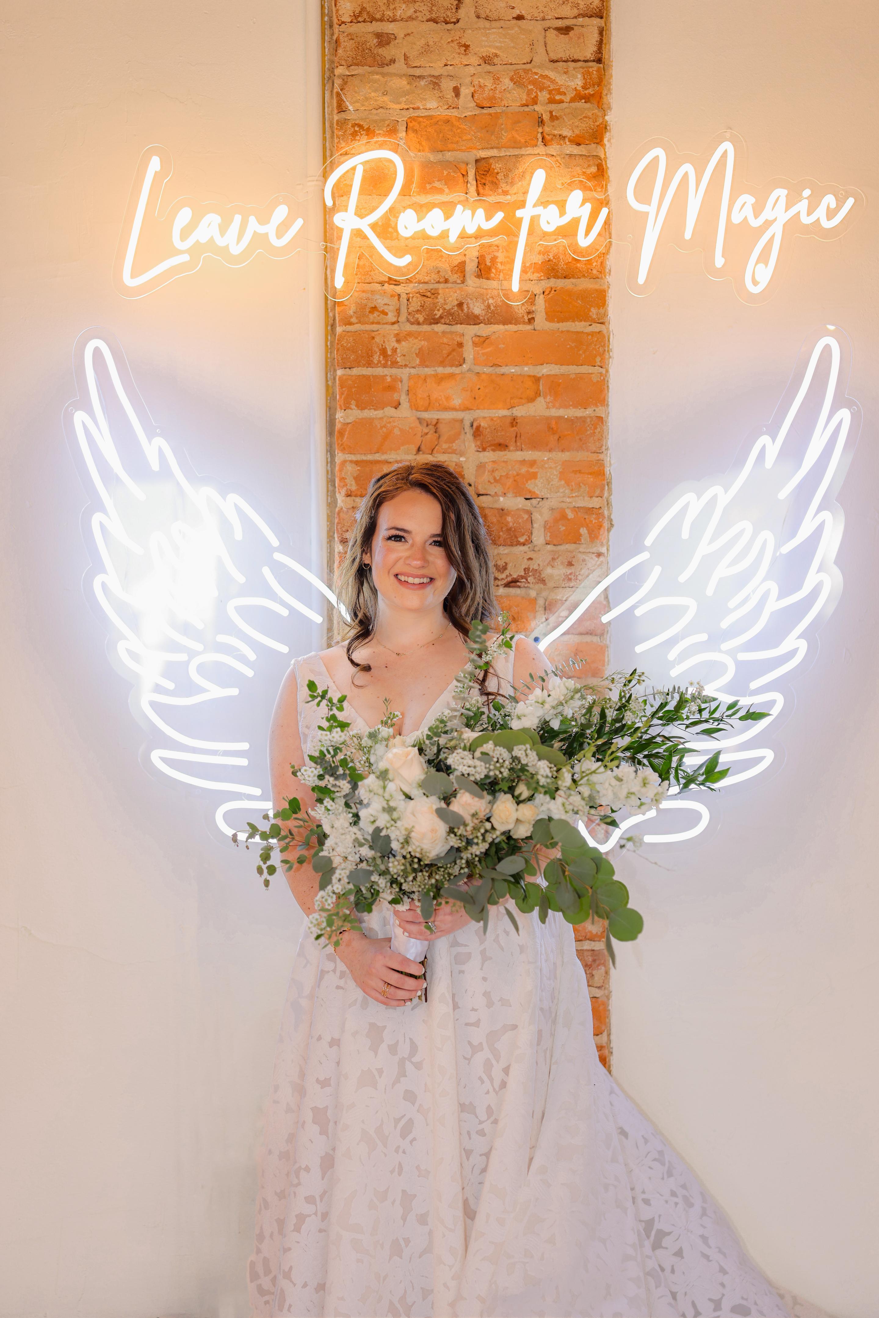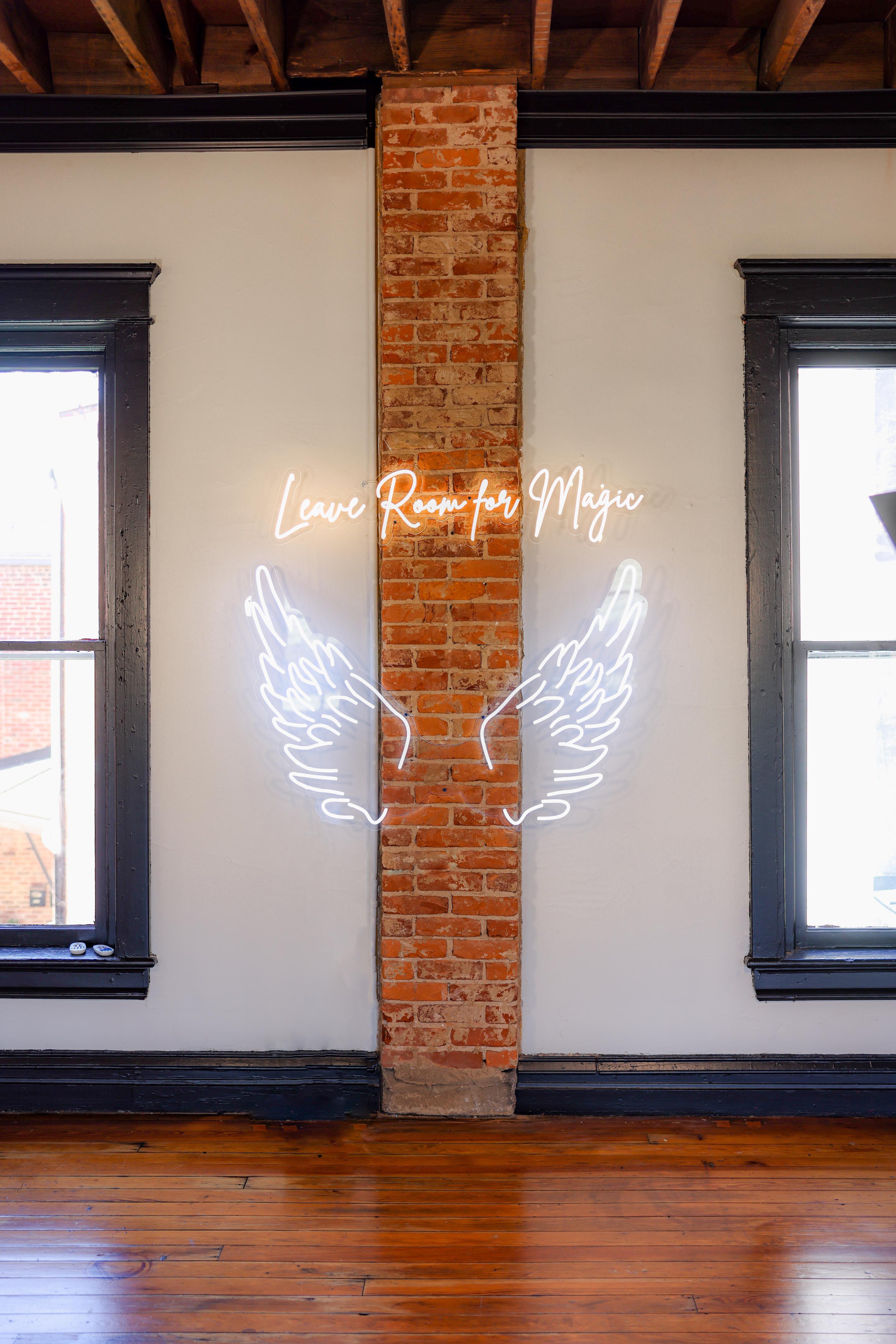 Included in the venue fee are: Five 6' round tables (seat 8-10 guests per table) 50 black Chiavari chairs with cushions Permanent bar Permanent lounge area Permanent photo op wall with neon angel "Leave Room for Magic"