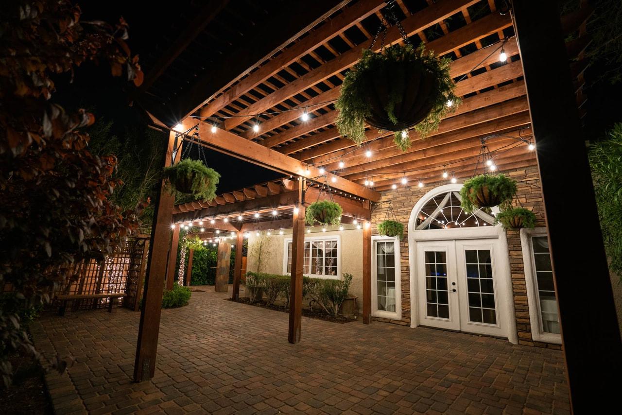 Charming outdoor space. It's beautifully lit at night, creating a warm and inviting ambiance. The space is decorated with a pergola covered in string lights, adding to the cozy atmosphere.