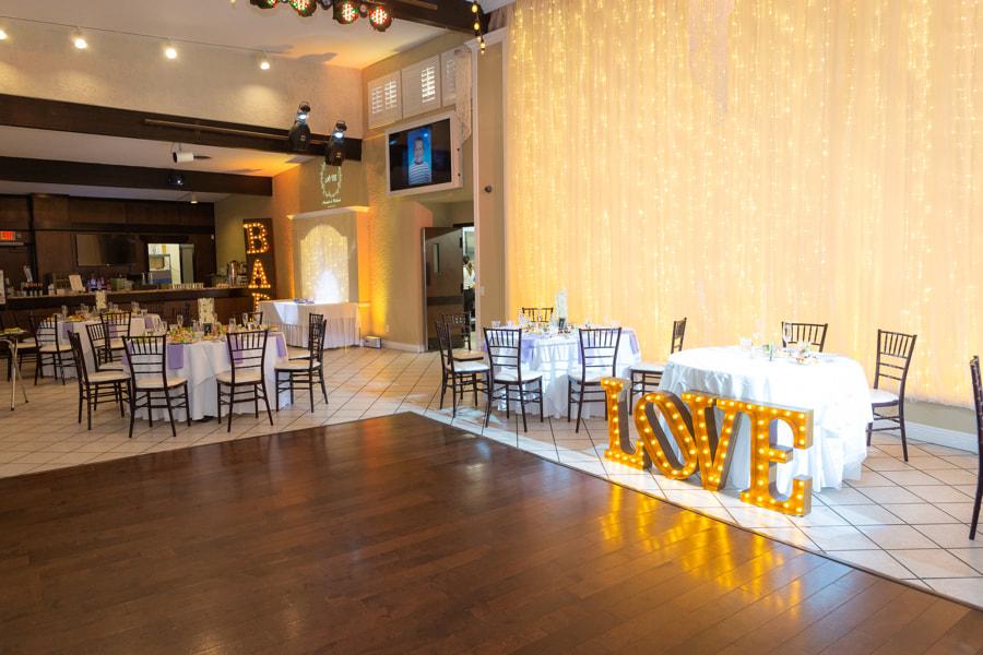 Light and airy with a soft yellow hue and wood beams. This venue can be used for both the ceremony and the reception, depending on your needs.