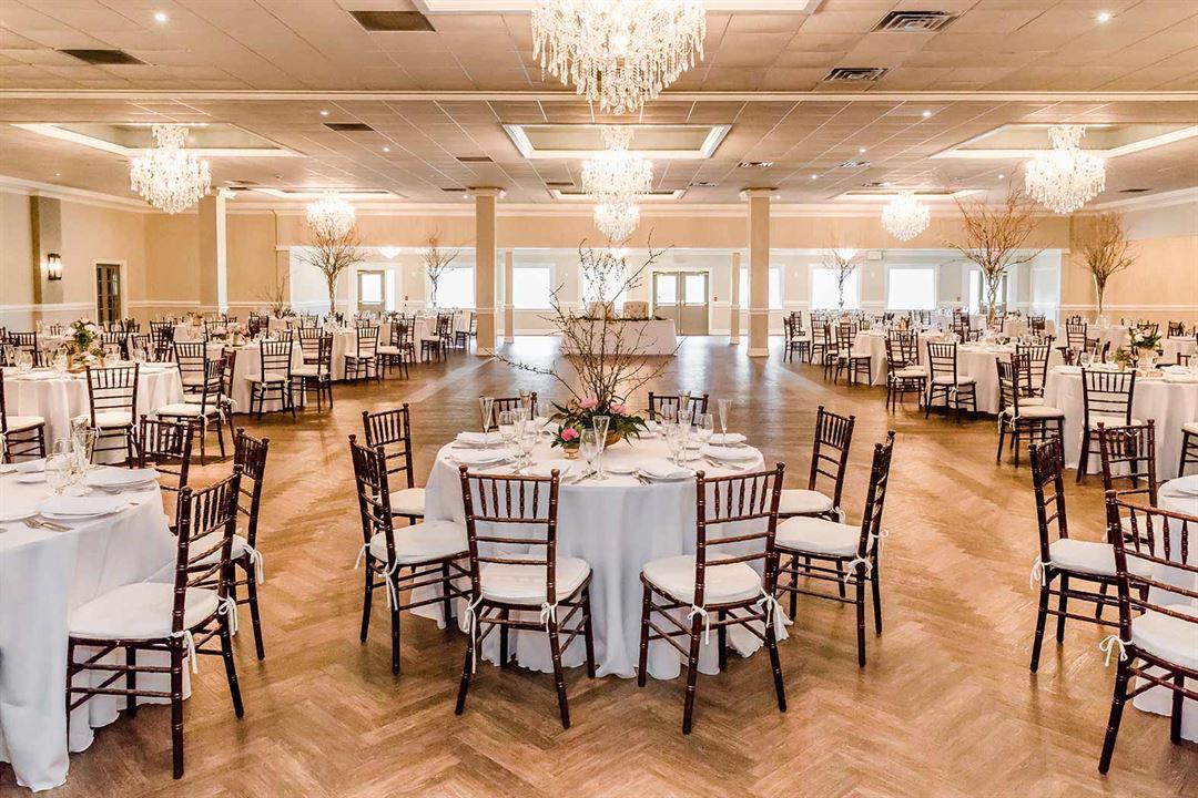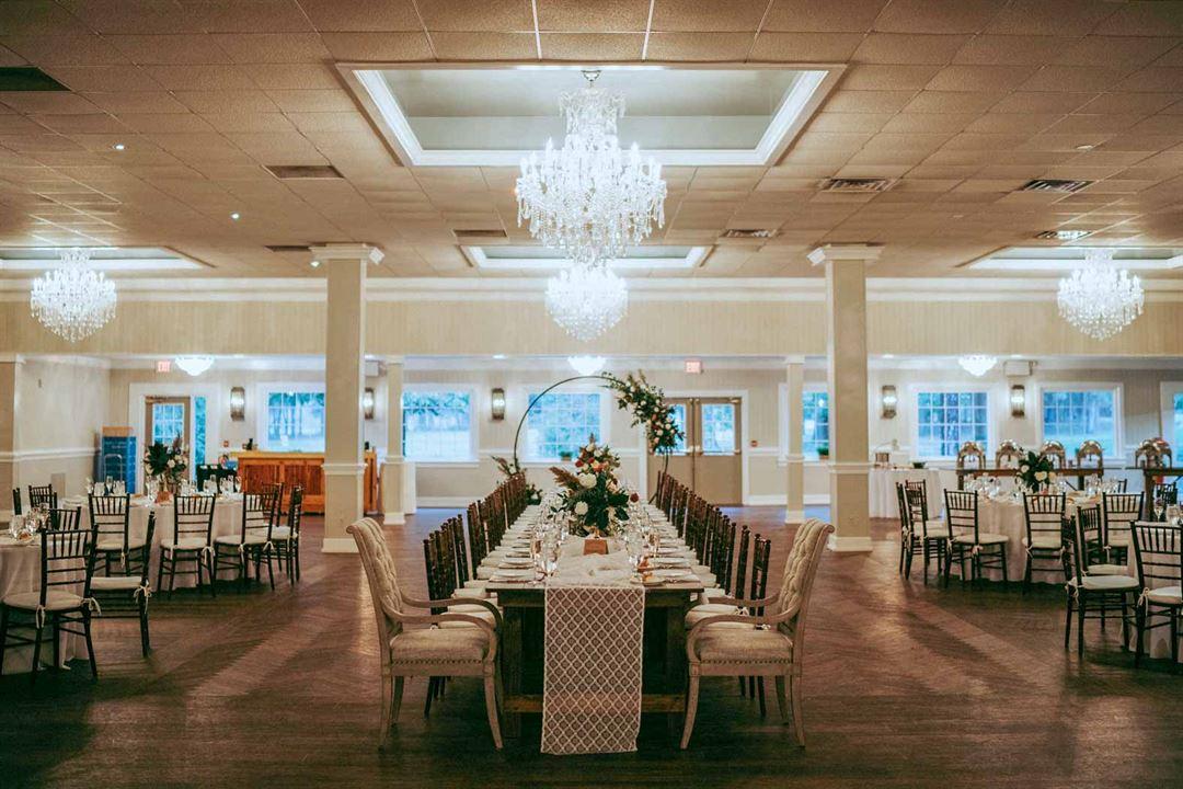 The grand finale is the expansive ballroom with drop-crystal chandeliers set high above rustic wood floors. Chiavari chairs, neutral-toned floor-length linens, and classic white china evoke a simple yet elegant ambiance with a touch of tradition to accommodate your dream wedding style.